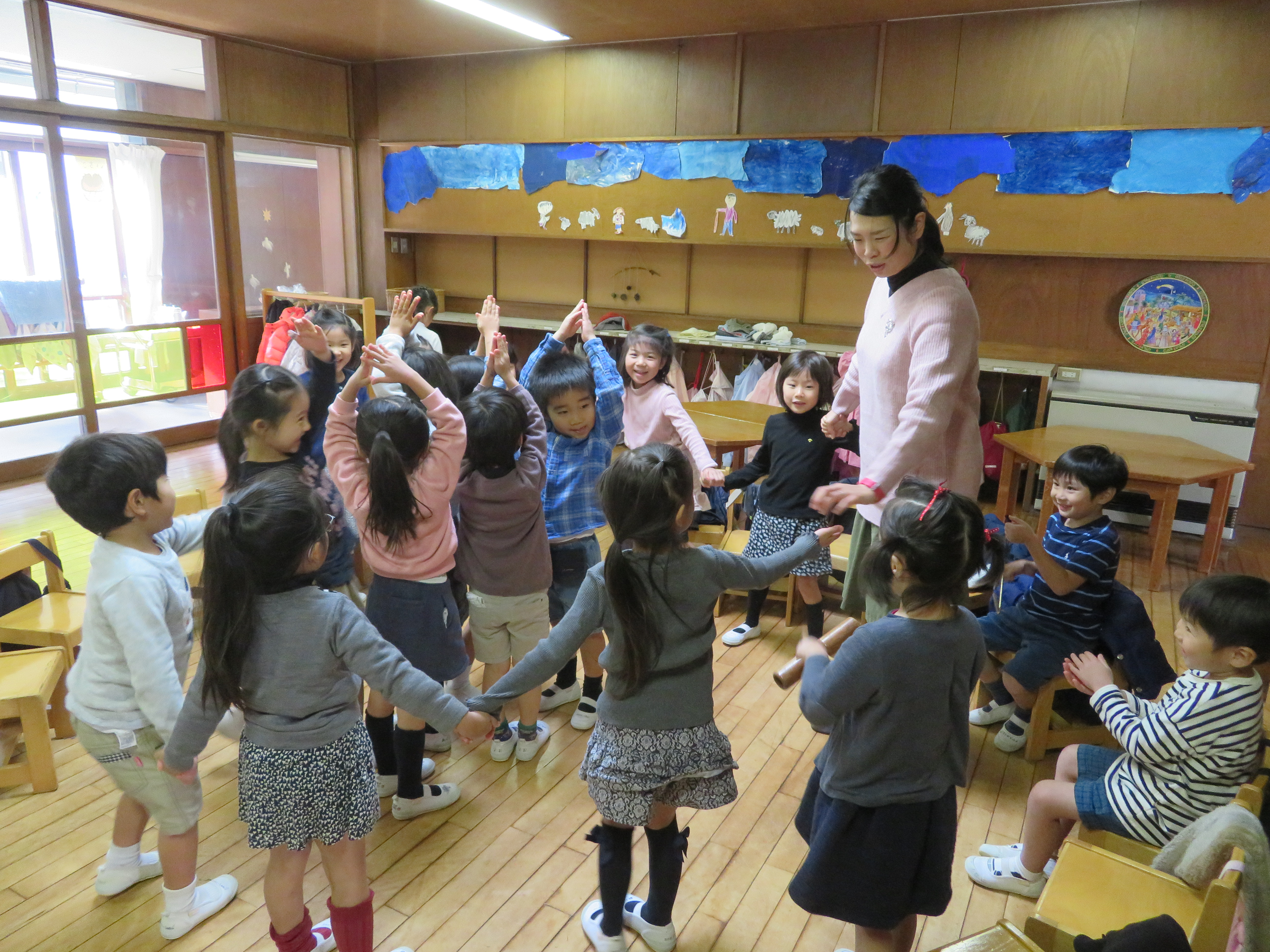 東洋英和幼稚園だより アドヴェント(その2) 部屋でも、みんなでいただくおやつを作ったり クリスマスツリーになった子どもたちの周りで踊ったりして楽しみました お母様方も、フルートやハープ、ハンドベルで子どもたちに素敵な音楽を聴かせてくださったり 手作りカップケーキのおやつも作ってくださり、おいしくいただきました いつもありがとうという感謝の気持ちを込めて、秘密で プレゼントを作りました 年少組は16日に 年中・年長組は17日に親子でアドヴェント礼拝を守り、2学期を終えました 前へ 一覧へ戻る 次へ