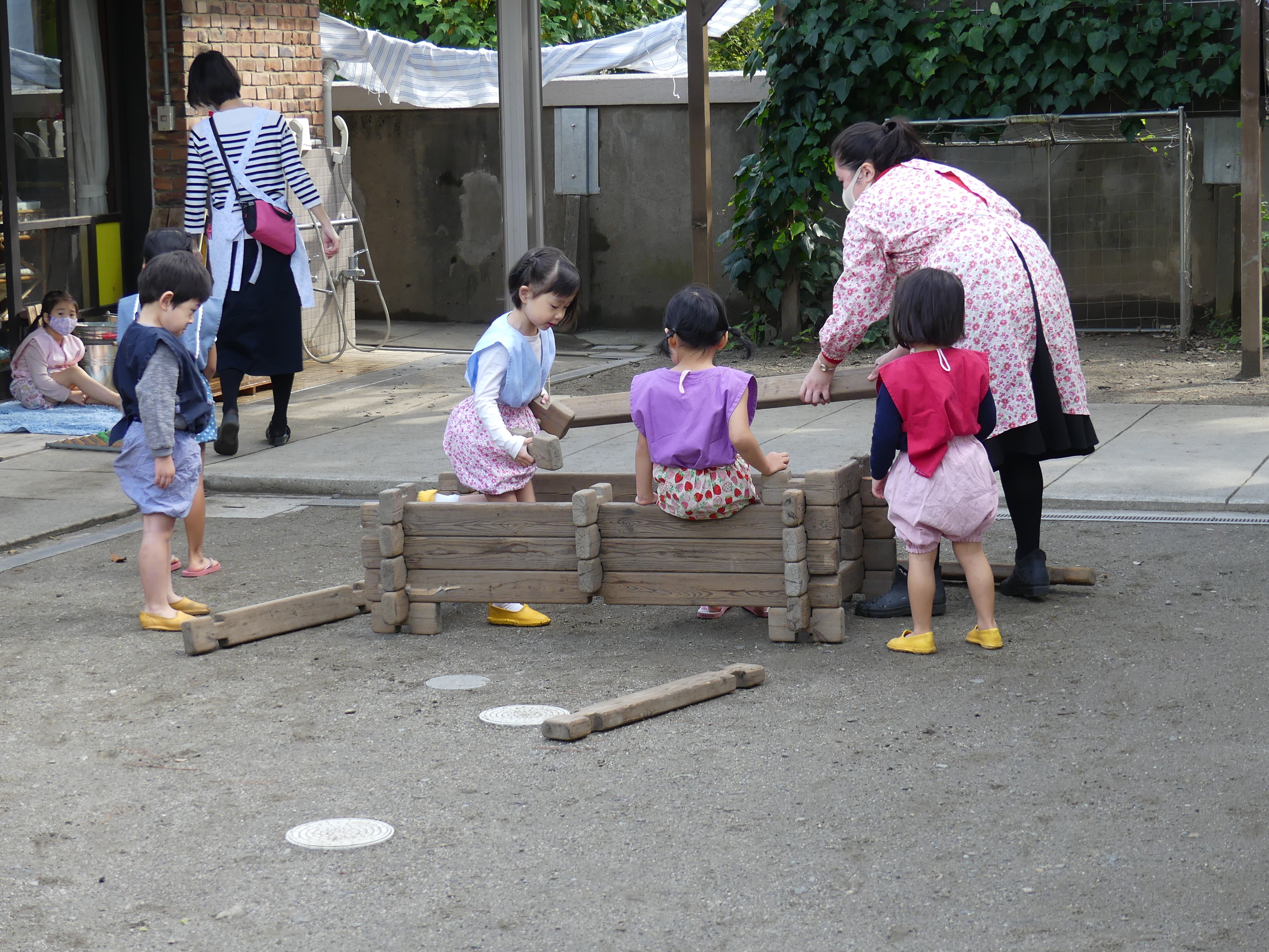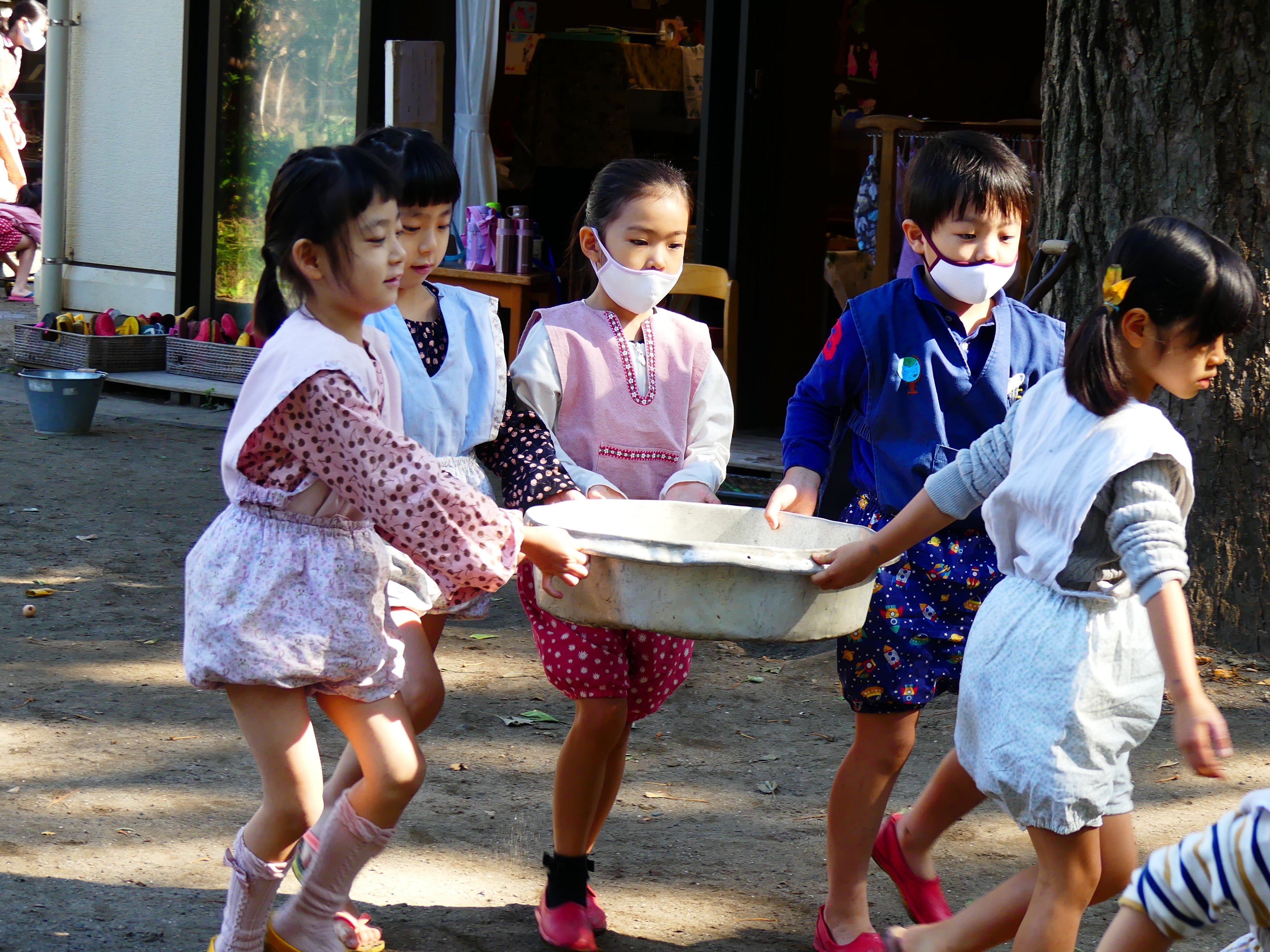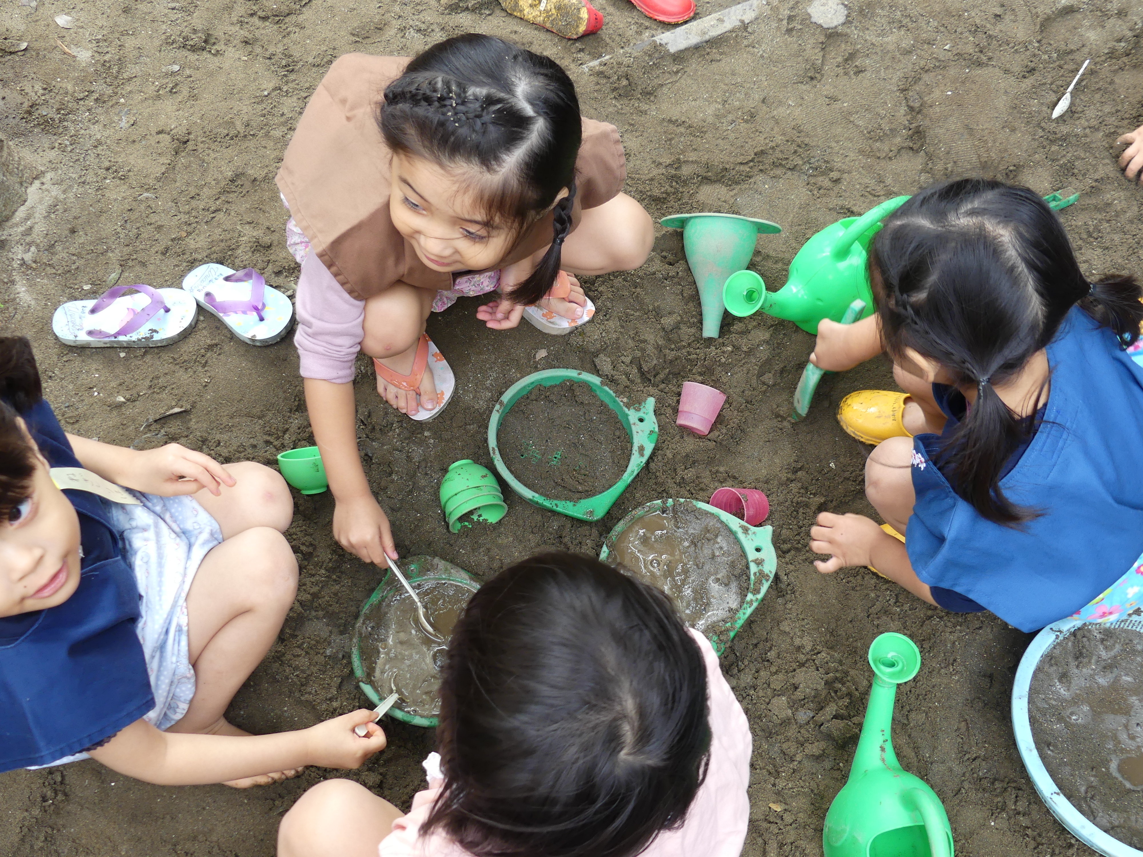 東洋英和幼稚園だより 秋の様子(その2) なにしてるの?と、みている子どもたち チョコレートケーキ作りや おいしいジュースもできました うれしくて走ったり 組み木で消防車を作っています シャベルで穴を掘って、何やら大きな山もできています 遊んだ後は雑巾を絞って、星のいえの大掃除 砂場の道具を洗った水は、みんなで運びます 前へ 一覧へ戻る 次へ