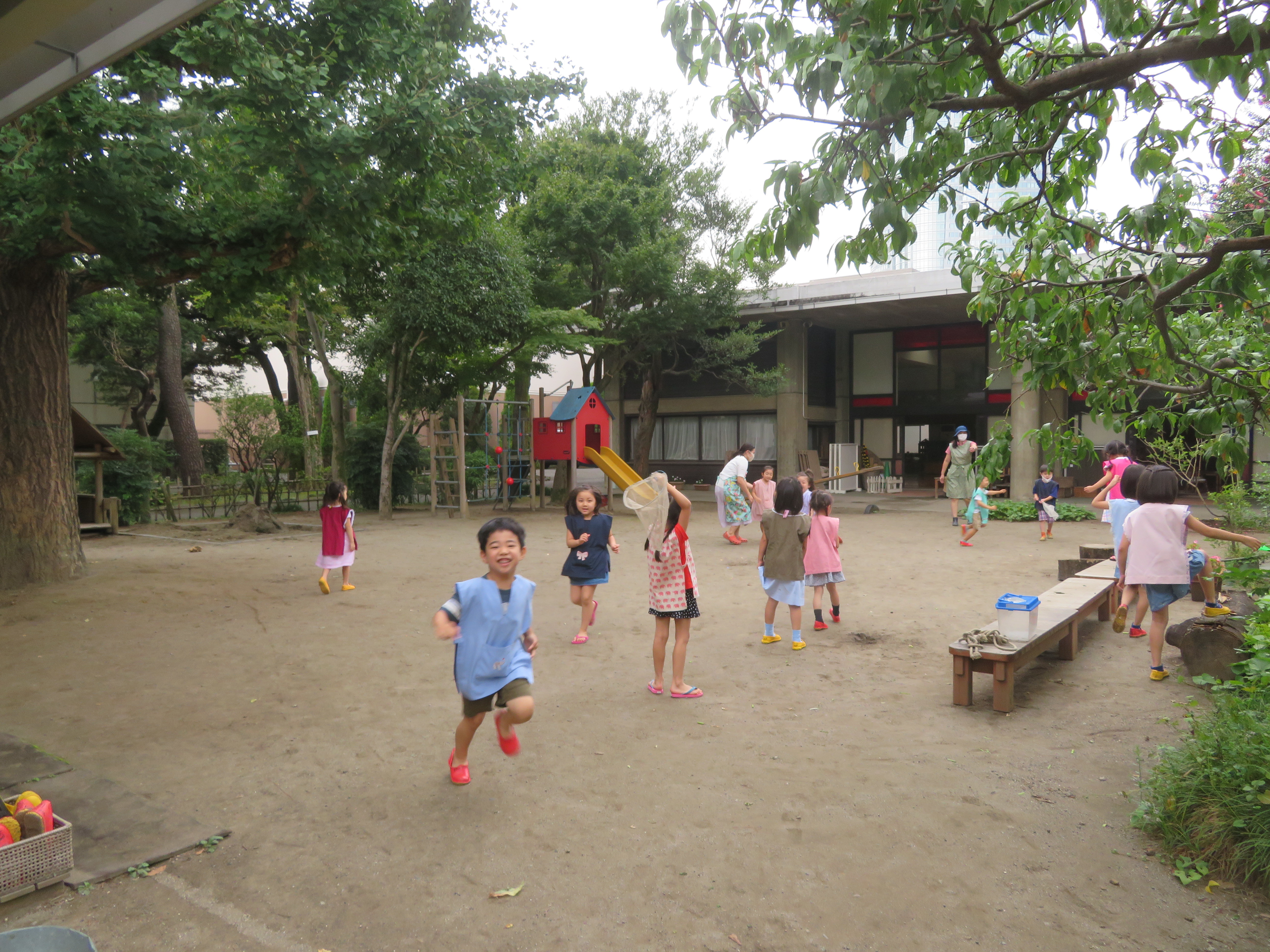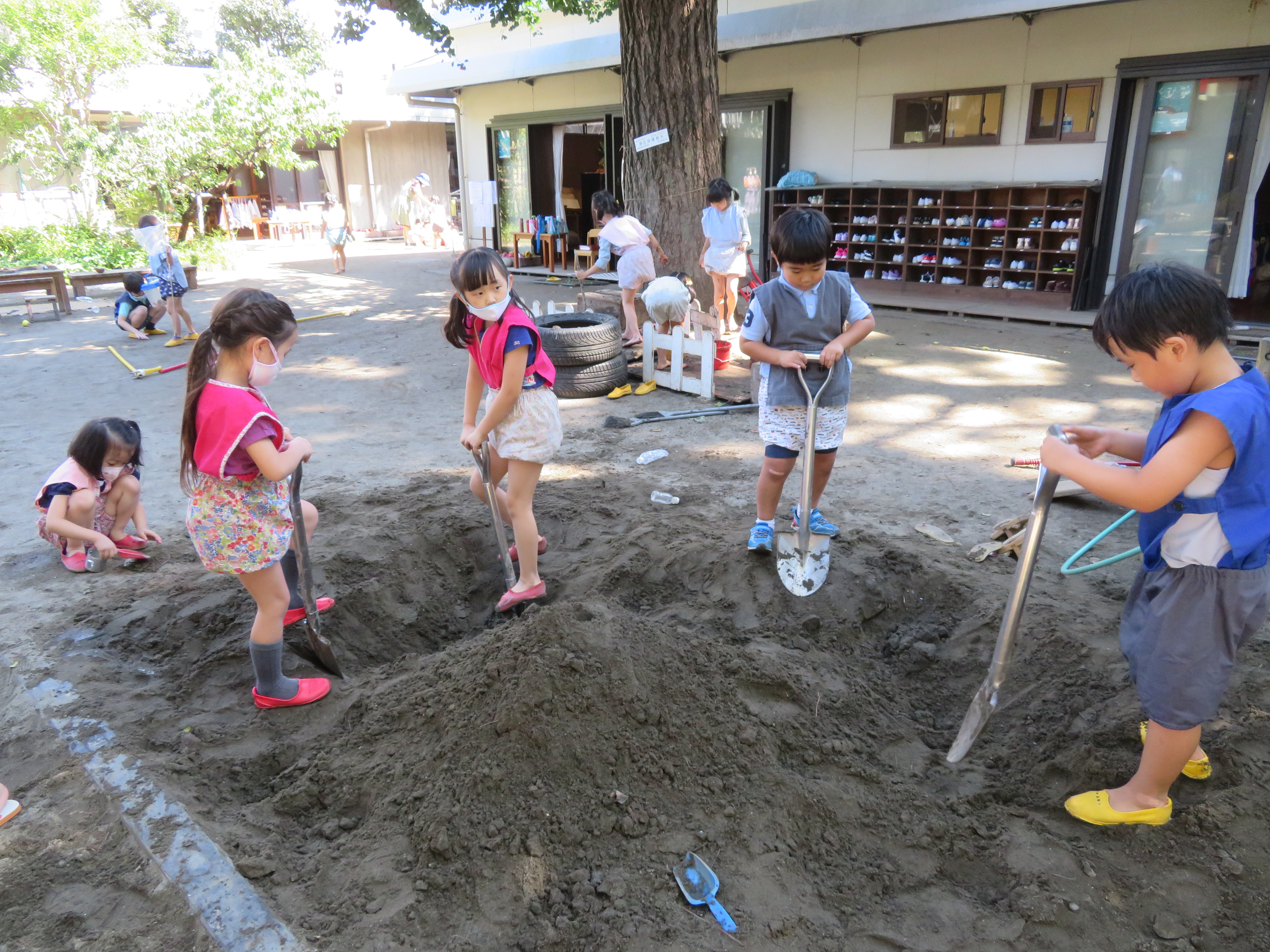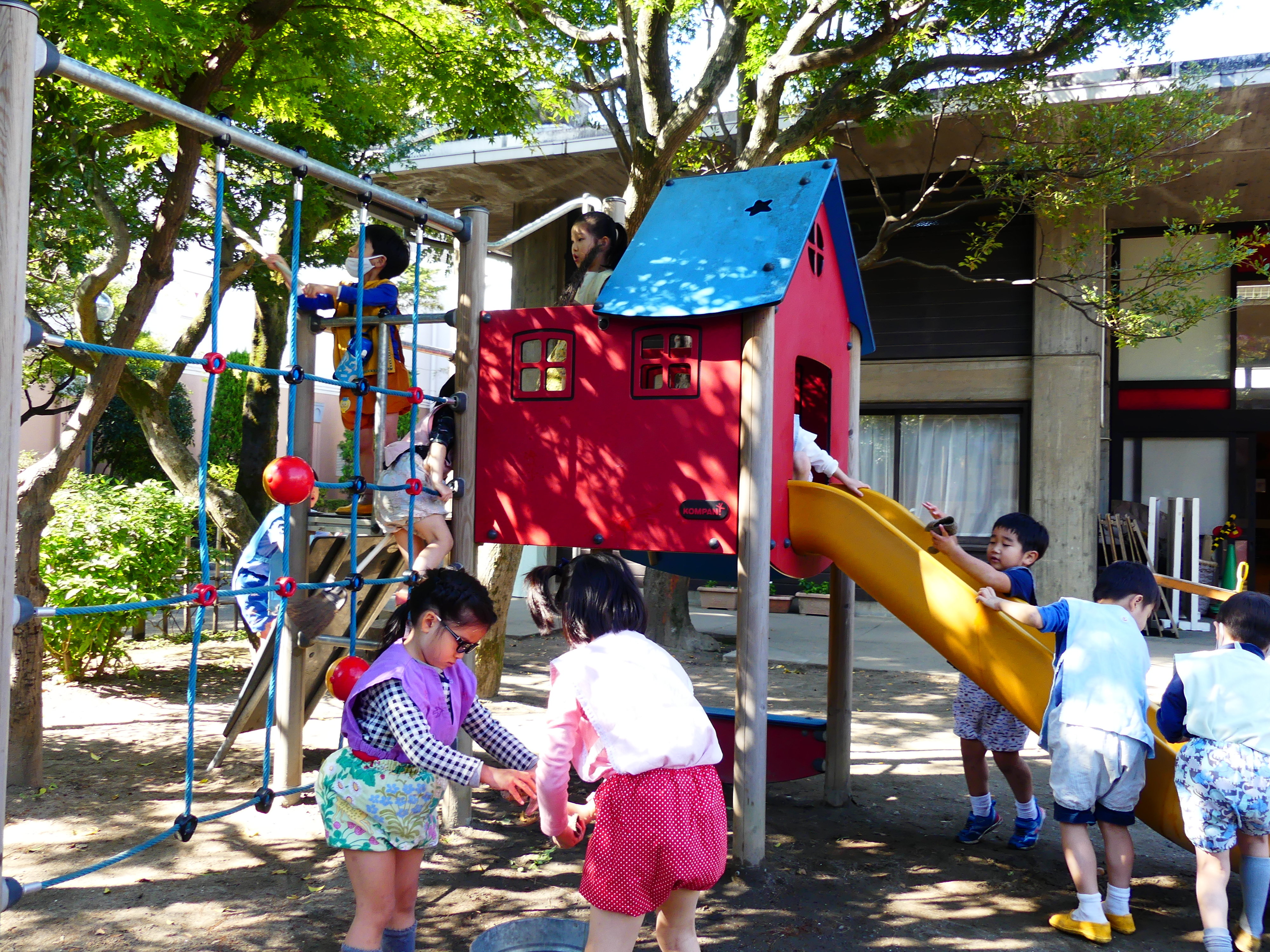 東洋英和幼稚園だより 秋の様子(その2) なにしてるの?と、みている子どもたち チョコレートケーキ作りや おいしいジュースもできました うれしくて走ったり 組み木で消防車を作っています シャベルで穴を掘って、何やら大きな山もできています 遊んだ後は雑巾を絞って、星のいえの大掃除 砂場の道具を洗った水は、みんなで運びます 前へ 一覧へ戻る 次へ