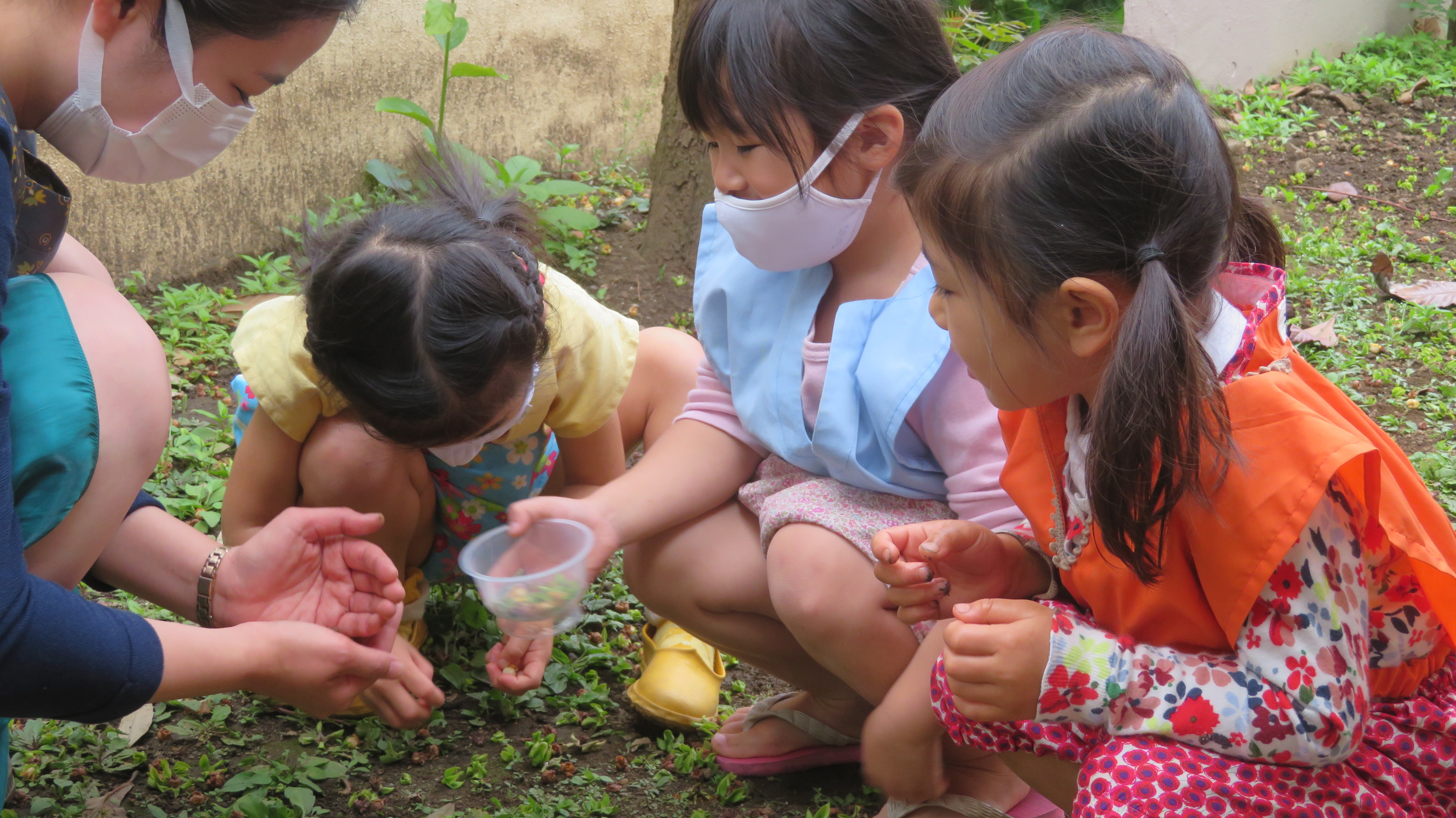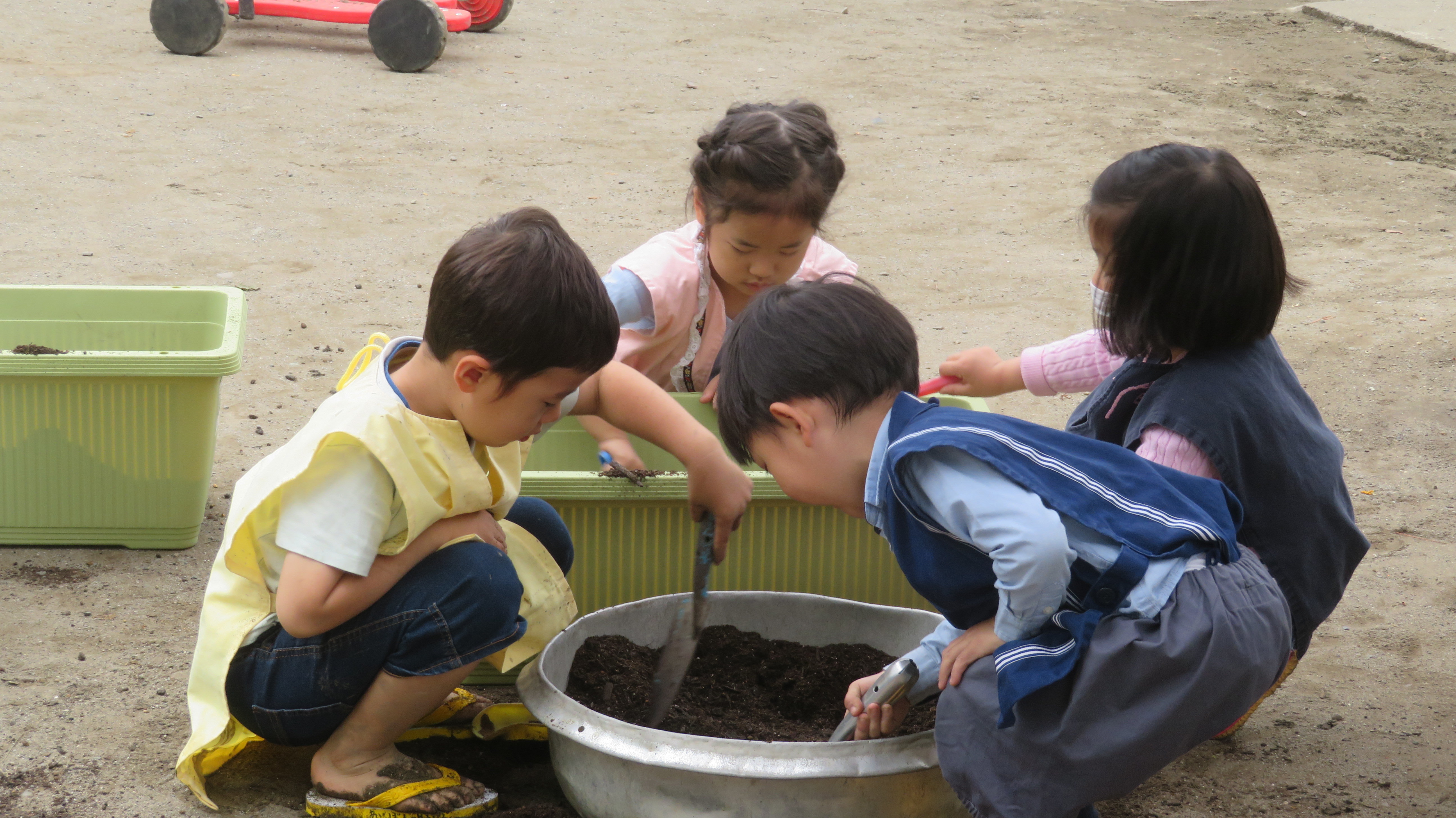 東洋英和幼稚園だより 表の庭の様子 洗濯物を干したり、お料理をしたり、あぁ忙しい… ポップコーンのような柿の花を集めています。 「茶色いのは焦げちゃってるのよ」 からだ全体を使って砂と水の感触を楽しみます。 土をやわらかくして、トマトの苗を植える準備をしています。 前へ 一覧へ戻る 次へ