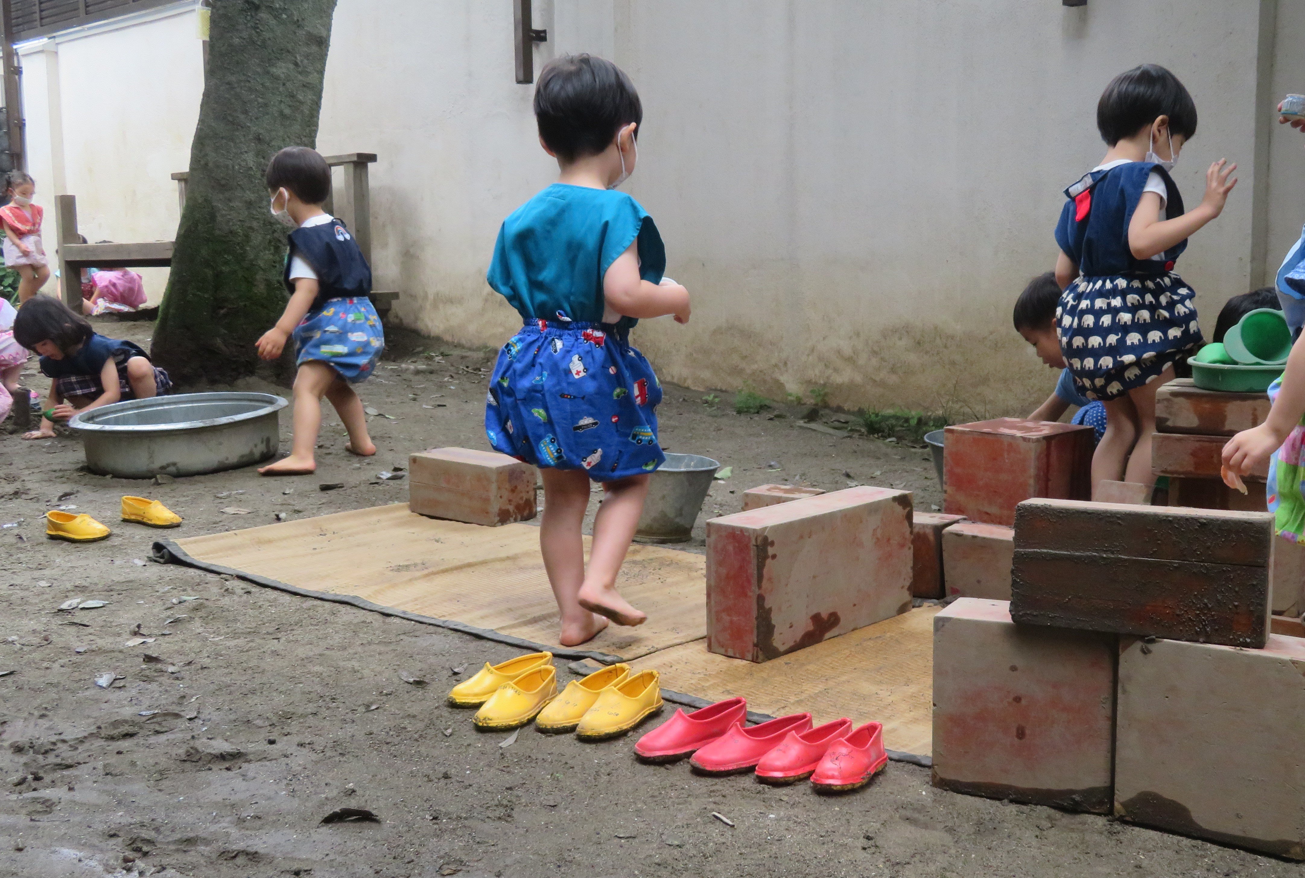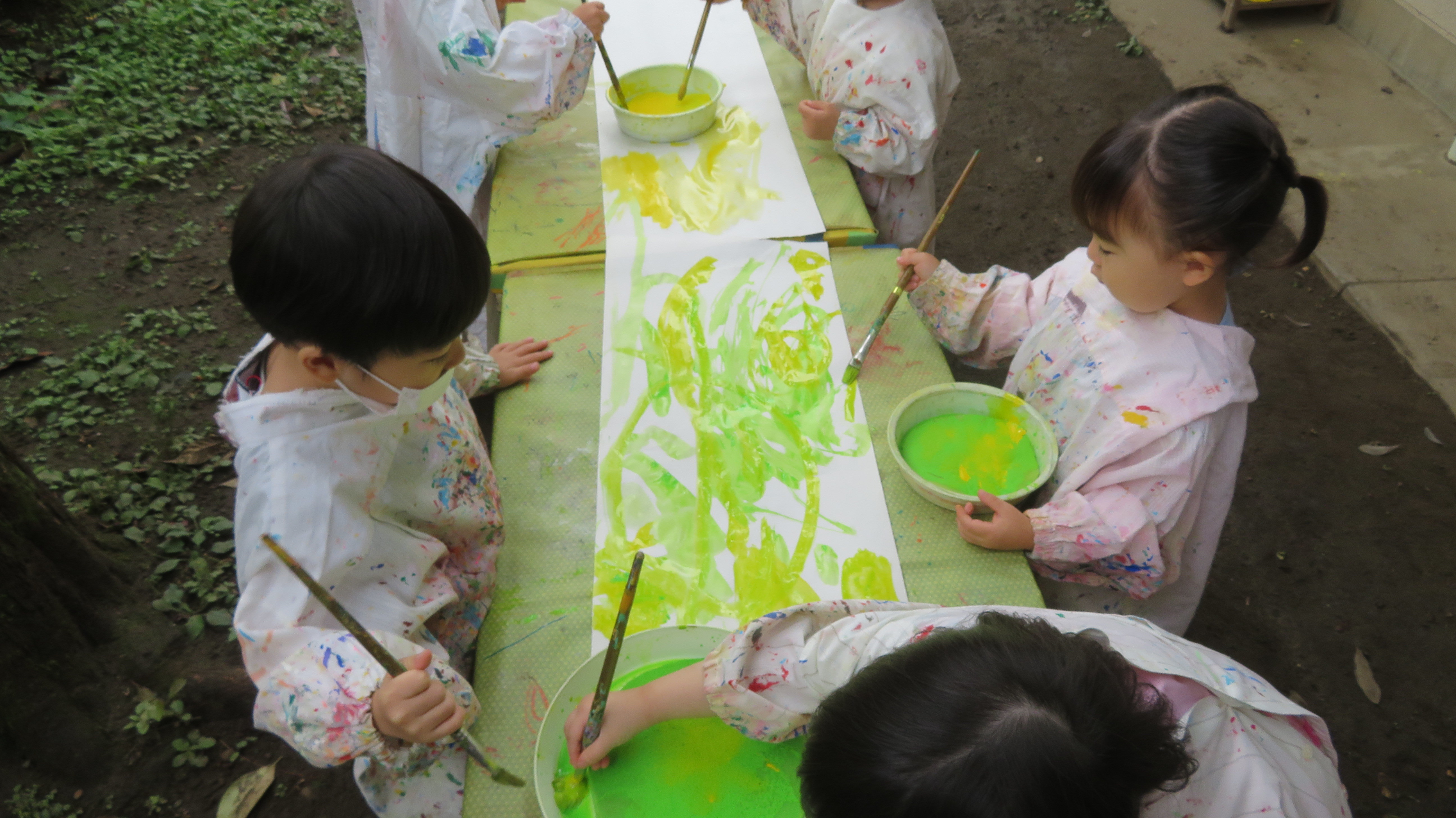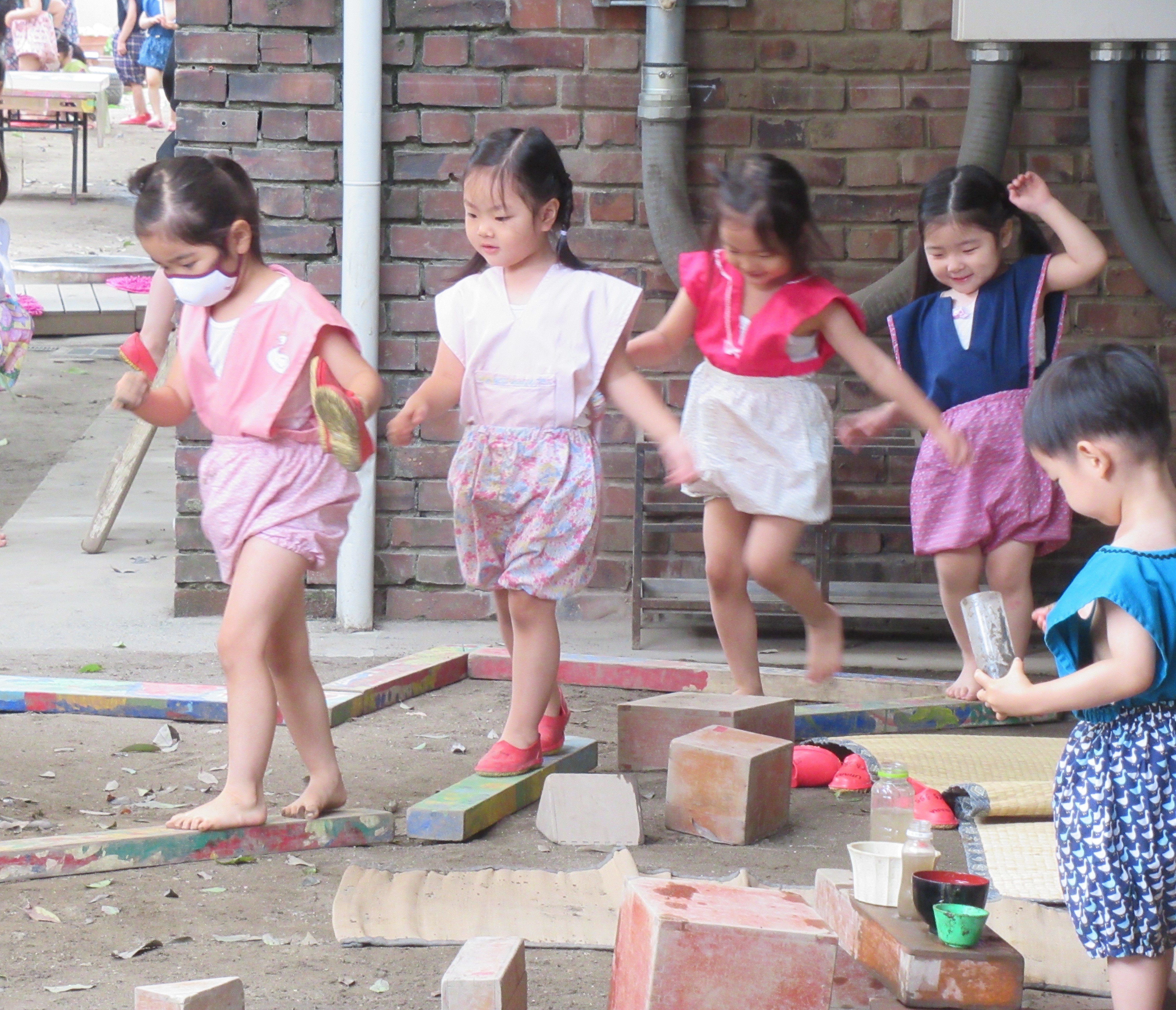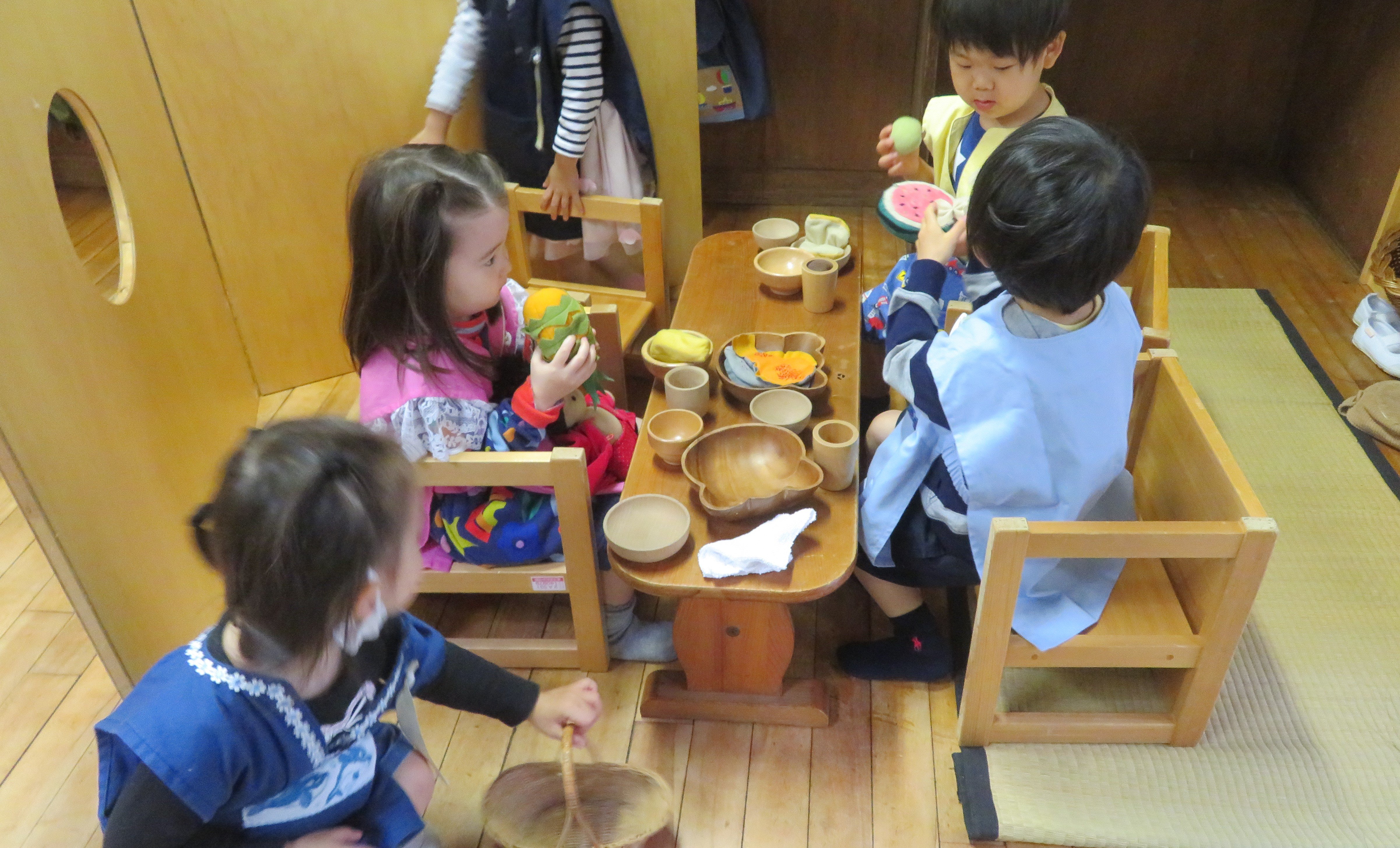 東洋英和幼稚園だより 年少組の子どもたち ある日、裏庭に出てみると木の幹に不思議なものが出ていました。きのこかな? ござを敷いて積み木を並べて、お店屋さんが始まりました。 長細い板や積み木で作った橋を渡ります。 手のひらとスポンジを絵筆に持ち替えて、長い紙にきれいな色が広がっていきます。 「いただきます」ごちそうを並べてままごとが始まりました。 前へ 一覧へ戻る 次へ