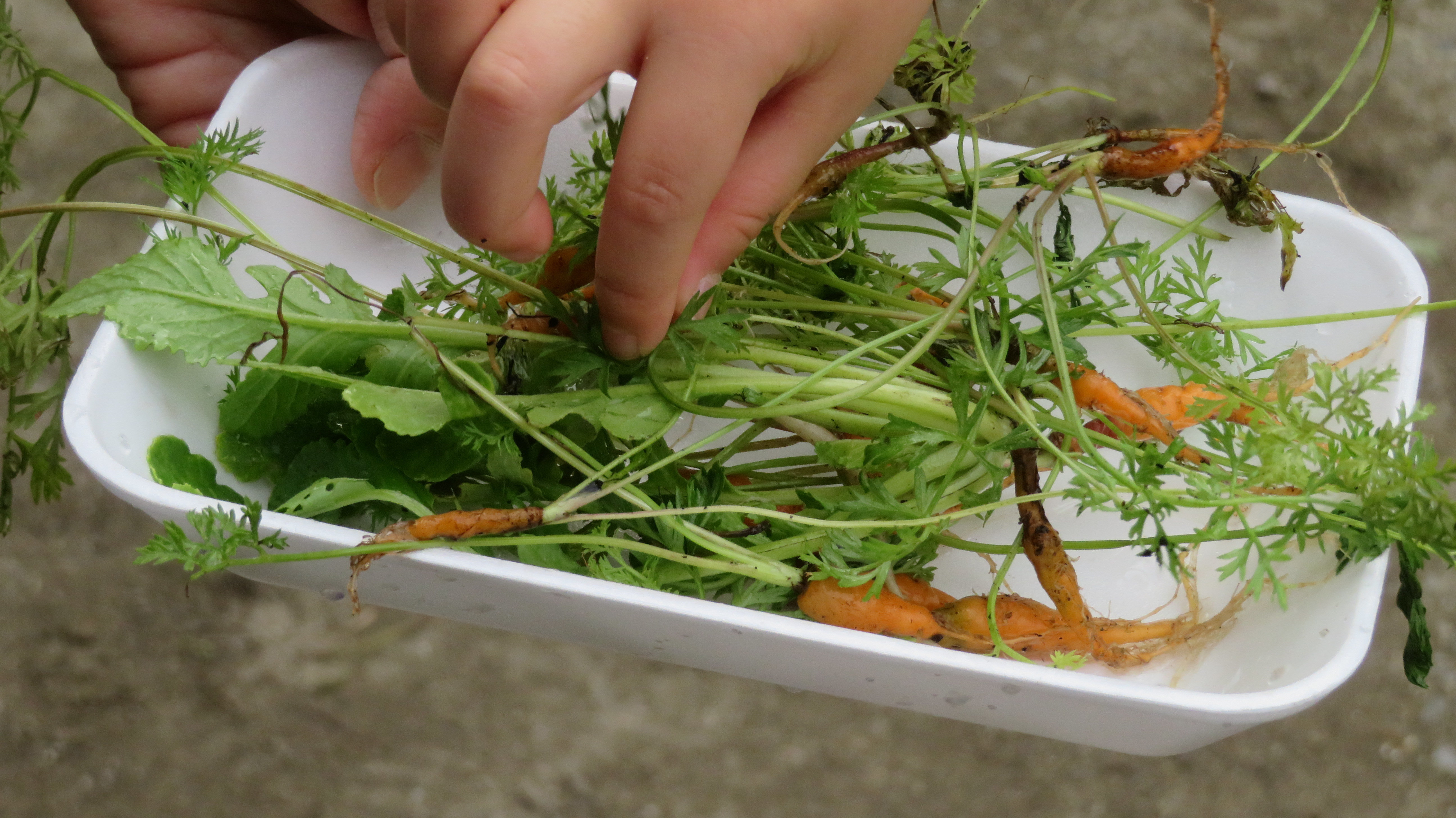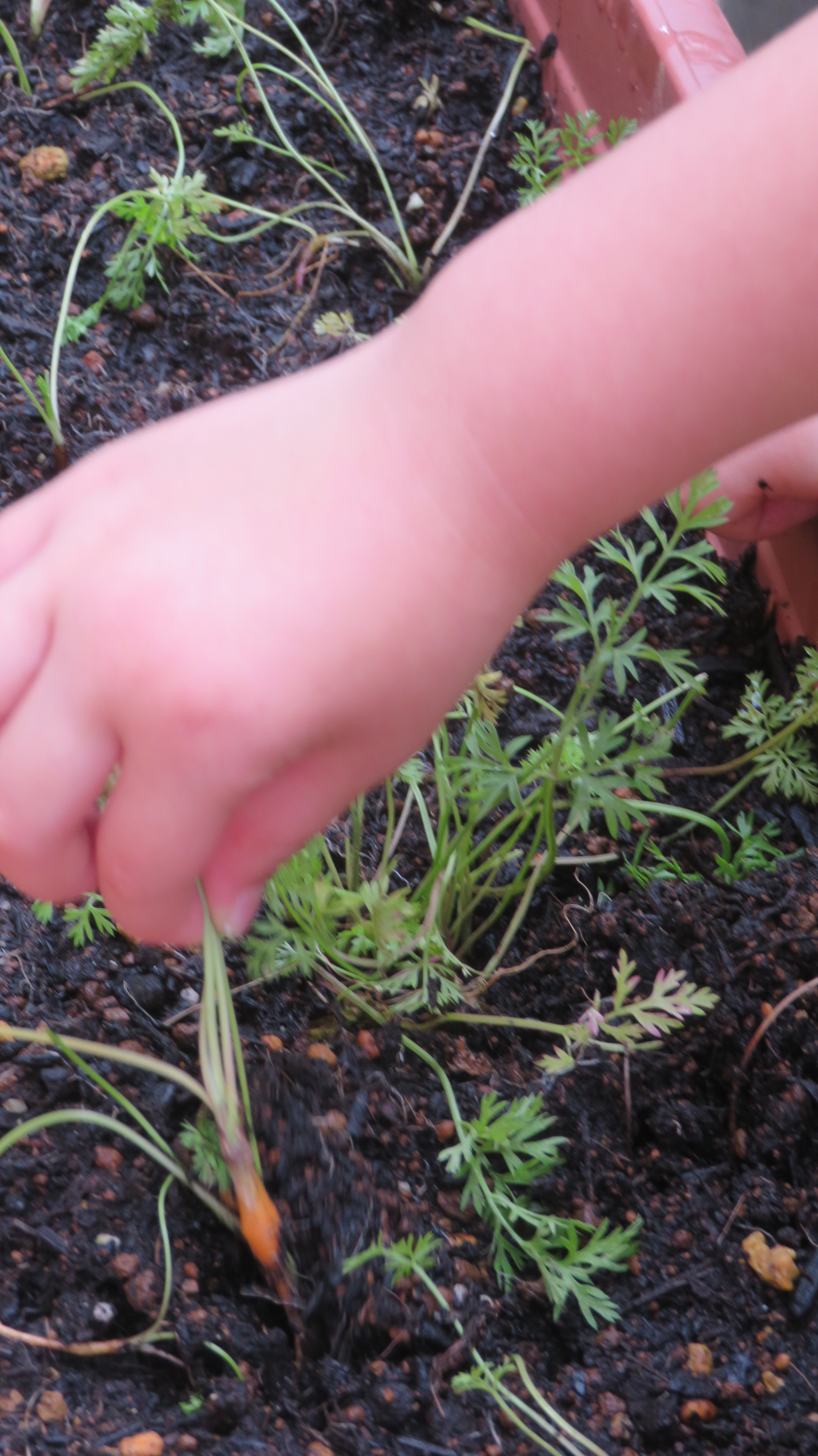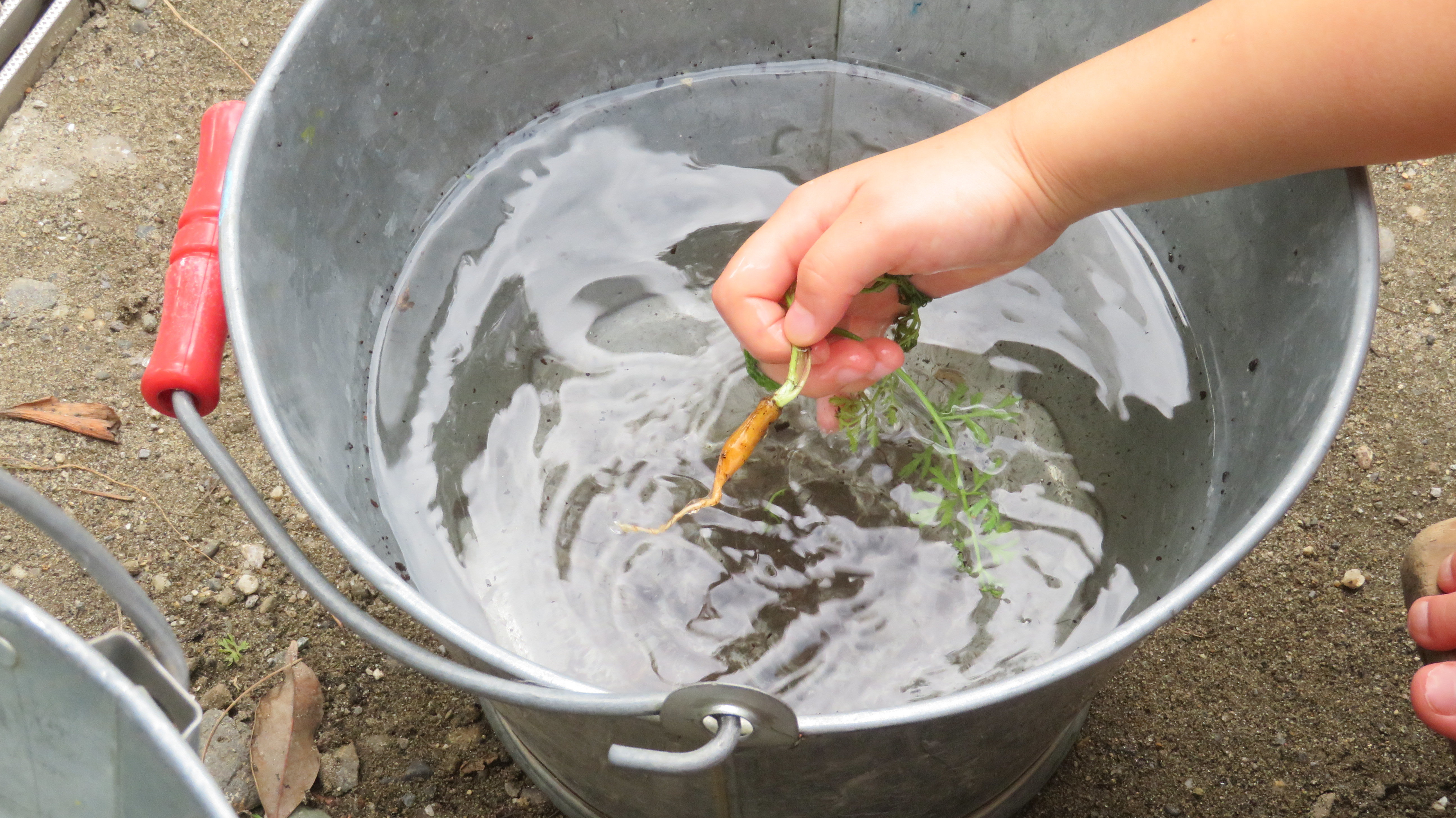 東洋英和幼稚園だより にんじんその後 夏前に間引きしたにんじんが少し大きくなりました そーっと引っ張って抜いてみます バケツに水を運んできて、じゃぶじゃぶと洗って土を落としました 細いけれどもりっぱな「にんじん」です 前へ 一覧へ戻る 次へ