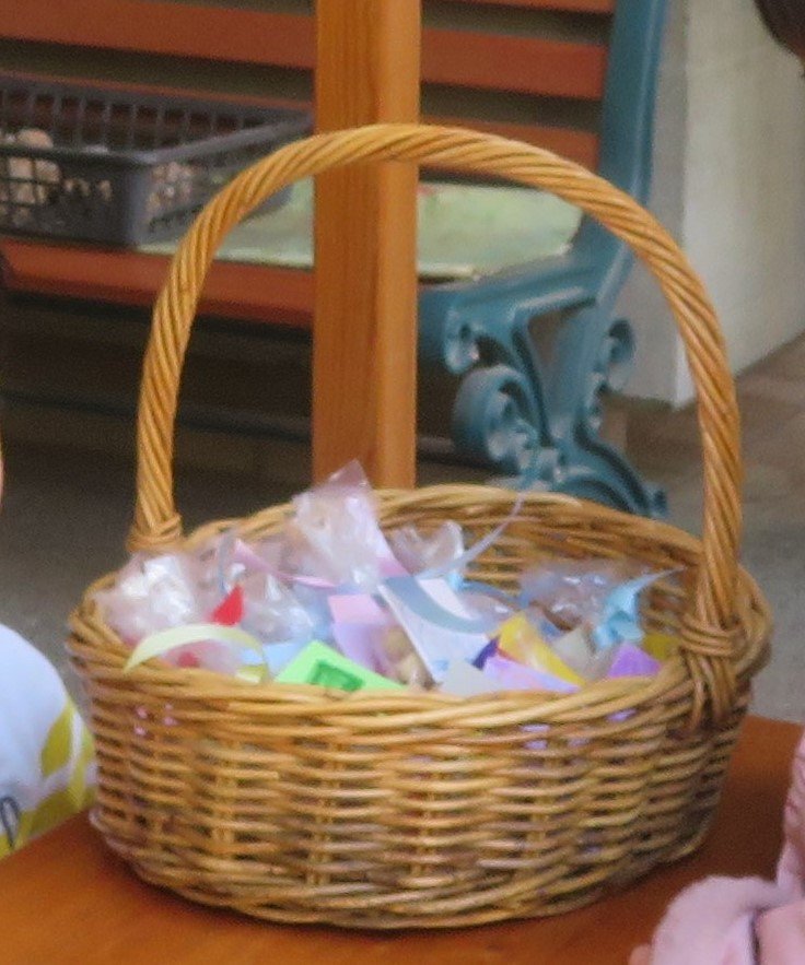 おいしかった銀杏をみんなに食べていただこうと、袋に入れて、リボンをつけて、かわいいカードを描いて用意しました