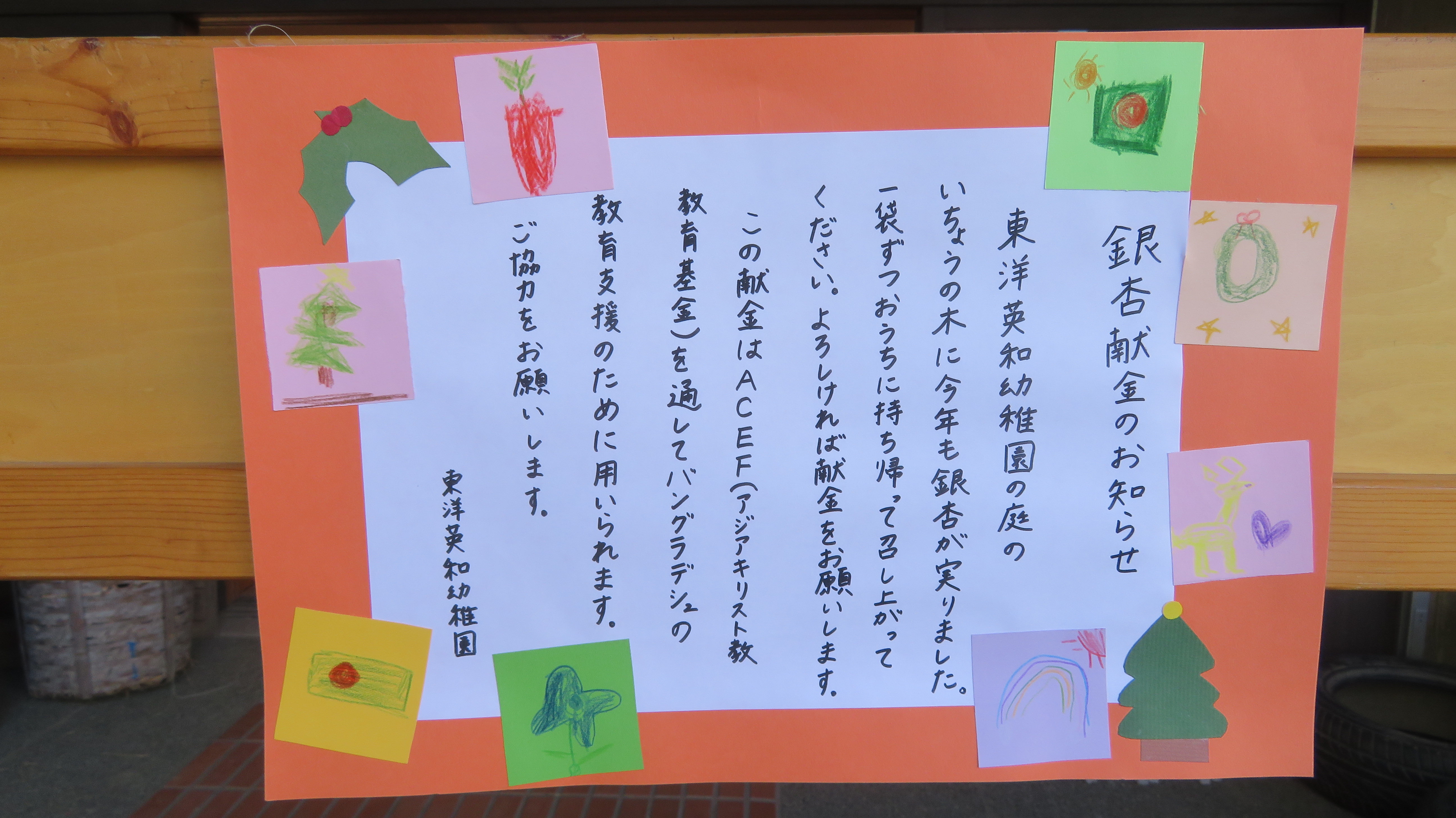 おいしい銀杏を食べていただいて、そのうれしい気持ちを献金としてお捧げいただくことにしました。バングラデシュの子ども達にこの気持ちが伝わりますように