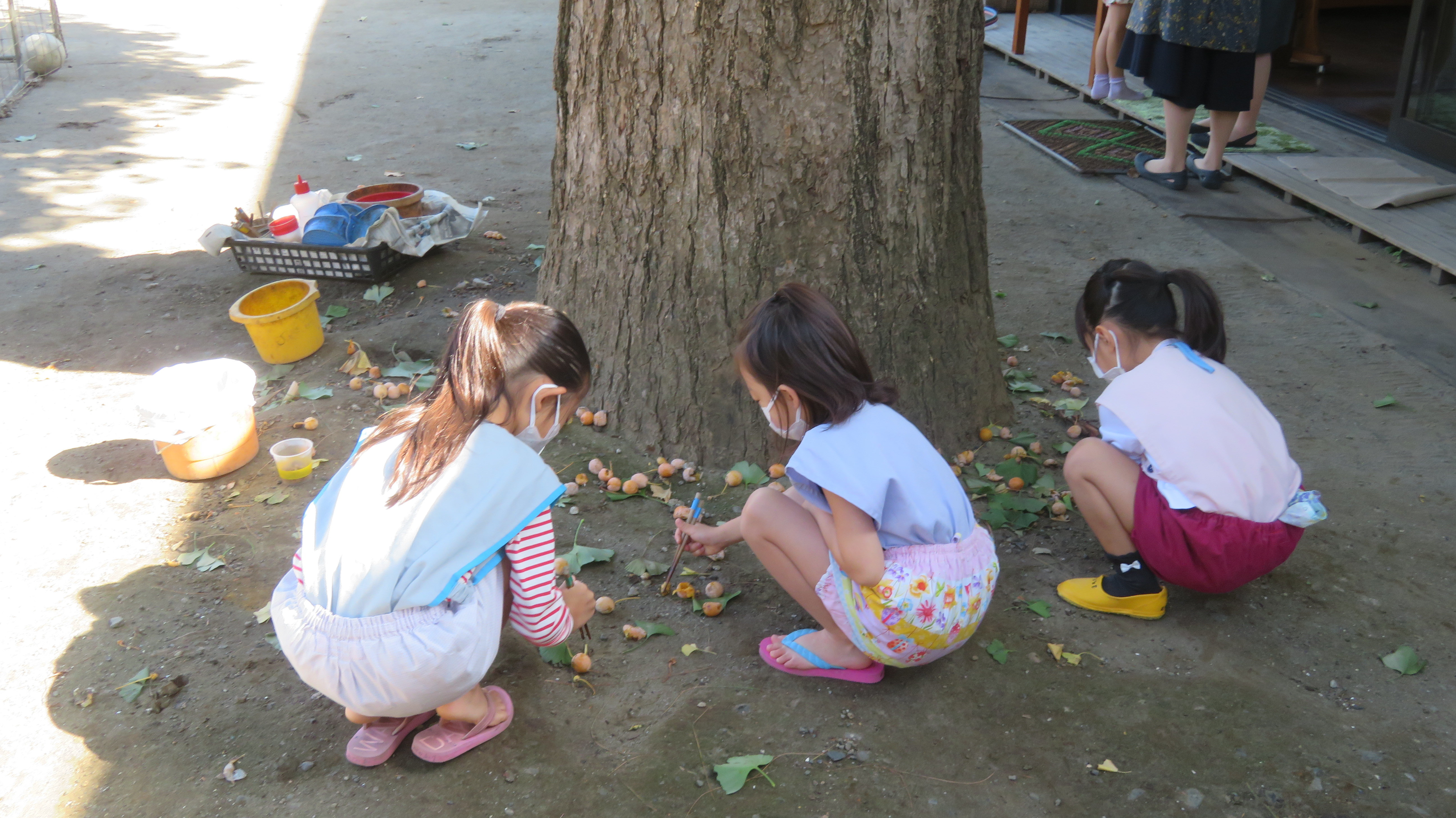 ぽたぽたと落ちてくる銀杏をおはしで一粒ずつ拾っています