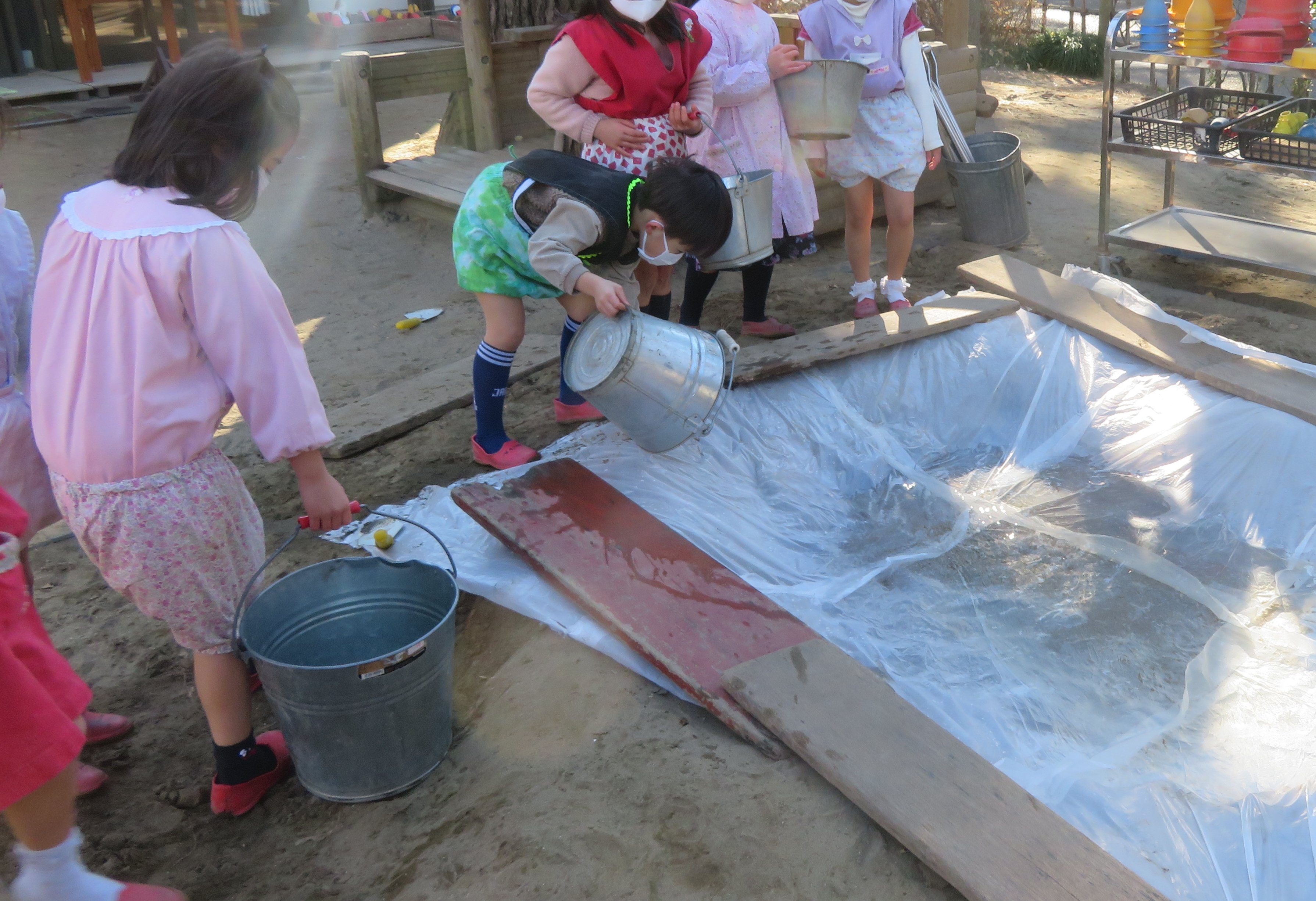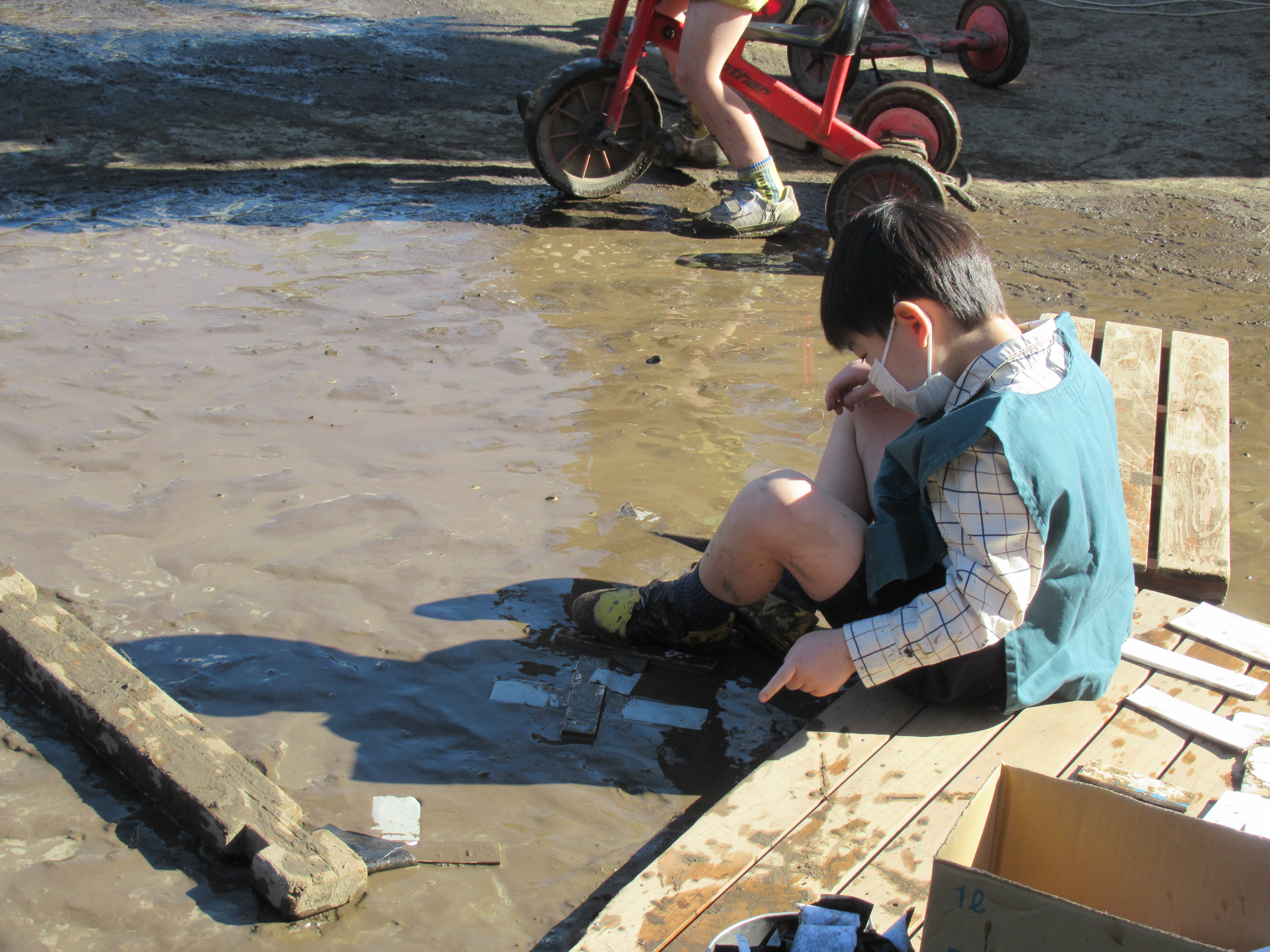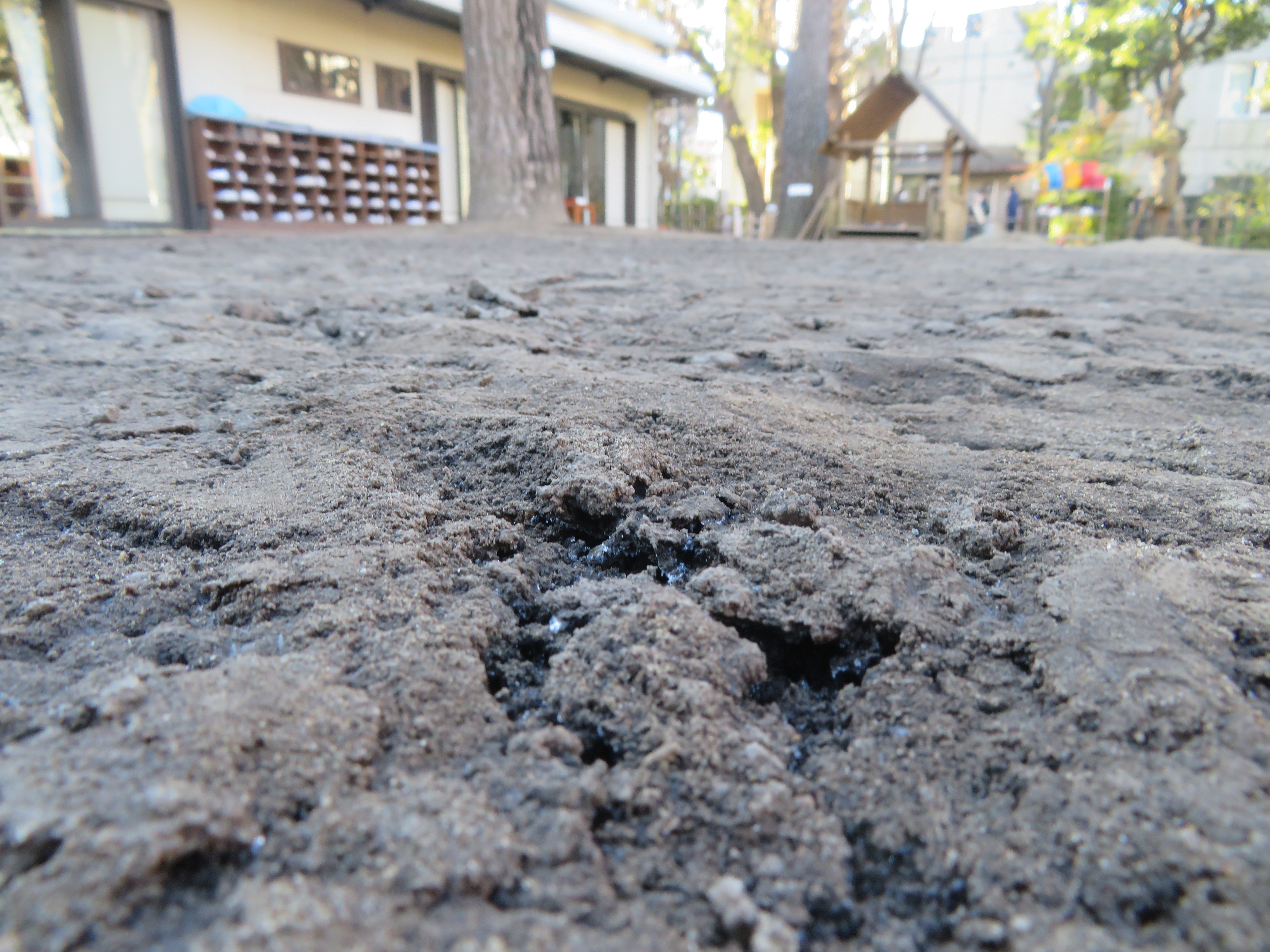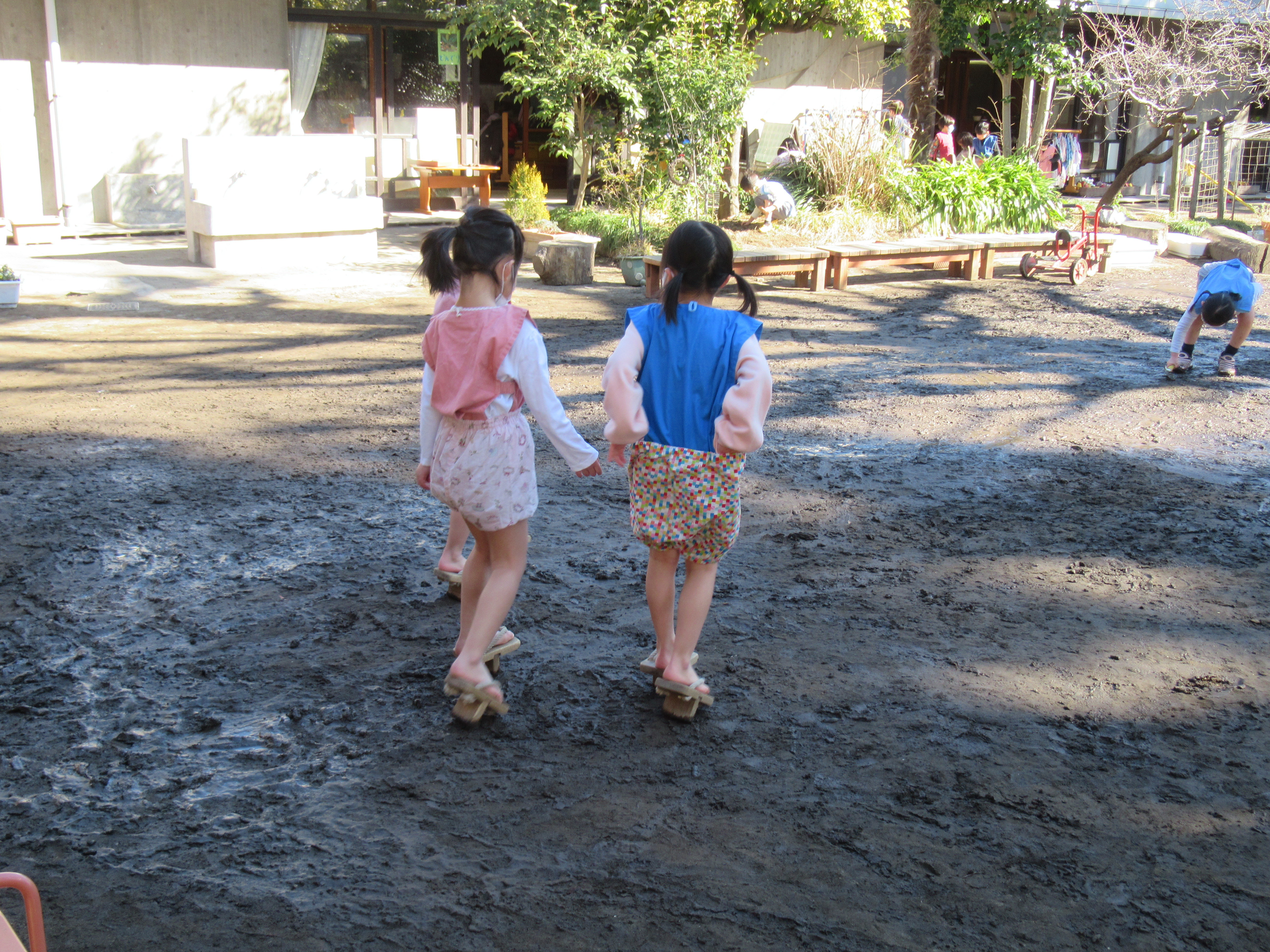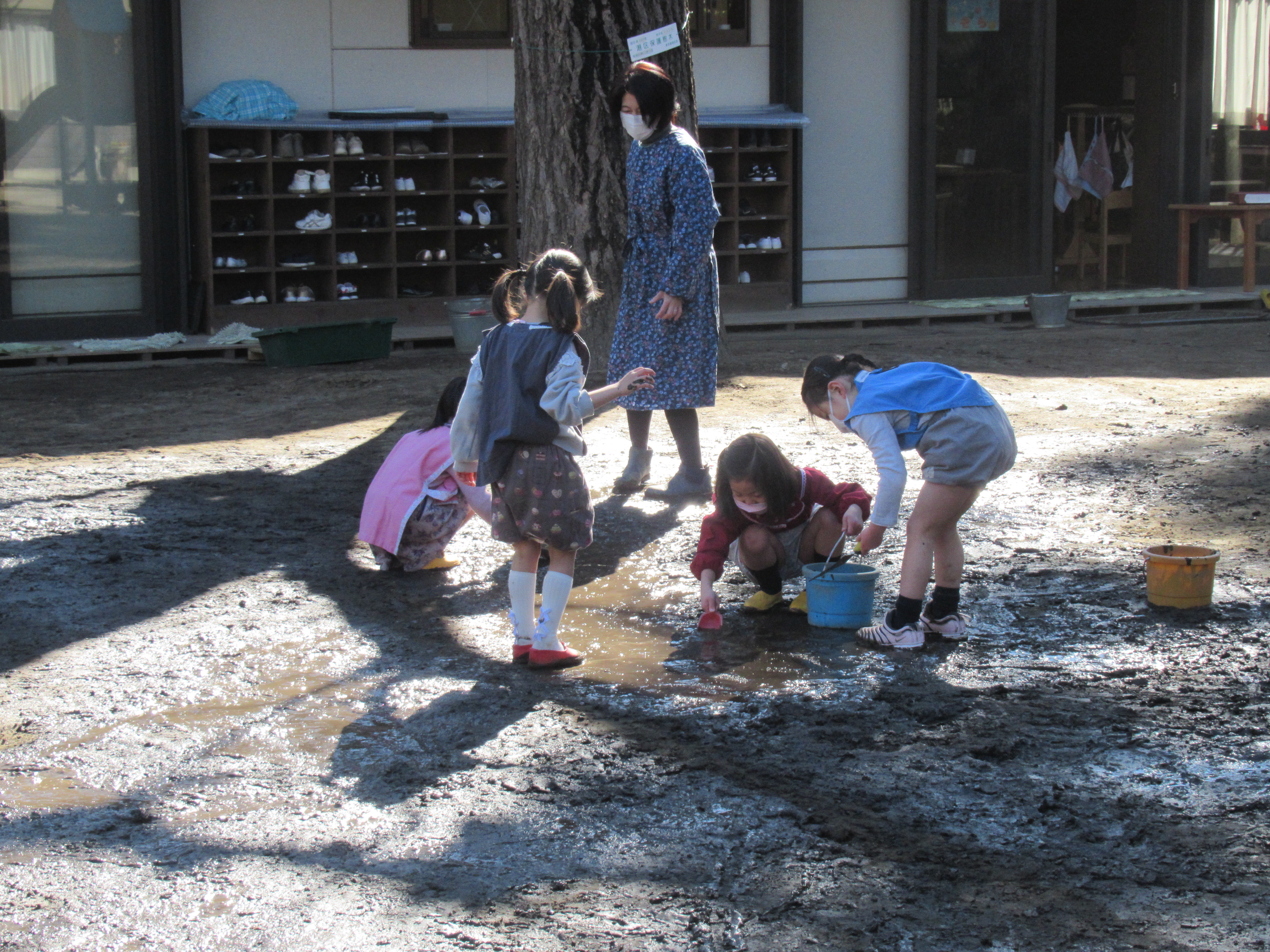 東洋英和幼稚園だより 寒い日ならではの楽しみ 水分を多く含んだ庭の土は、夜中に霜が降り固まります 庭に日差しが入り、あたたかくなると霜が溶けて庭中が見事なぬかるみになります さっそく泥を大きな筆(ほうき)にたっぷりと付け、ペンキ塗りが始まりました 足に板を付けて… 泥のスケートリンクへ出発です ぬかるみの中も下駄で歩きます 砂場にせっせとお湯を運んで温泉作りです 前へ 一覧へ戻る 次へ