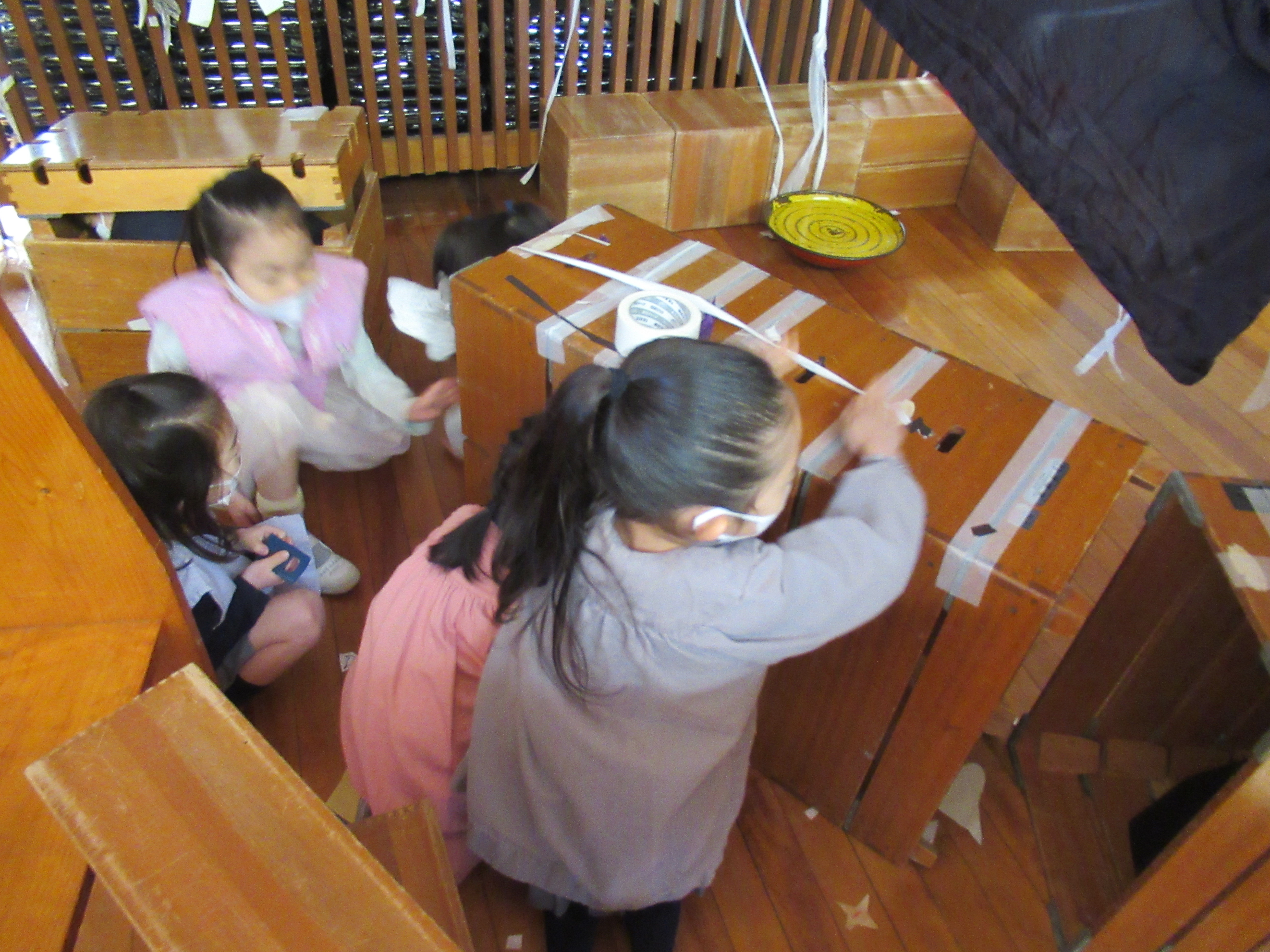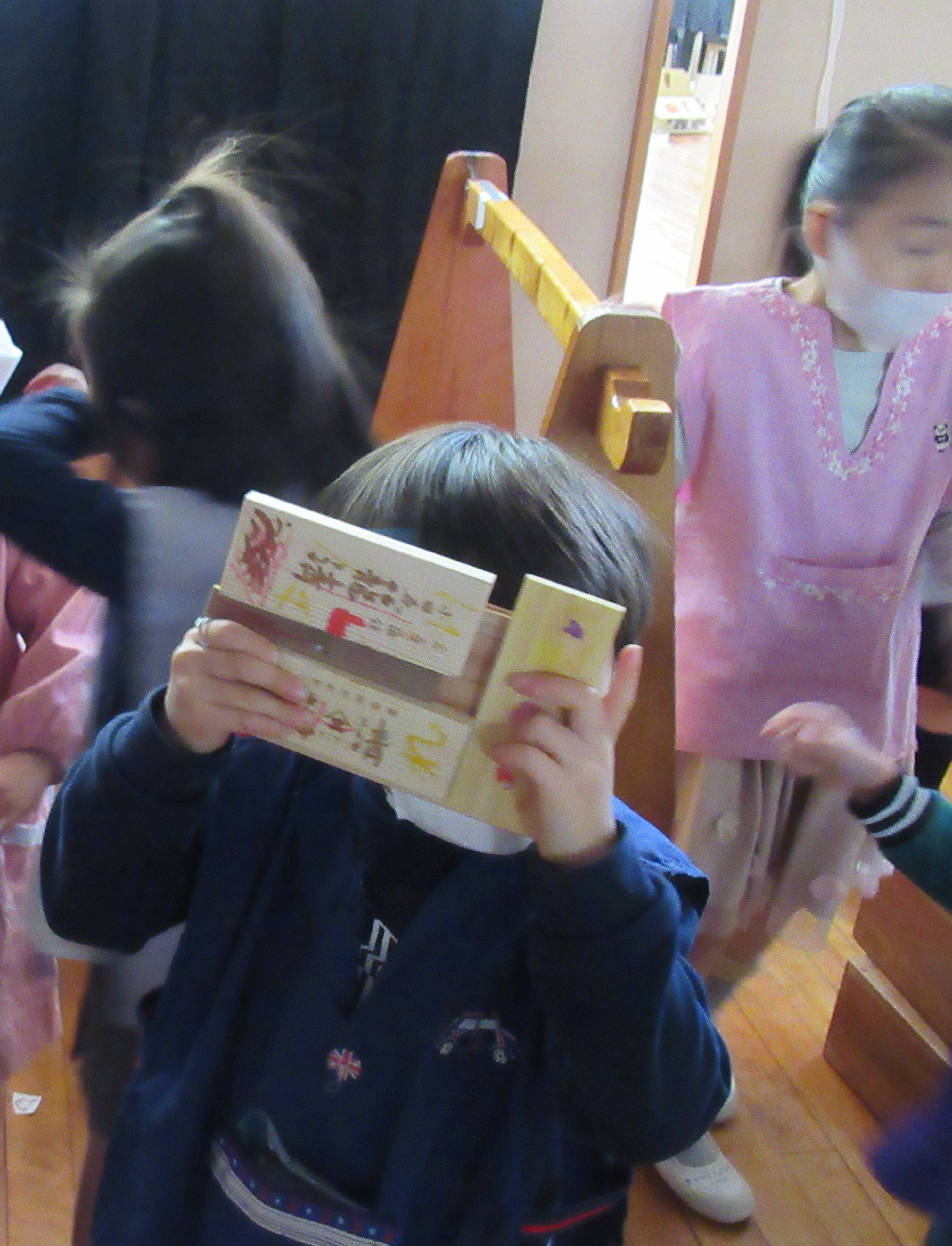 写真を撮っていたら、大工で作ったカメラを手にした子どものカメラマンも登場しました まだ他にも、小さい子どもたちのためにと秘密の物を用意している年長の子どもたちがいるようです