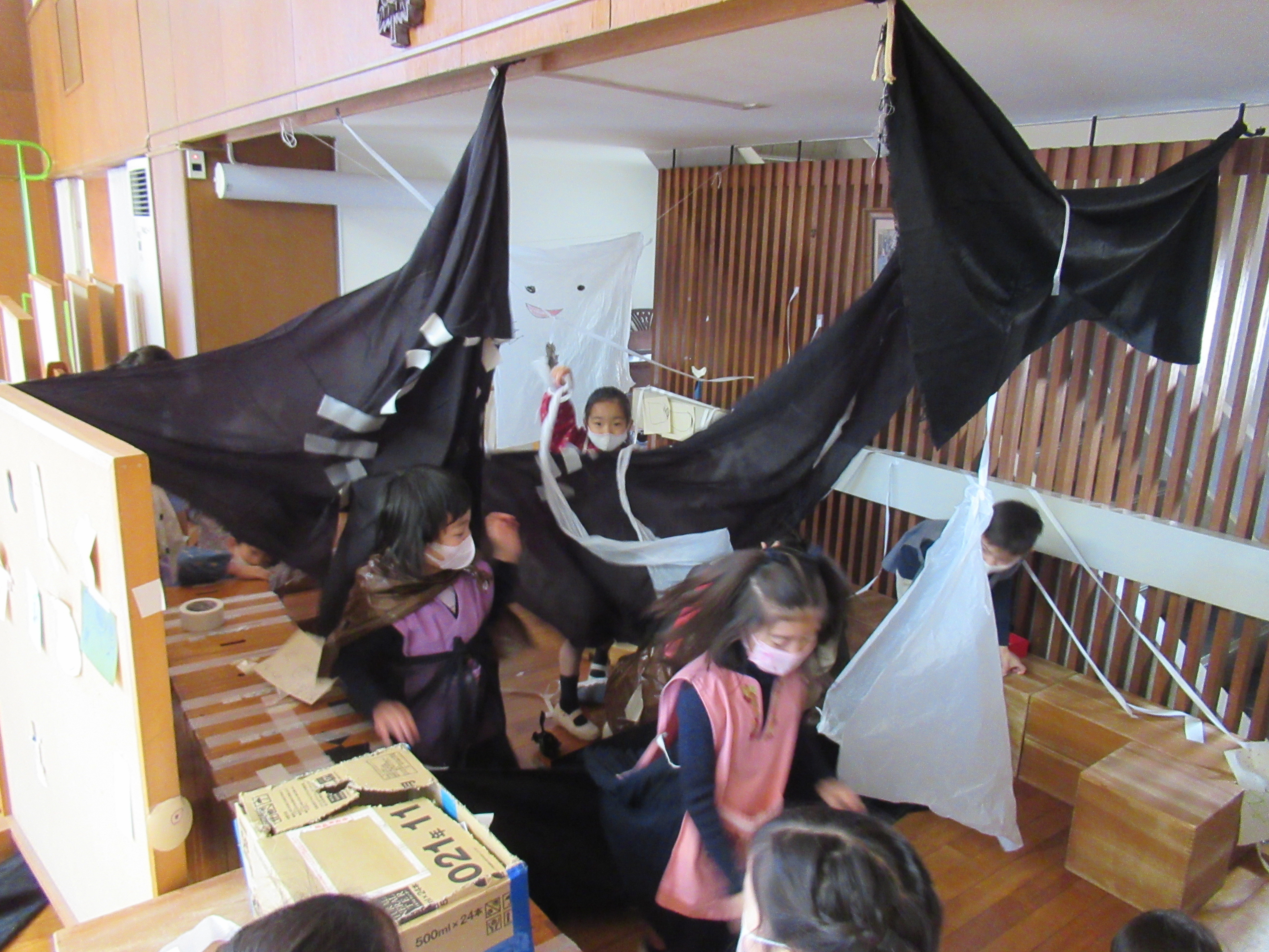 ホールにはおばけ屋敷ができました ついたてや布を使って、暗くして雰囲気を出しています