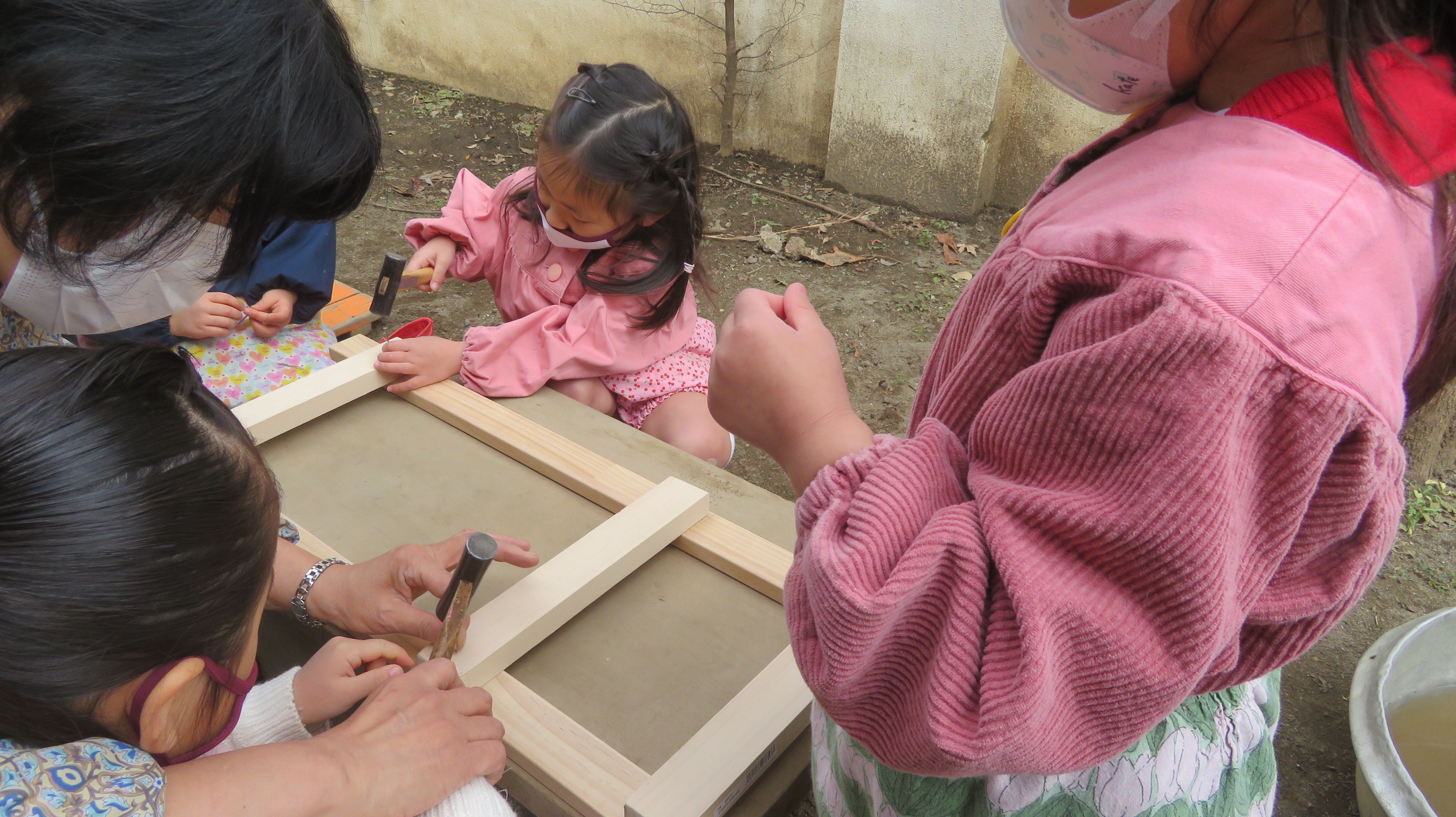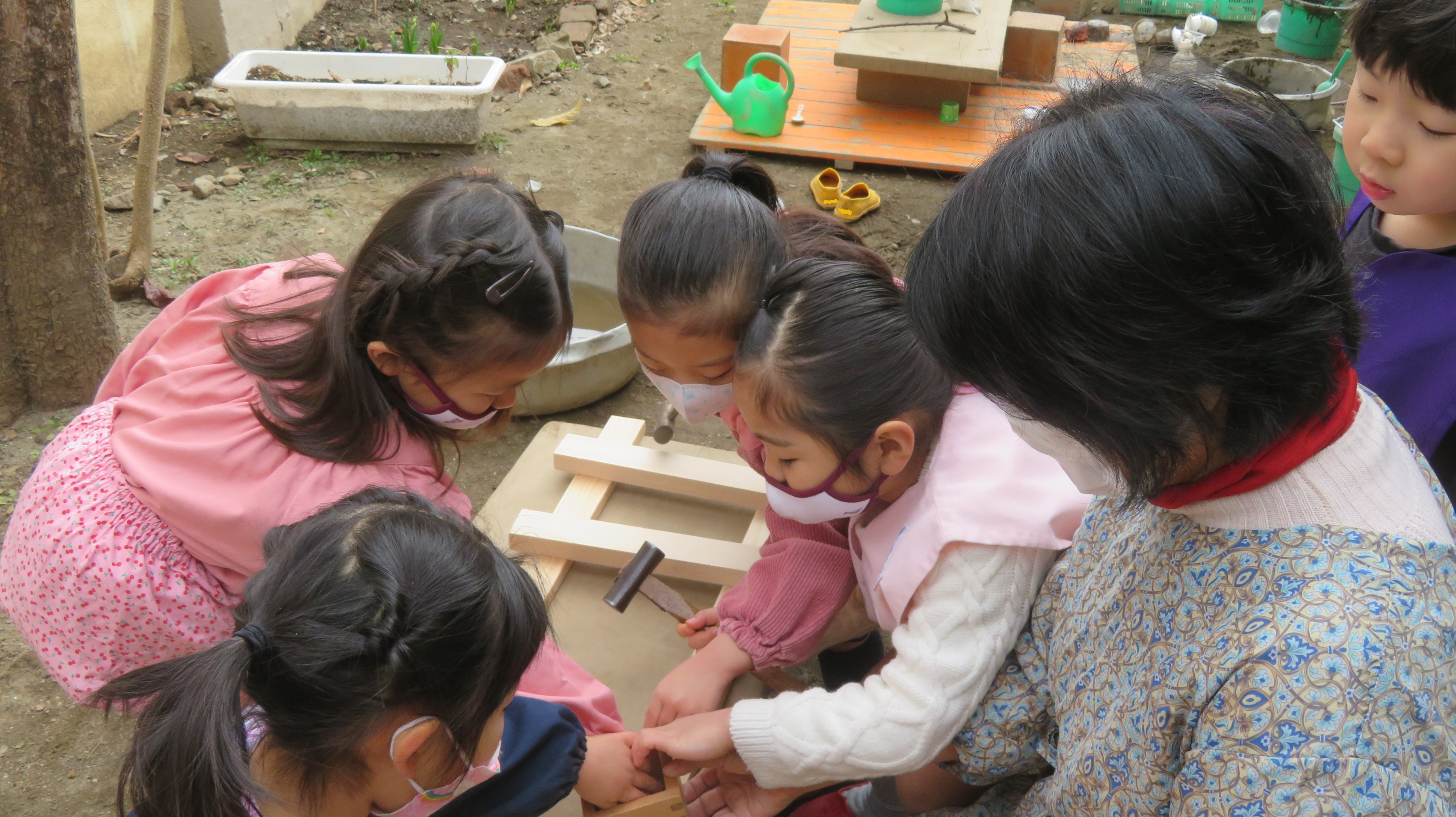 片手で釘をおさえて、かなづちでトントンと打ち付けます。出来上がったらまた木登りに使えますね。