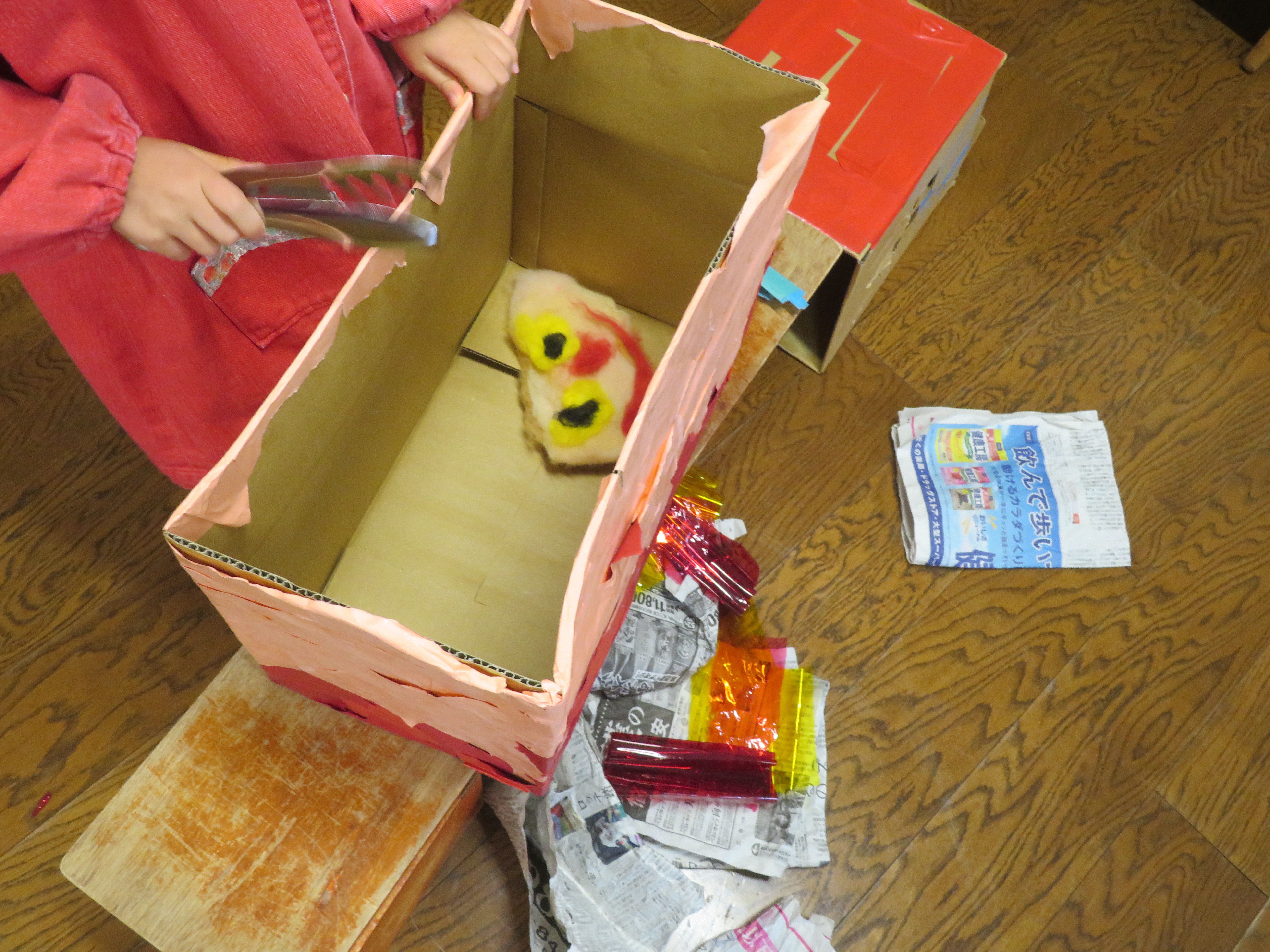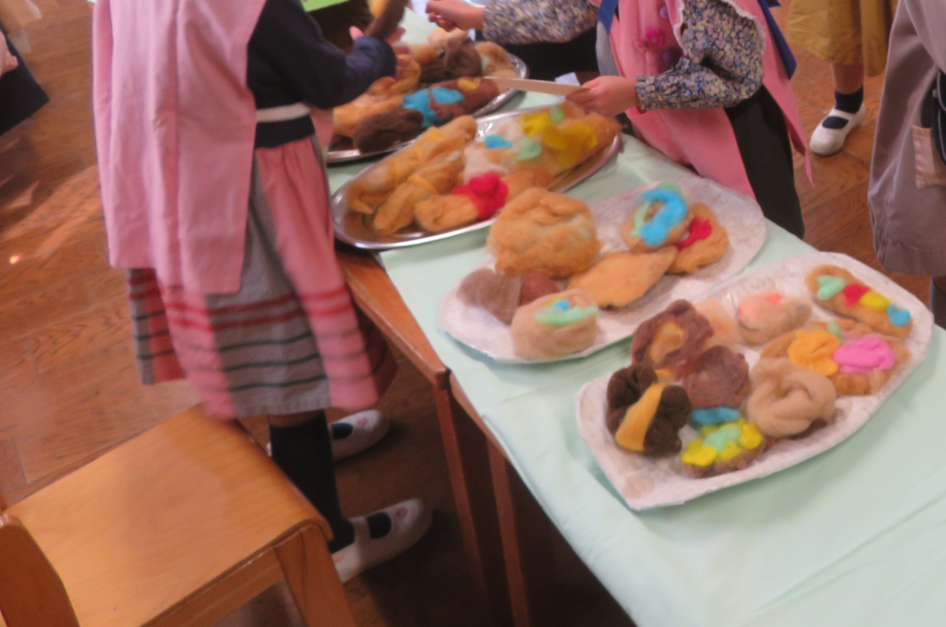 年長組の部屋では、引き続き小さい組の子どもたちのためにとお店屋さんが開いています。今度はおいしそうなパンが並んでいます。