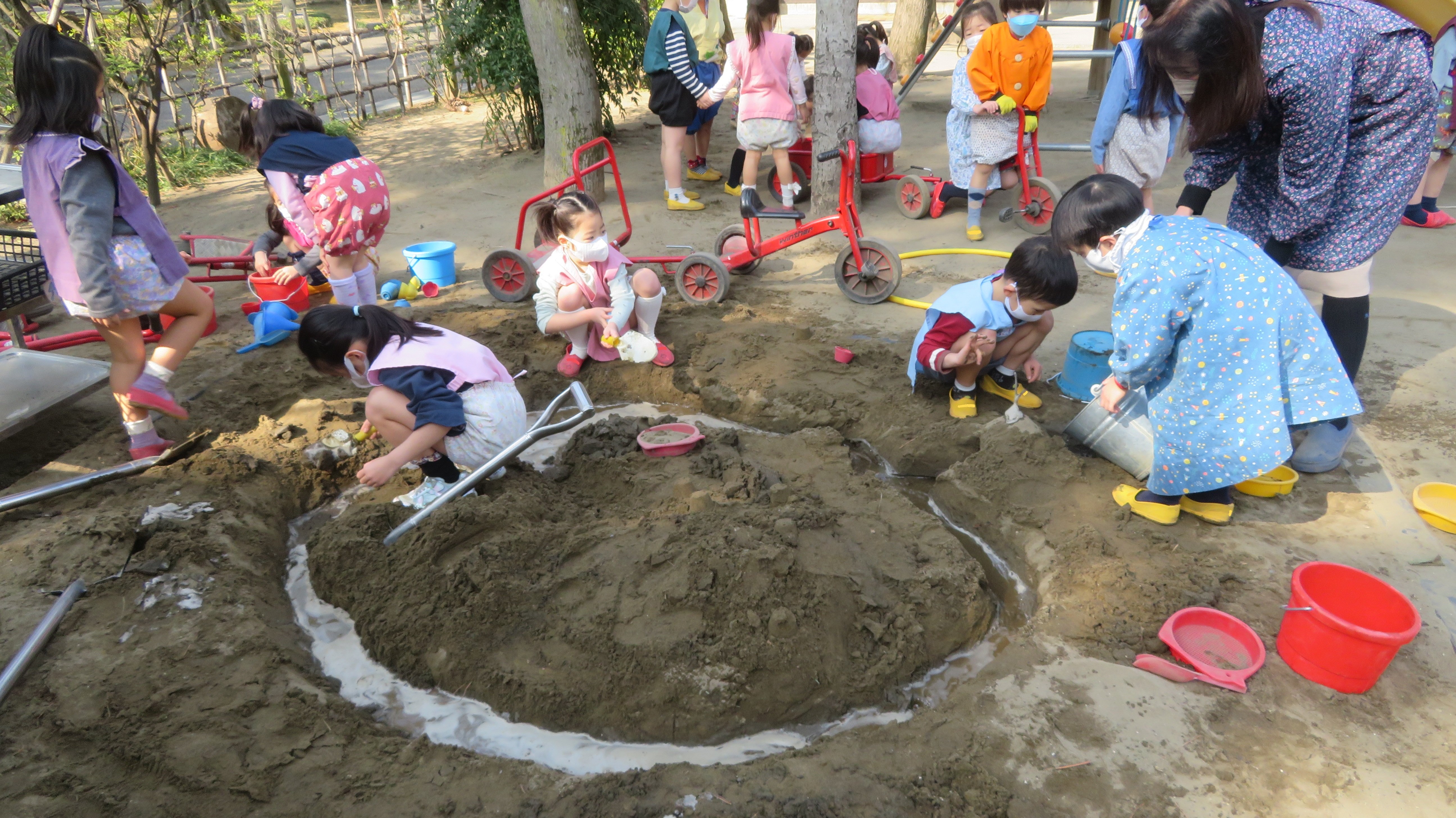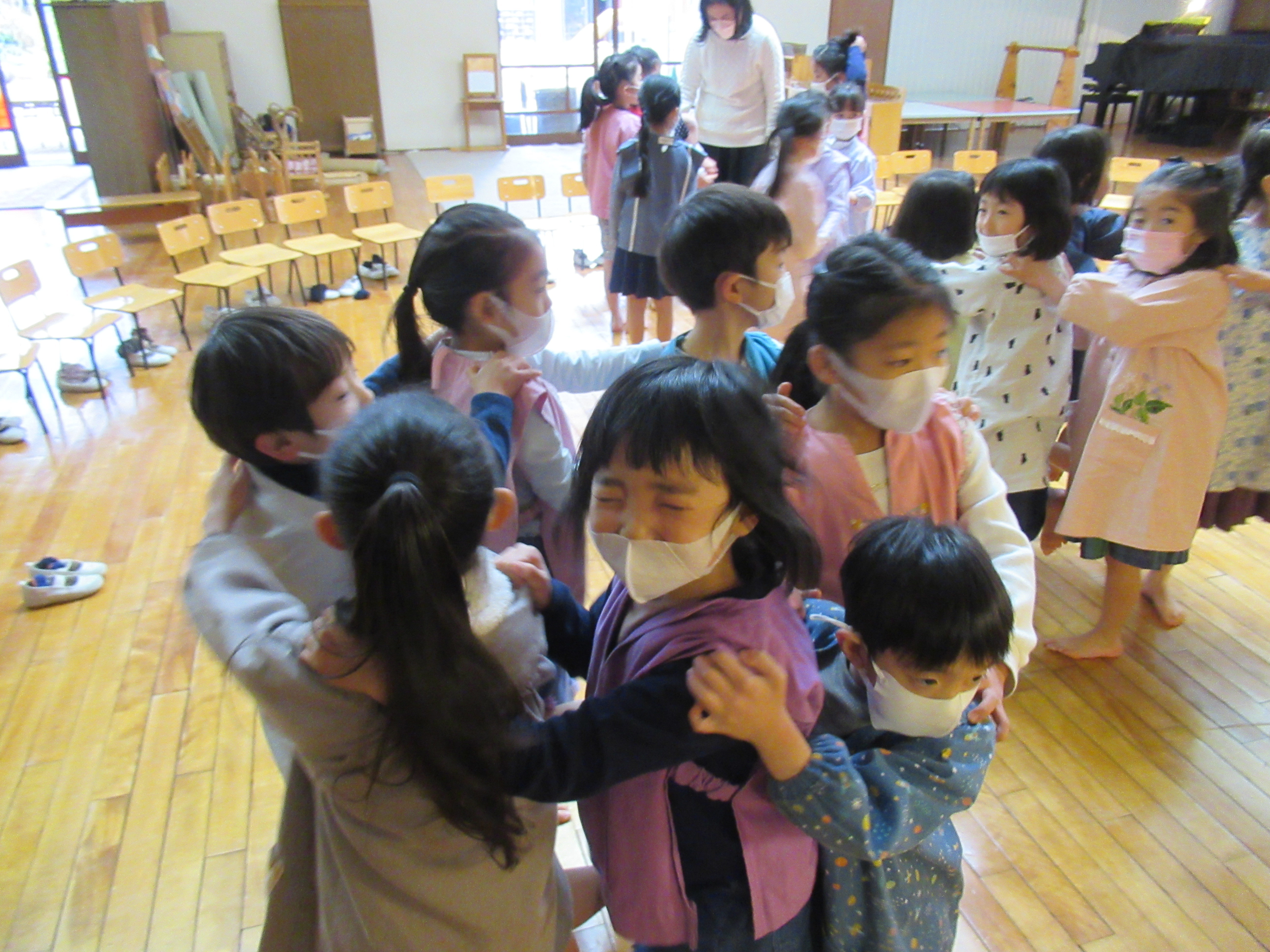 わらべうたを歌いながら輪が崩れないように片足けんけんで回ります 崩れるとそれもまた楽しいようです