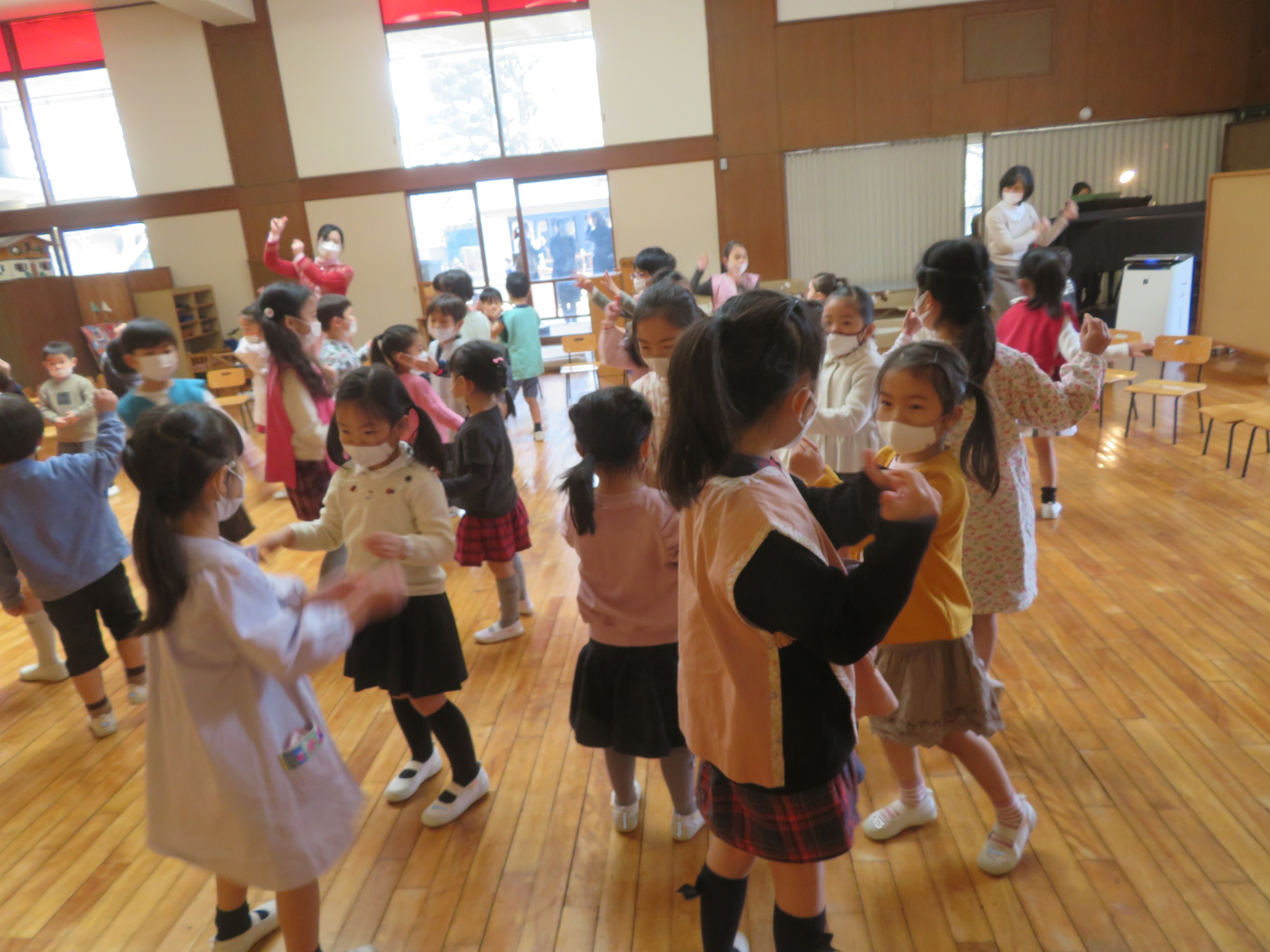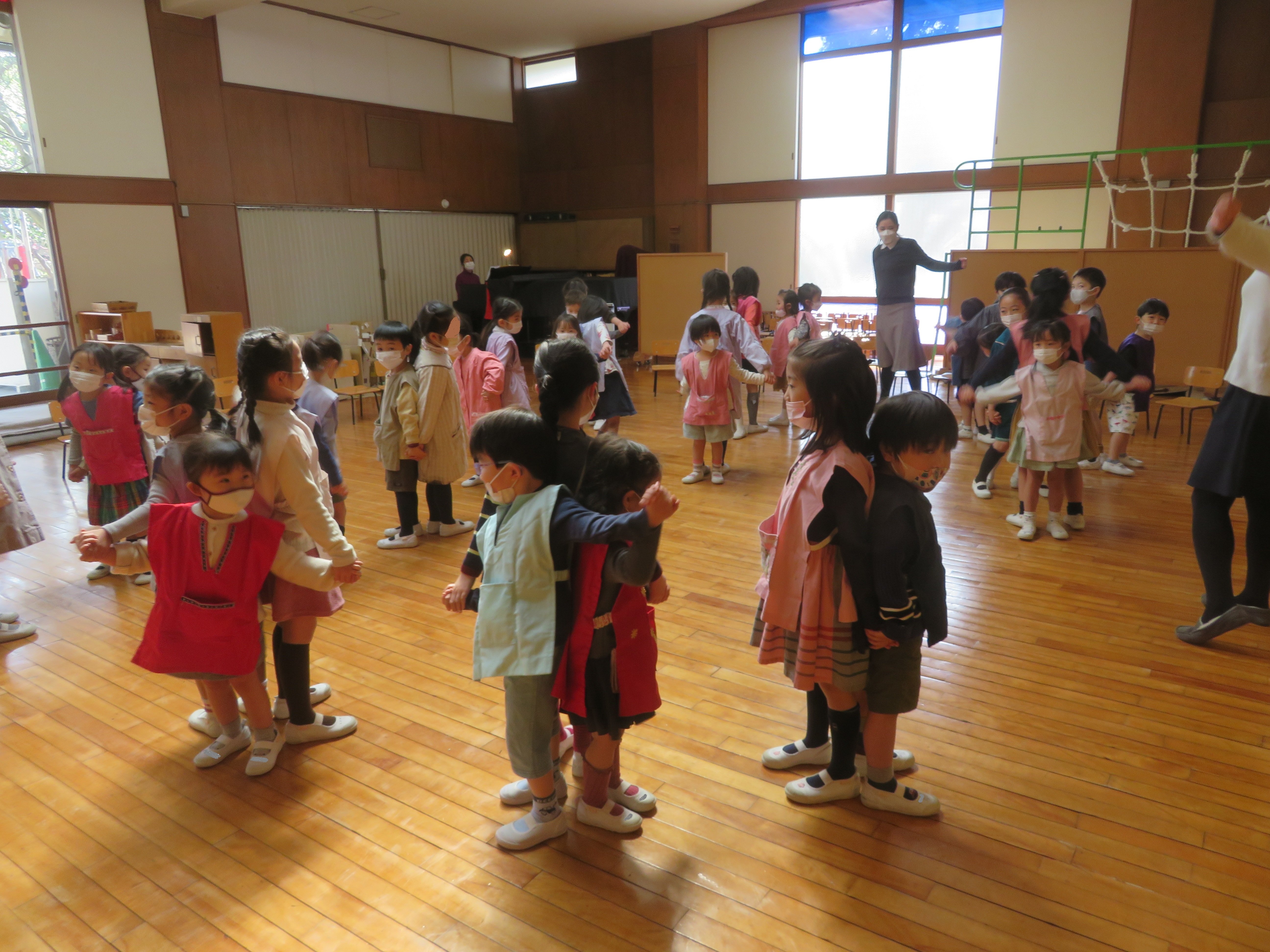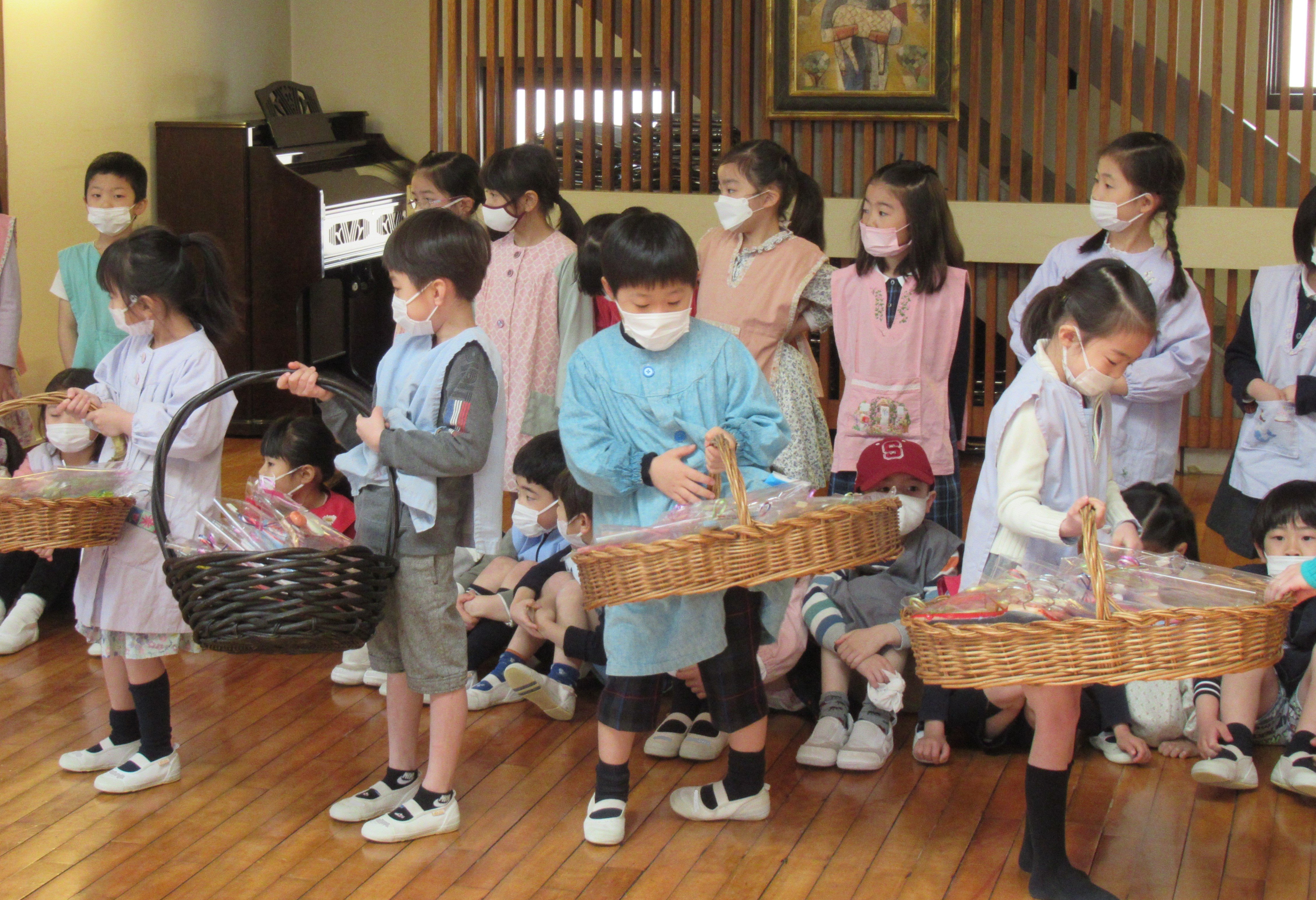 東洋英和幼稚園だより 小さい組から年長組へ 年少組の子どもたちは「ありがとう」の言葉を伝えたくて部屋までお迎えに行き、手をつないでホールまで歩きました ホールでは~なべなべそこぬけ~ 大きい組と一緒だと上手にまわれました! ロックマイソウル♪新しい踊りを教えてもらいました 年中組の子ども達は砂場で遊んだり鬼ごっこをしたり、一緒に過ごしましたね。 なにかプレゼントがあるようです 遊びの中で何日もかけて作りました かごの中のプレゼントは、学校に行く服をかけてもらえたら…と、ハンガーに色を塗り、飾りを付けたものです 前へ 一覧へ戻る 次へ