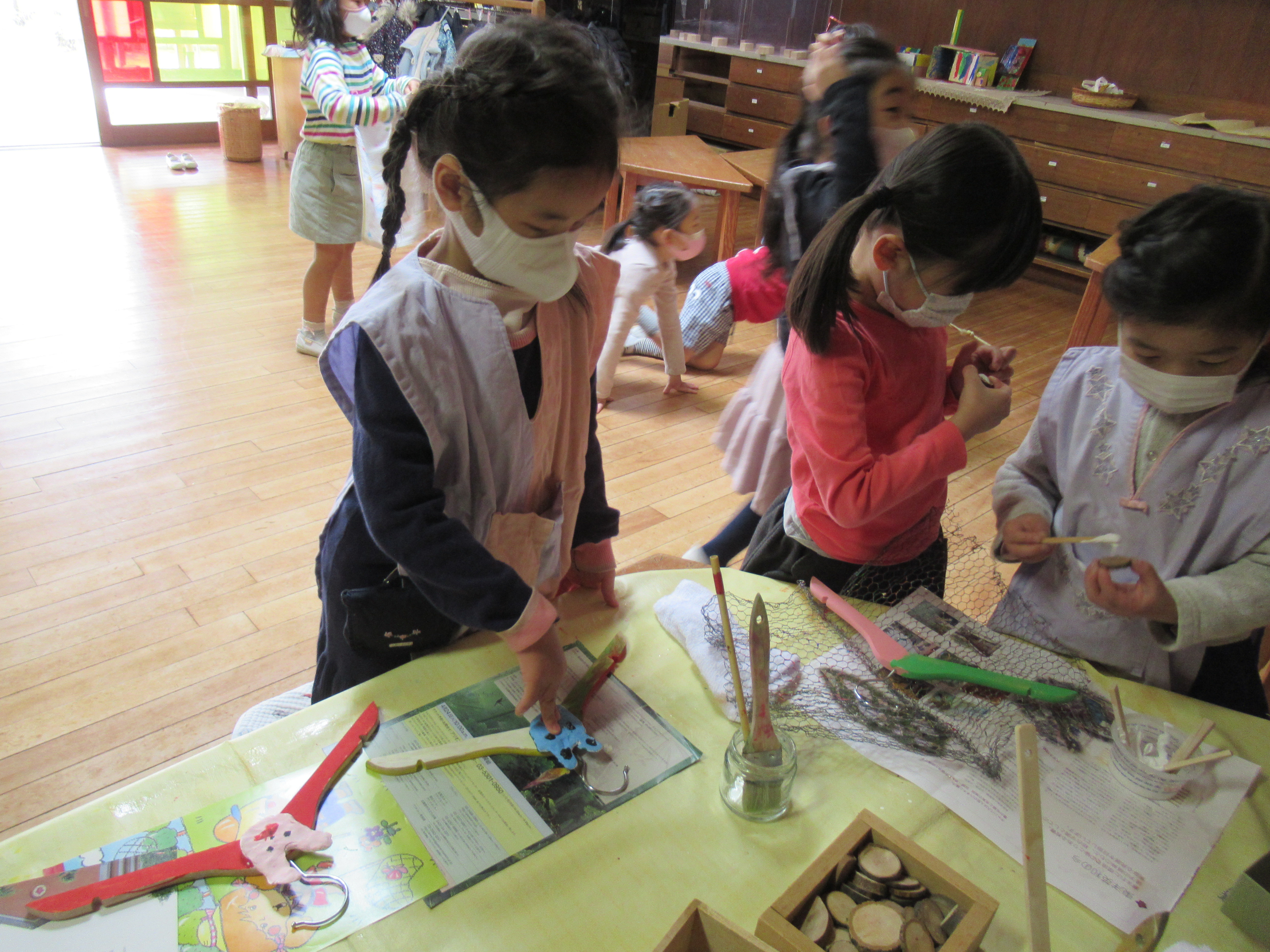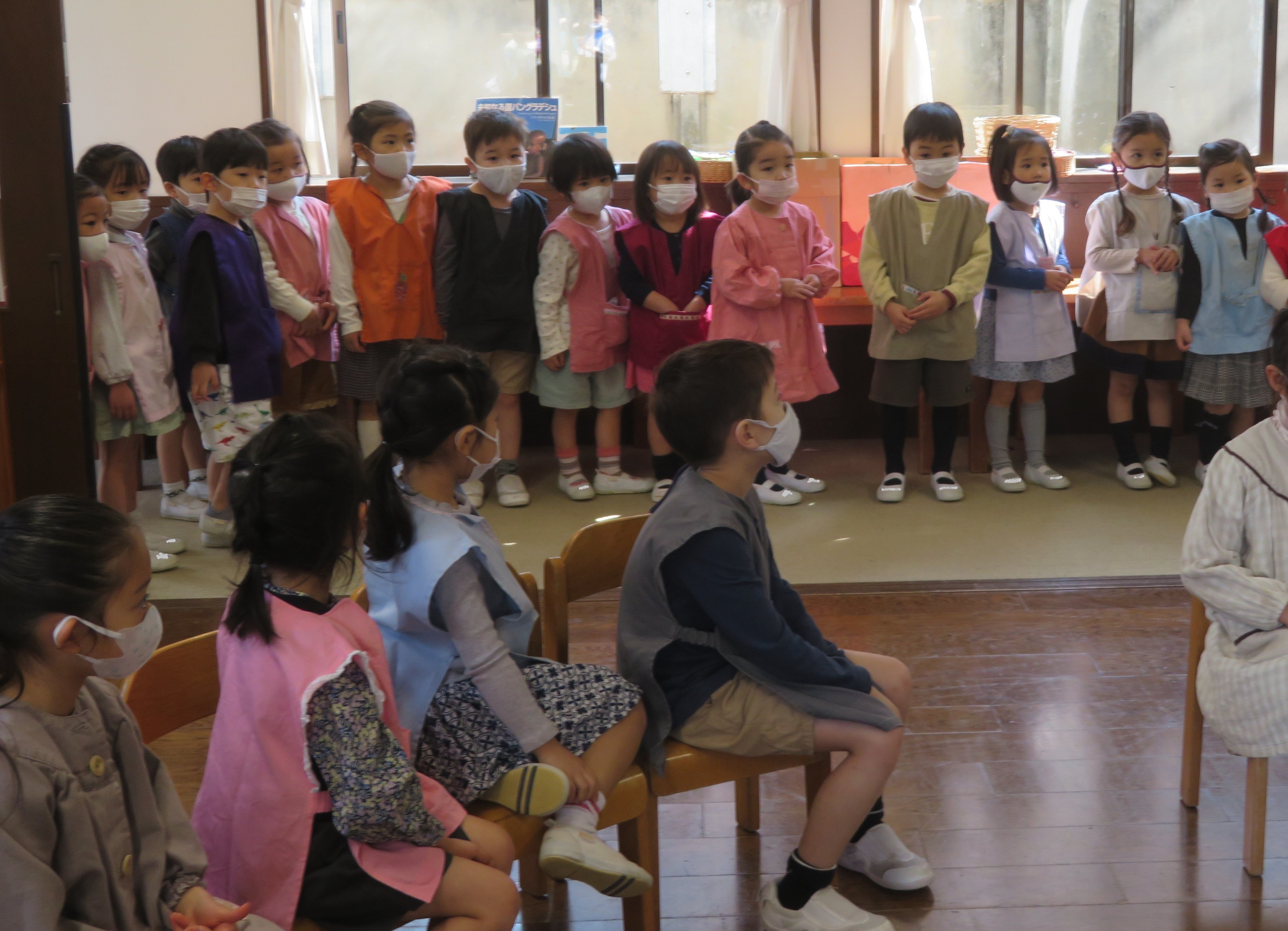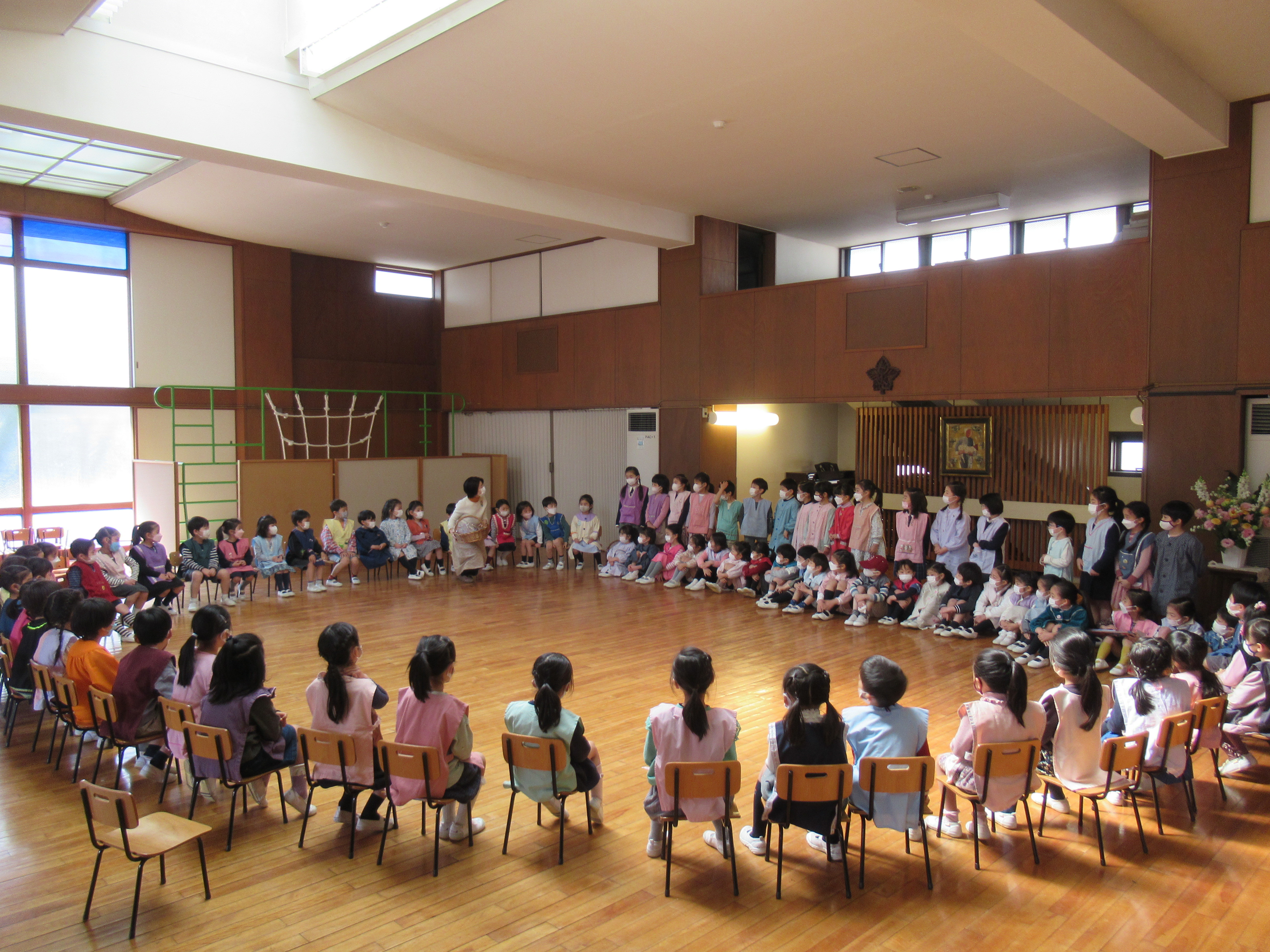 東洋英和幼稚園だより 小さい組から年長組へ 年少組の子どもたちは「ありがとう」の言葉を伝えたくて部屋までお迎えに行き、手をつないでホールまで歩きました ホールでは~なべなべそこぬけ~ 大きい組と一緒だと上手にまわれました! ロックマイソウル♪新しい踊りを教えてもらいました 年中組の子ども達は砂場で遊んだり鬼ごっこをしたり、一緒に過ごしましたね。 なにかプレゼントがあるようです 遊びの中で何日もかけて作りました かごの中のプレゼントは、学校に行く服をかけてもらえたら…と、ハンガーに色を塗り、飾りを付けたものです 前へ 一覧へ戻る 次へ