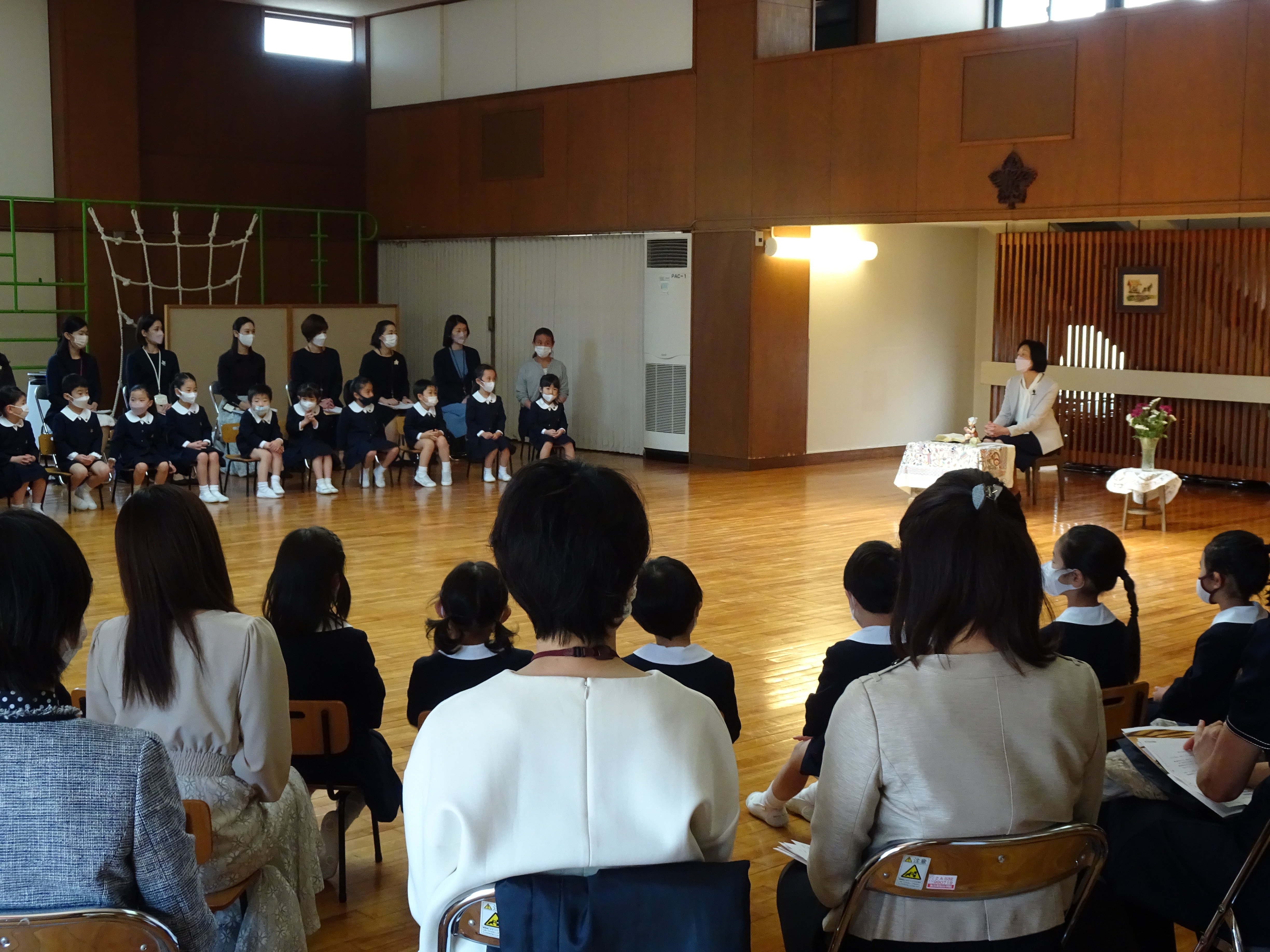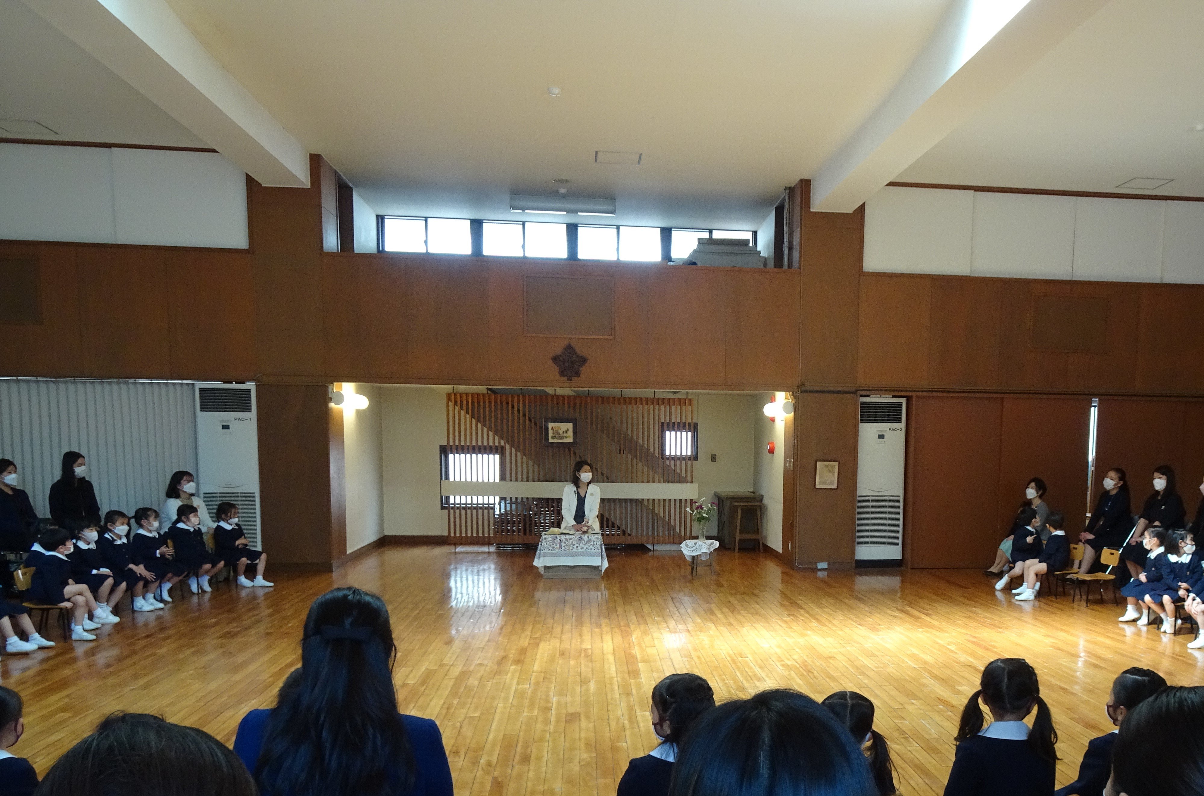 東洋英和幼稚園だより 始業礼拝 幼稚園のホールのチャペルコーナー 落ち着いたあたたたかな場所です 子どもたちは大きくなって新しい学年、組になりました 年長組も 年中組も 保護者の方と一緒に礼拝を守りました 前へ 一覧へ戻る 次へ