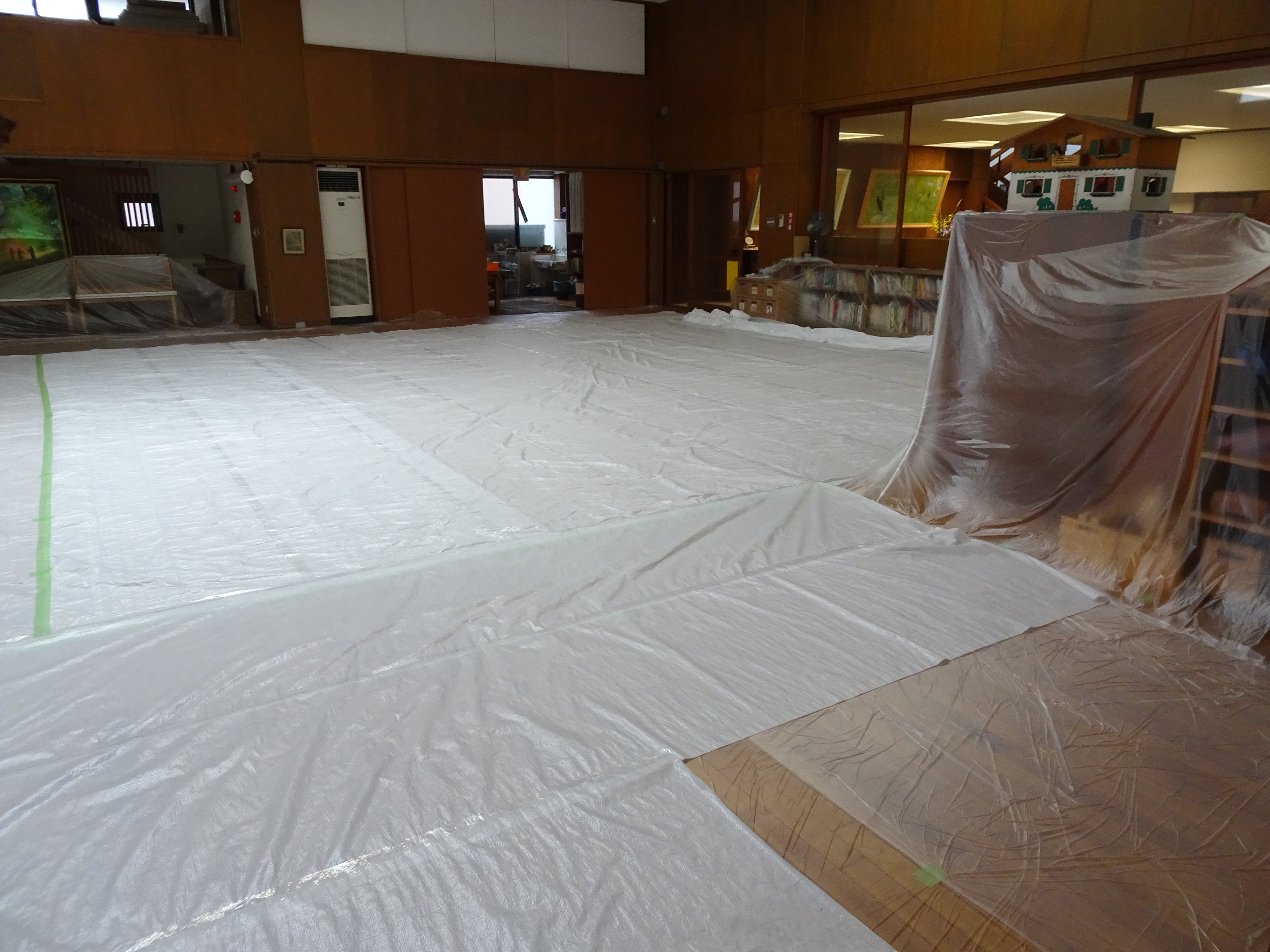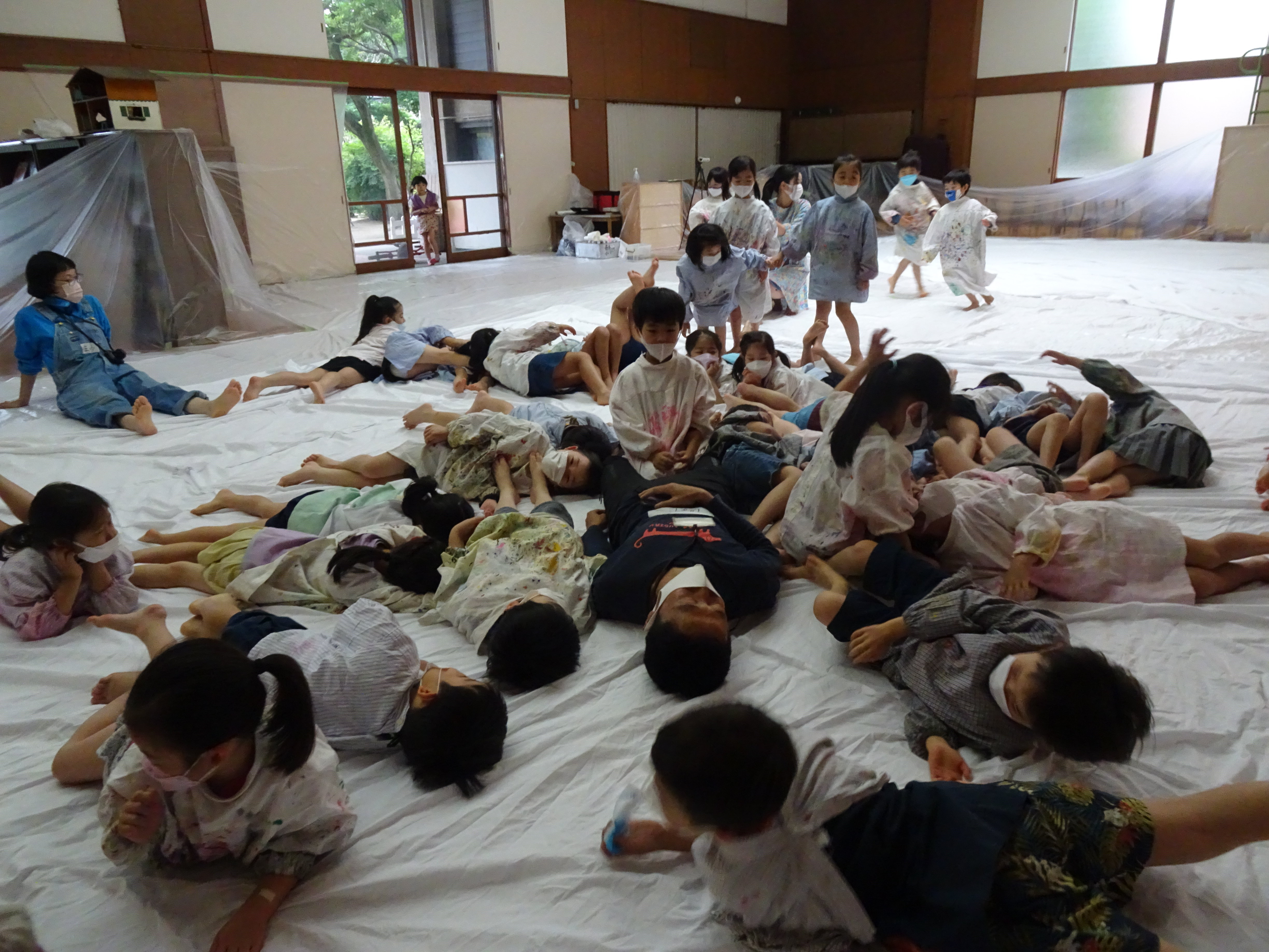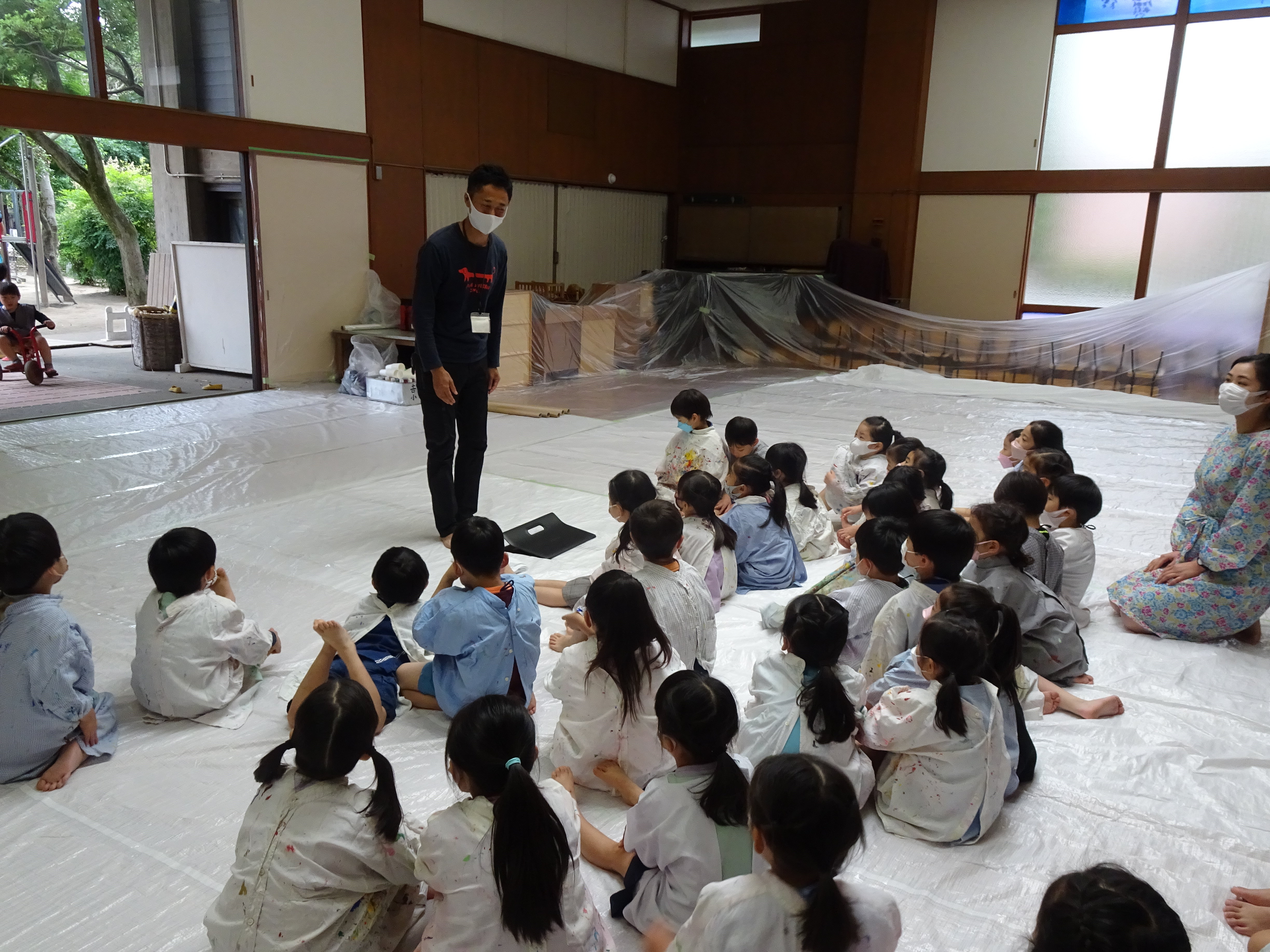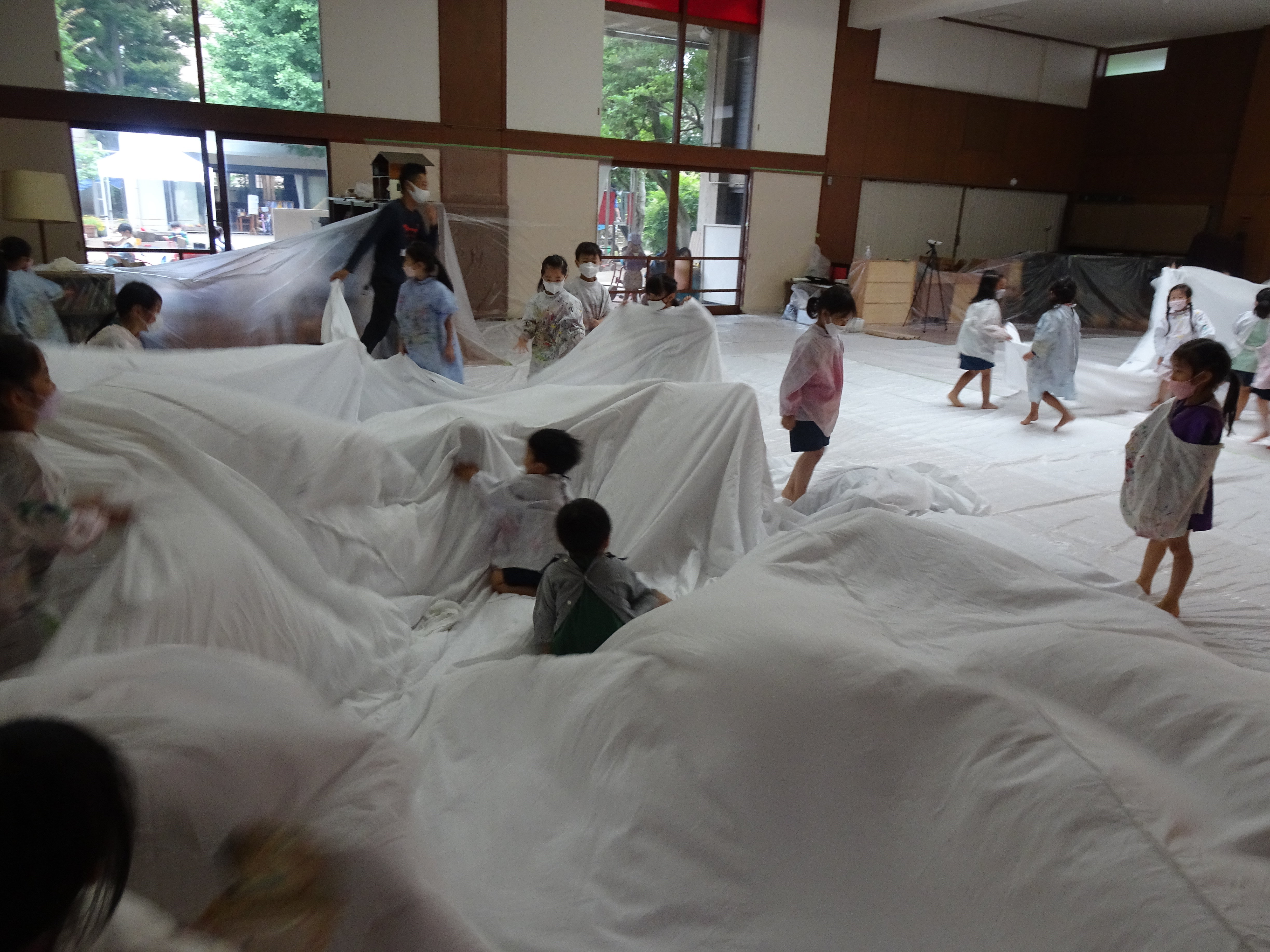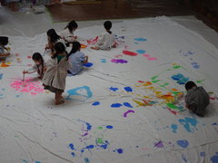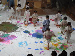 東洋英和幼稚園だより 年長 アートの日 ある日、幼稚園に来るとホールの中が大きなシートで覆われていました ジョニーさんがやってきて、一緒に遊んでくださるようです 大きな大きな白い布 みんなで動かすと波のようです 今度はごろんと寝転びます 持ってきてくださった色とりどりの絵の具 好きなところに、好きなように、絵の具を広げていきます 色の世界にでかけます 前へ 一覧へ戻る 次へ
