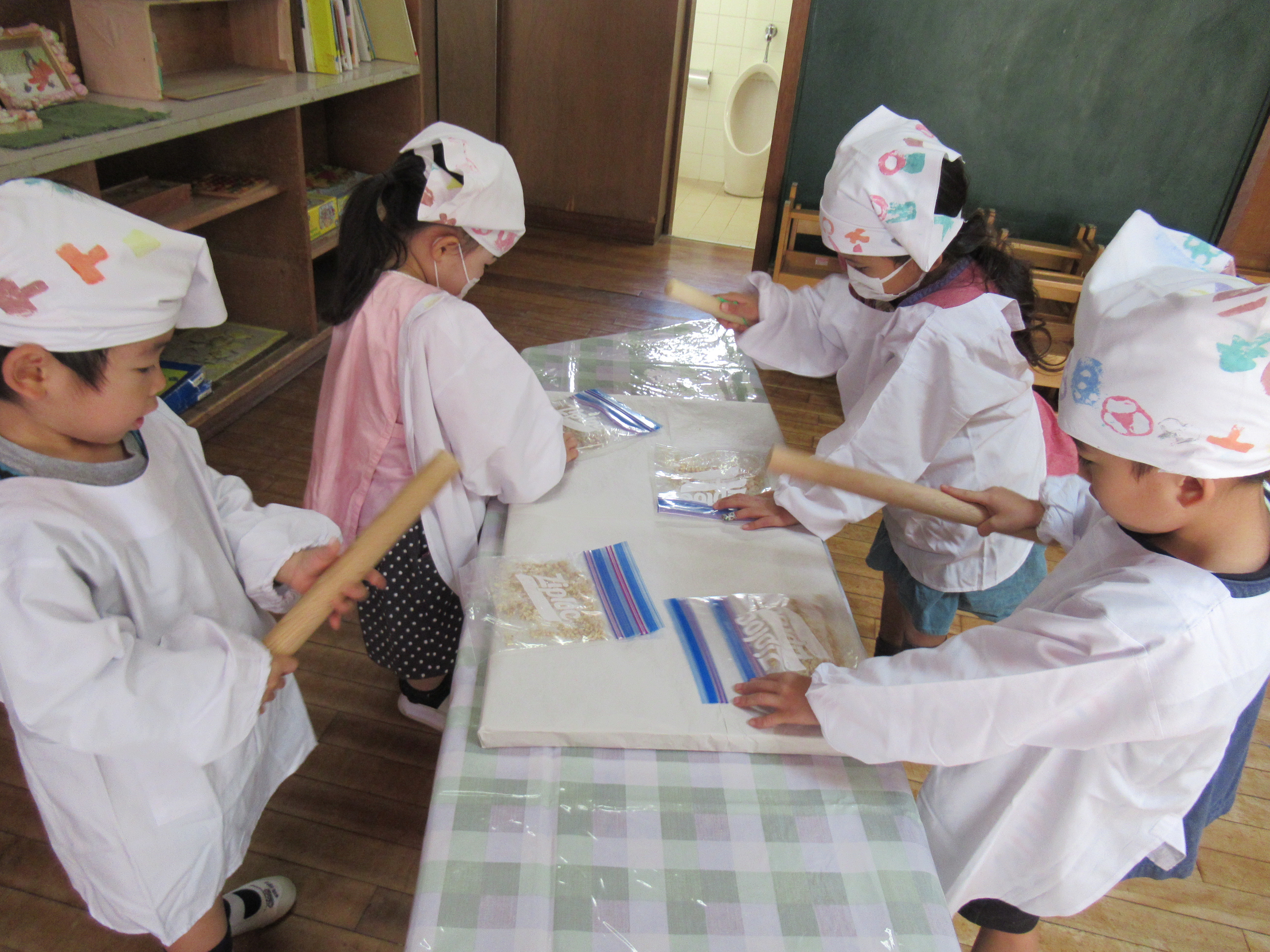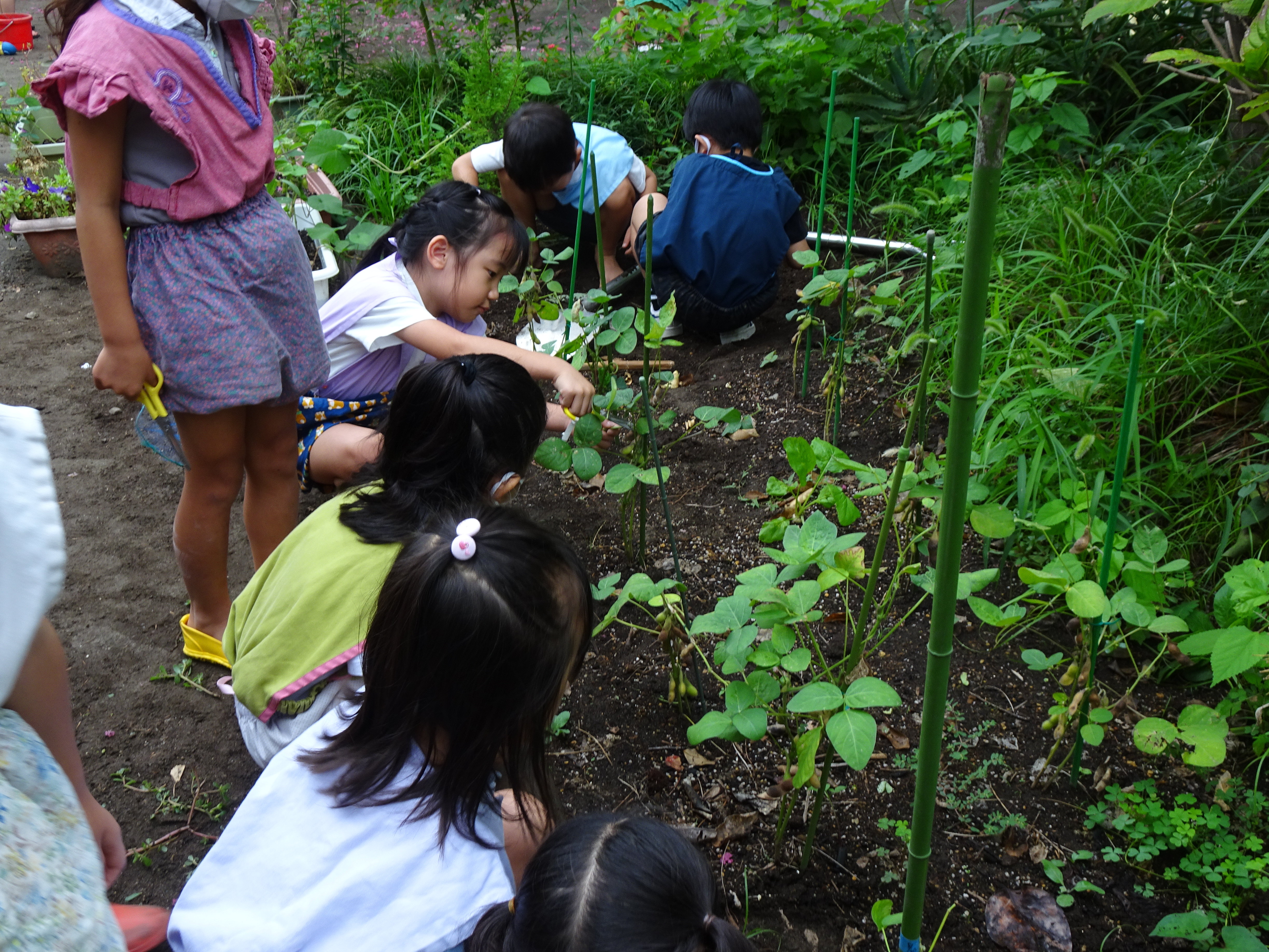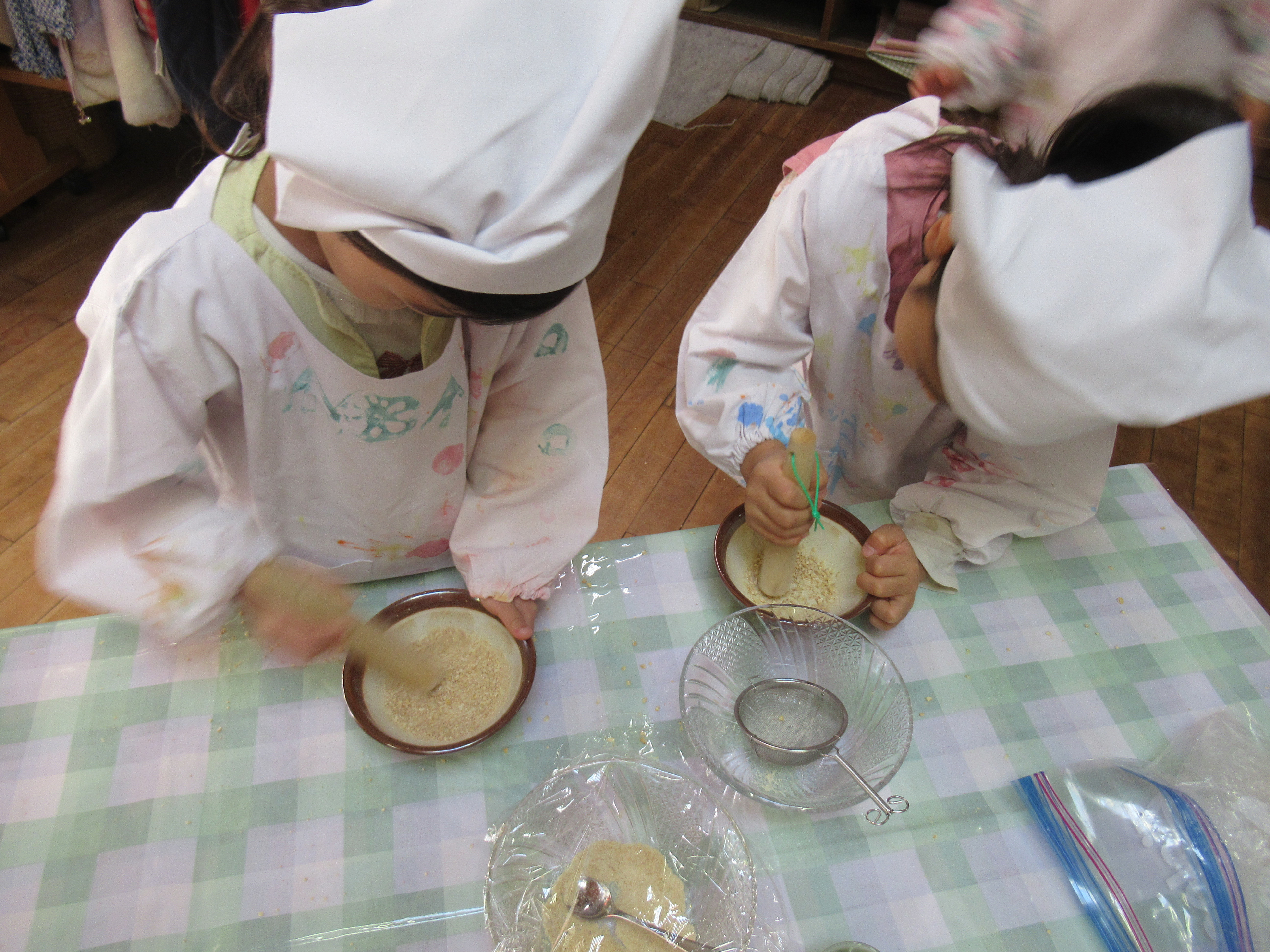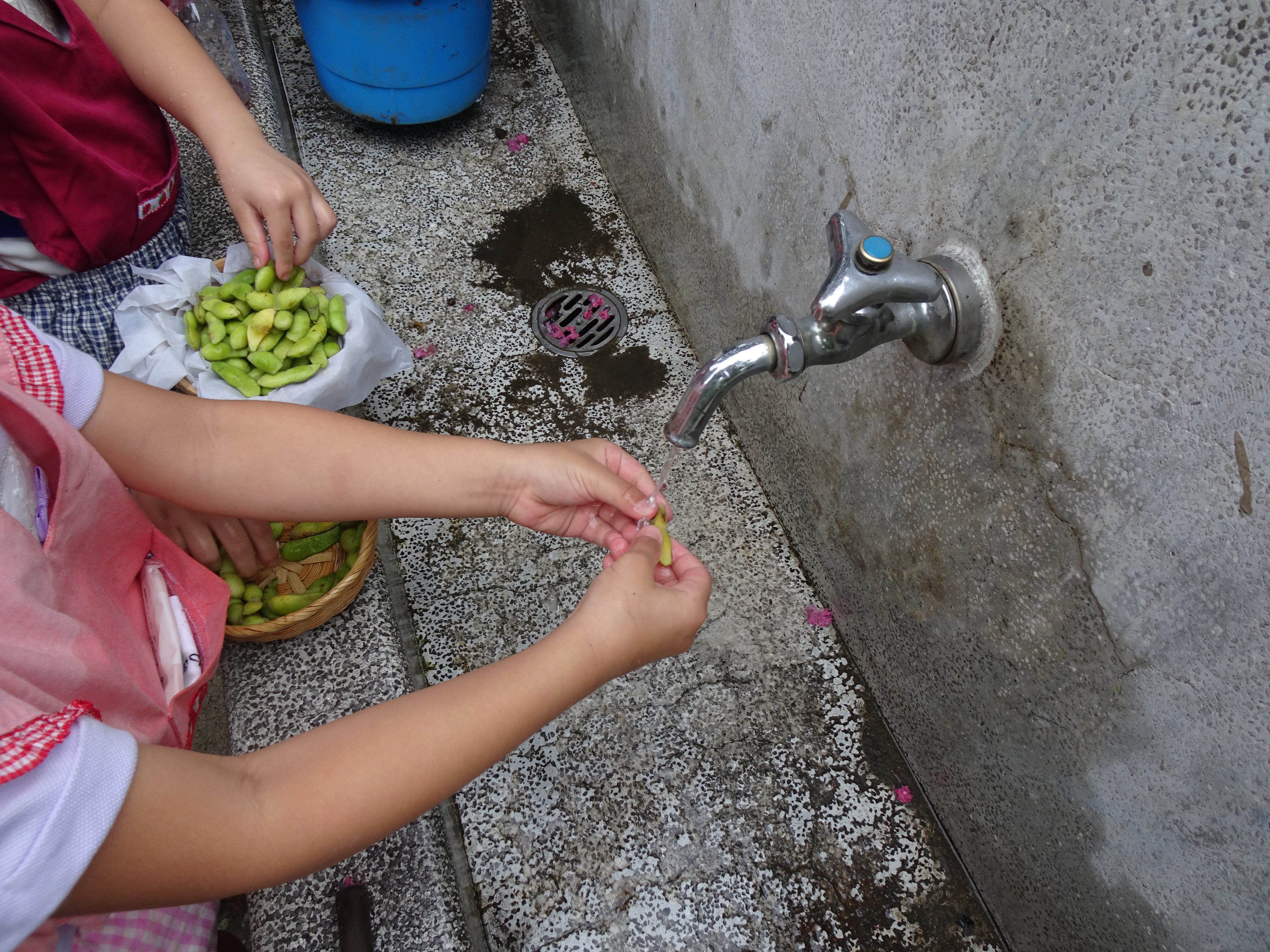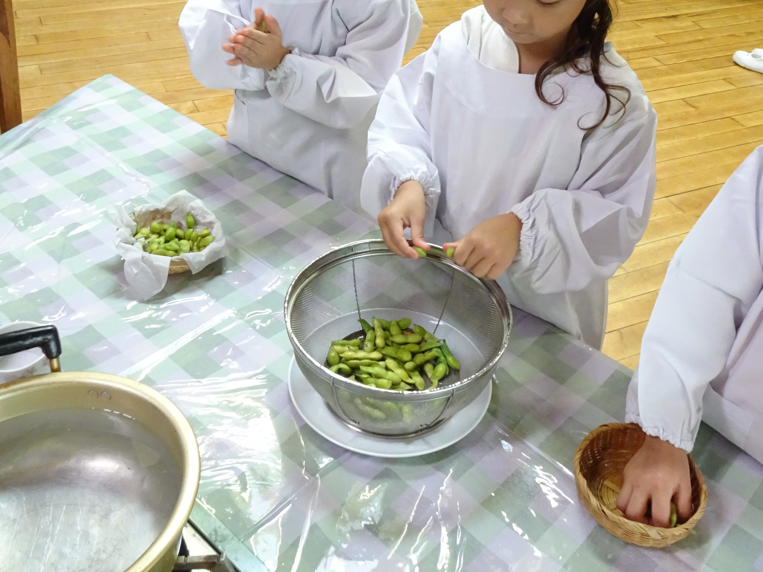 東洋英和幼稚園だより えだまめ~きなこ 一学期に植えた枝豆がおいしそうに実りました さっそく収穫します 水でよく洗って 塩をまぶしてよくすり合わせて 茹でて、一粒ずついただきました 11月 黒くなった鞘を剥いてみると、大豆になっていました 炒った大豆を綿棒でたたいて… すり鉢ですって粉にして…香ばしいきなこを作りました 白玉団子を作って、メープルシロップも添えていただきました 前へ 一覧へ戻る 次へ