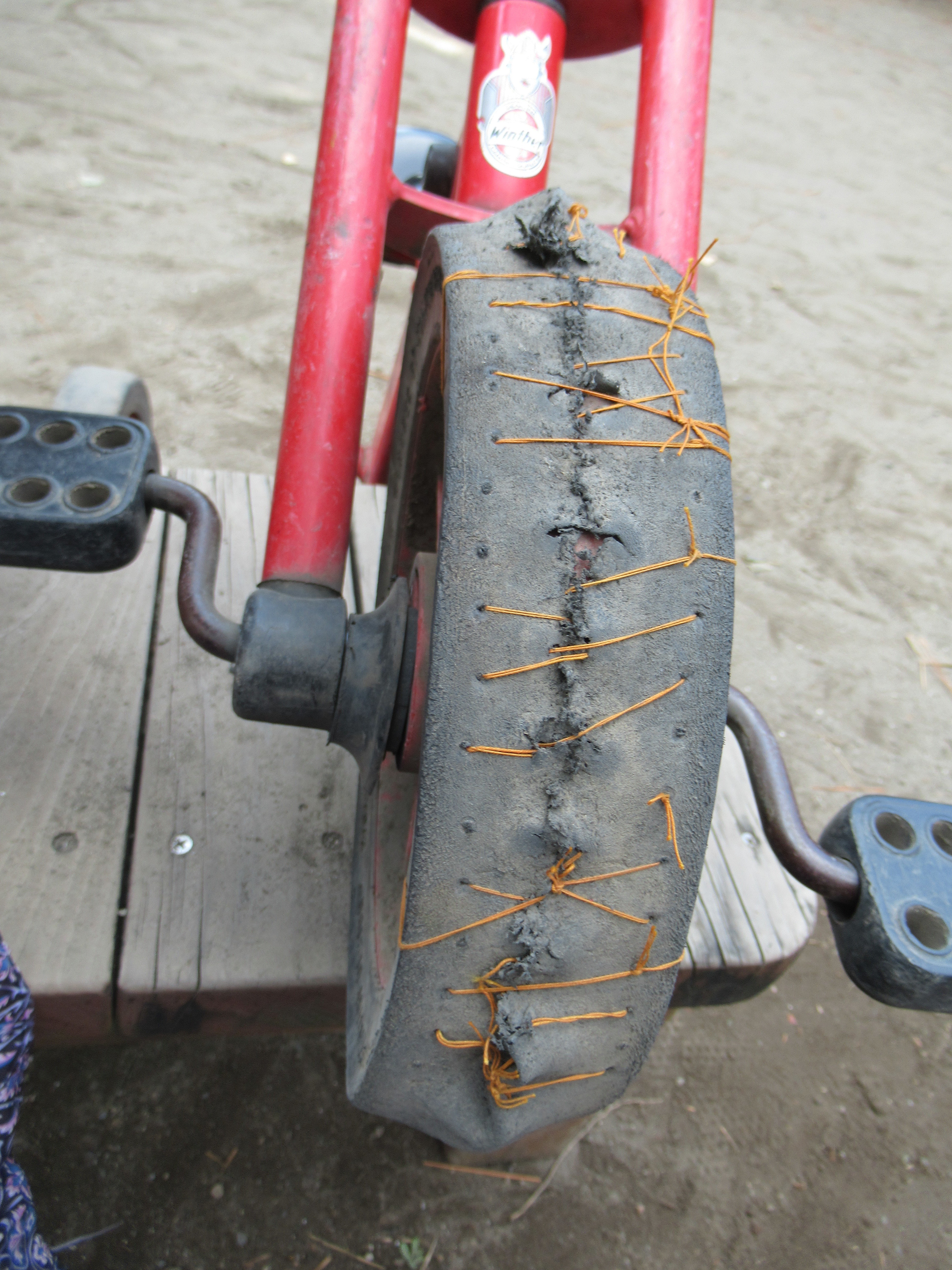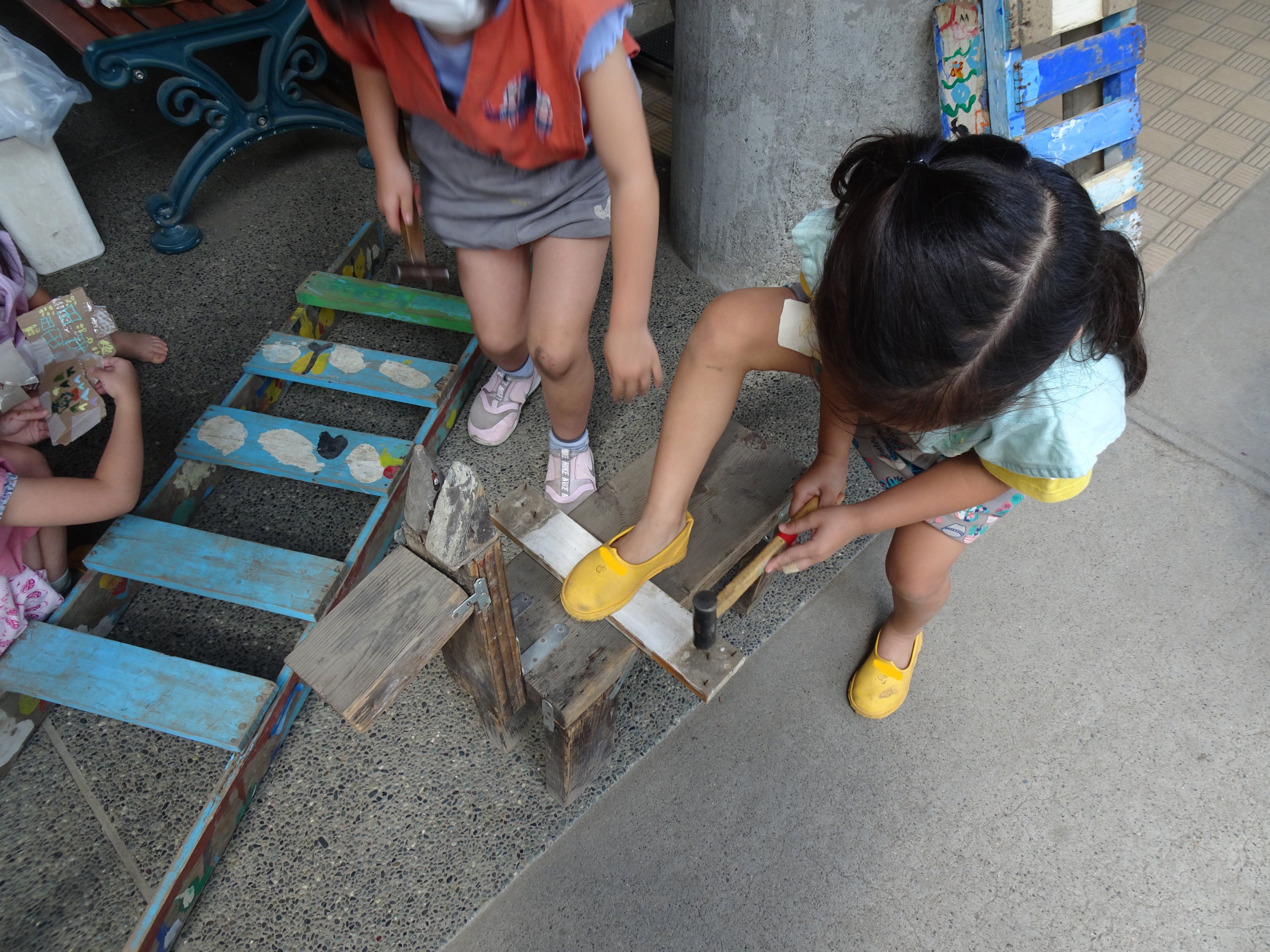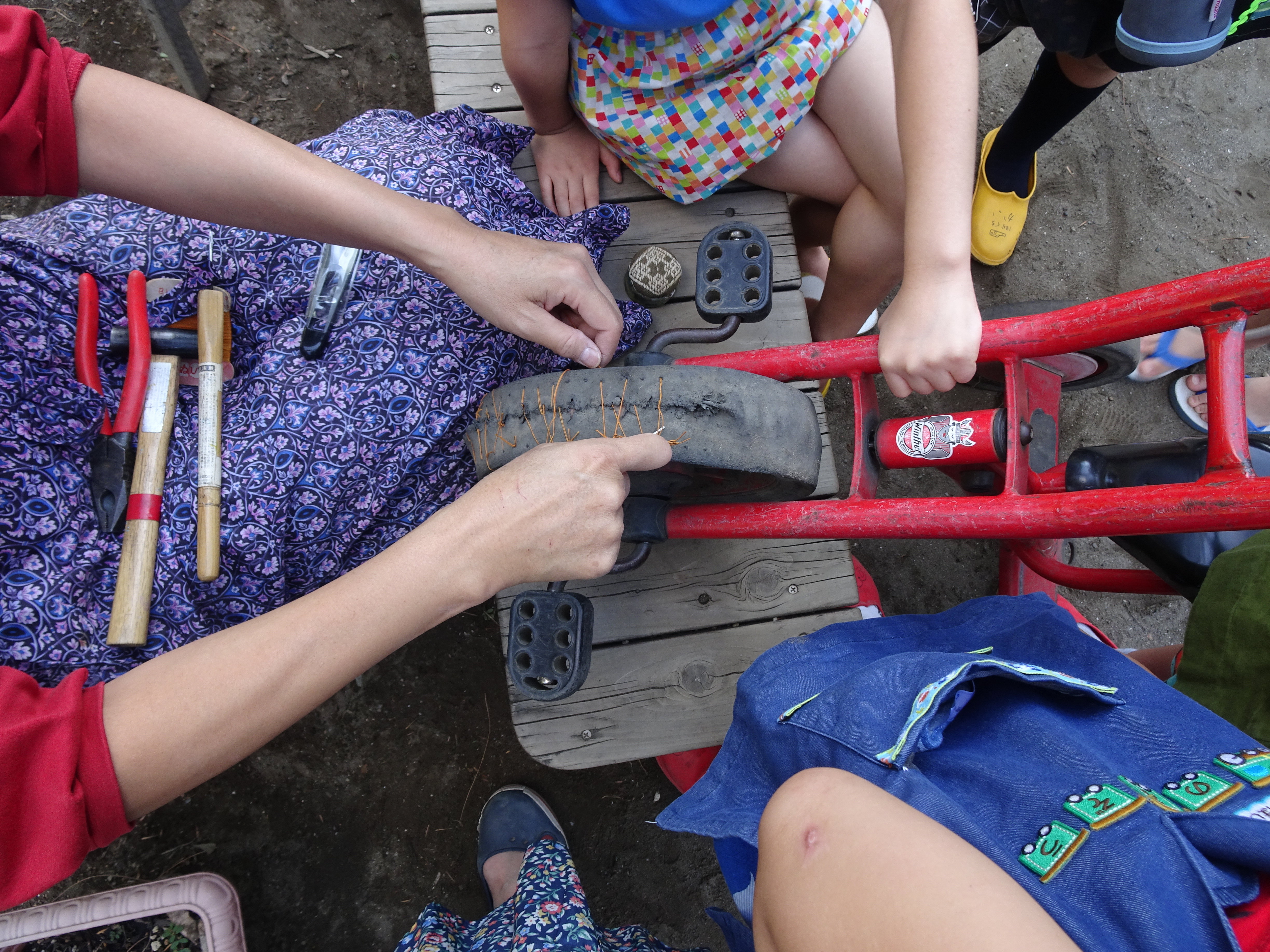 東洋英和幼稚園だより 修理をして使うこと 手作りのはしご 遊んでいて壊れる度に板を合わせて釘で打ちつけて修理をします 仕上げに色を塗って、筆を丁寧に洗います 何年も愛用しているスクーター ゴムが避けてきてしまいました 子どもたちの提案で縫い合わせてみることになりました 大手術を終えたスクーター 前へ 一覧へ戻る 次へ