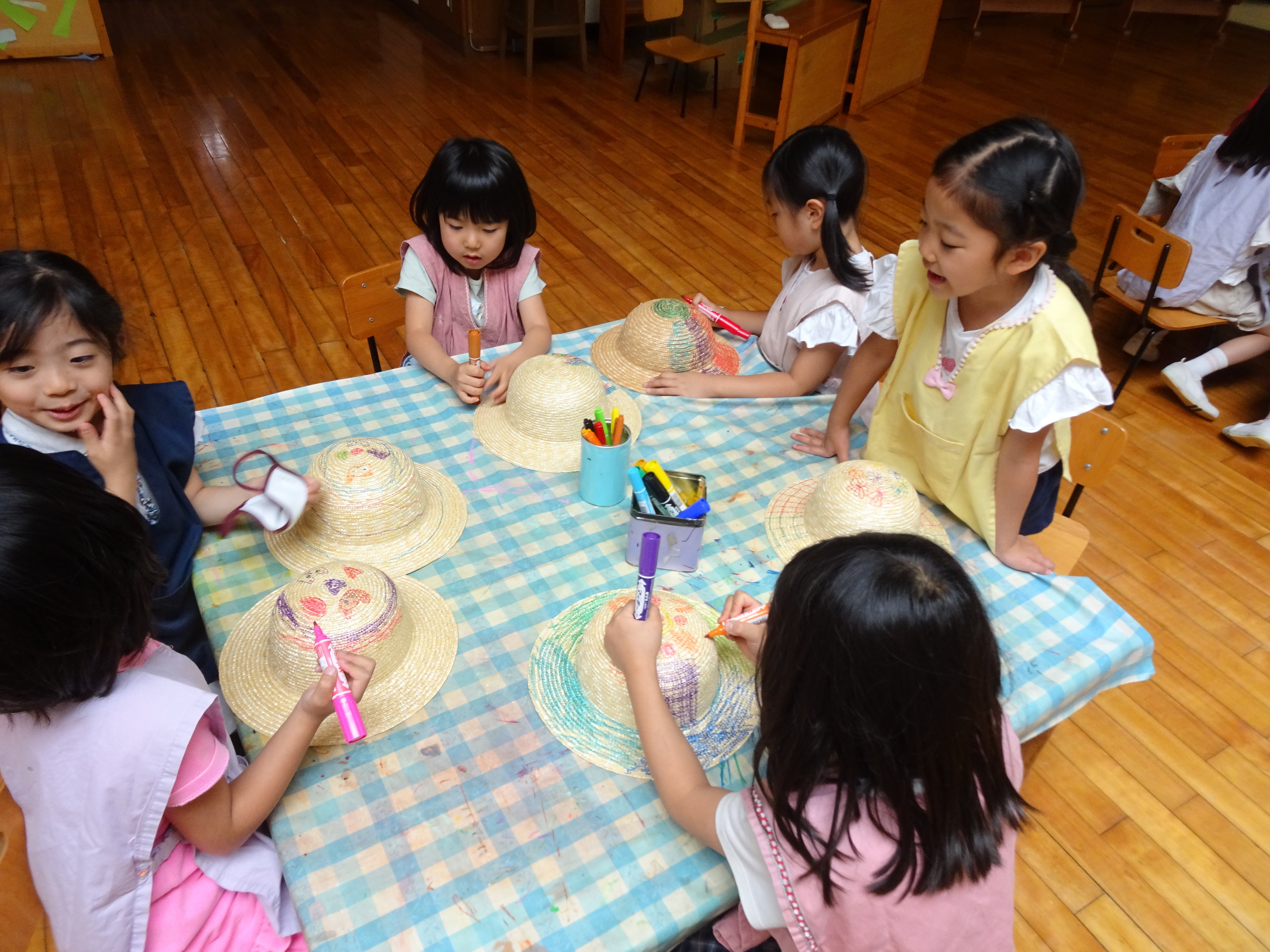 箱の中身は麦わら帽子!みんなの分があるようです さっそく思い思いに色を付けて世界に一つだけの帽子を作り