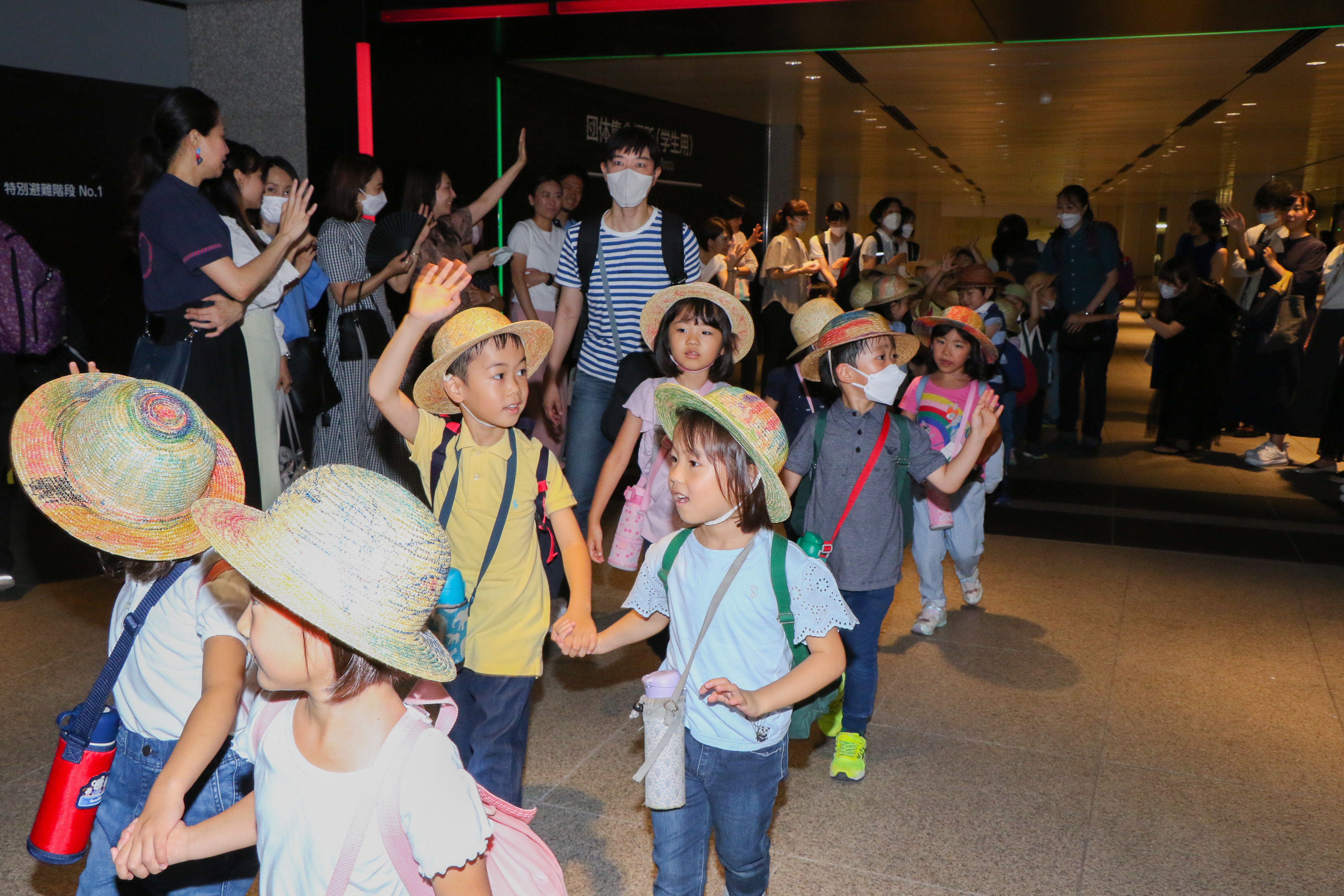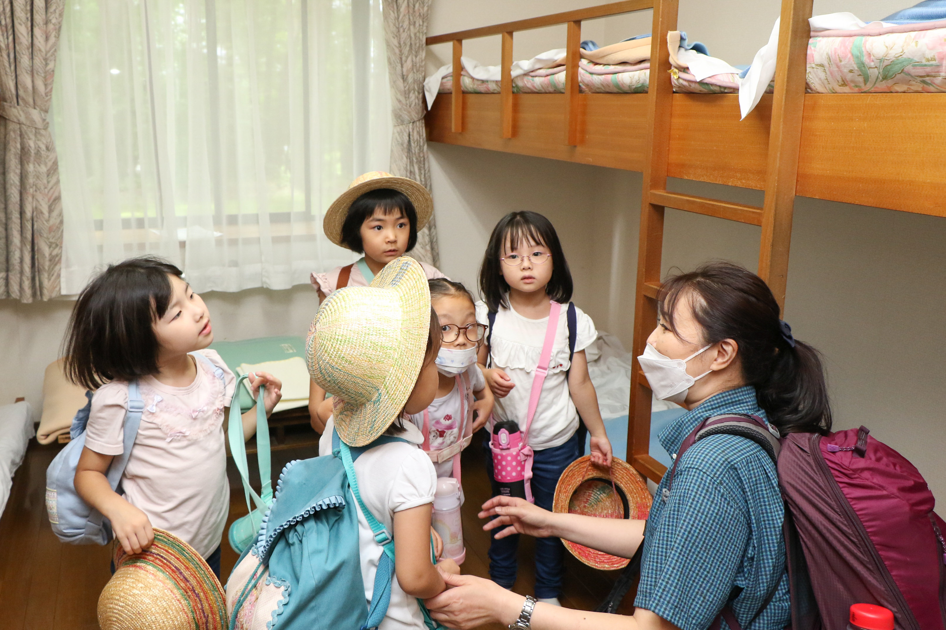 グループに分かれて一緒に過ごす先生から寮での過ごし方を教えてもらいます