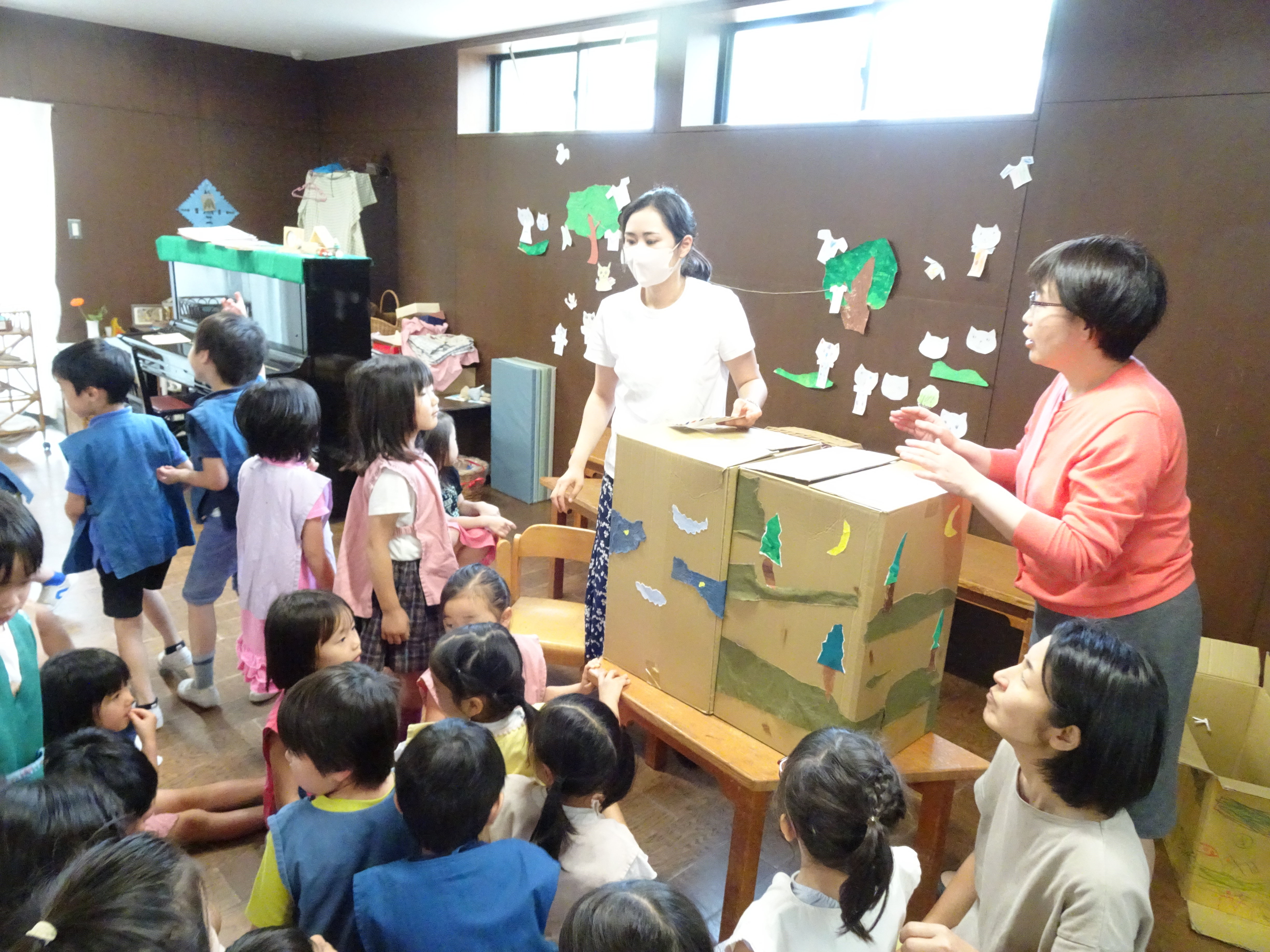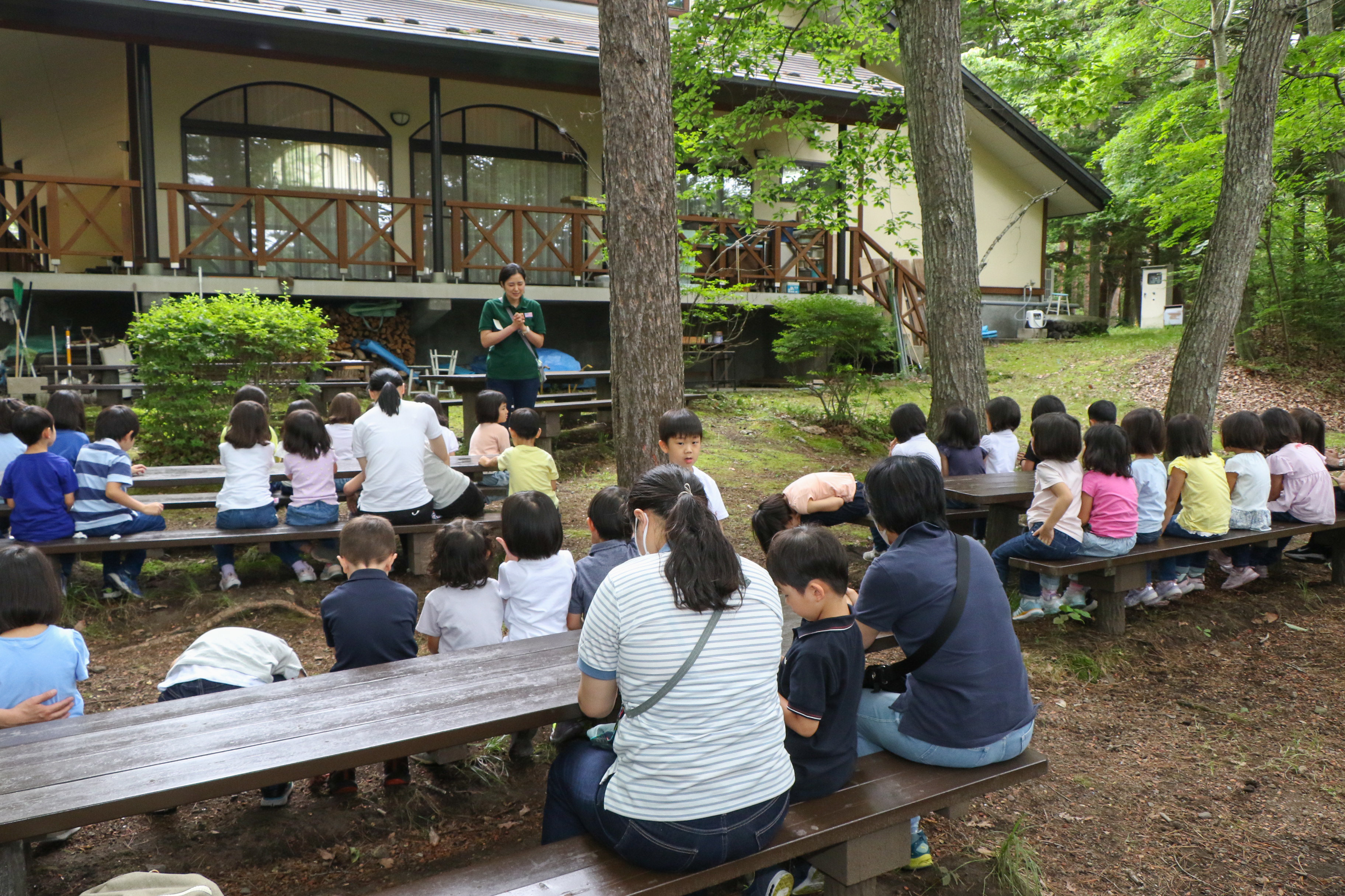 気持ちのよい庭でさんびかを歌い、お祈りをしました ♪もりもおやまも、おひさまも おつくりなさったかみさま♪
