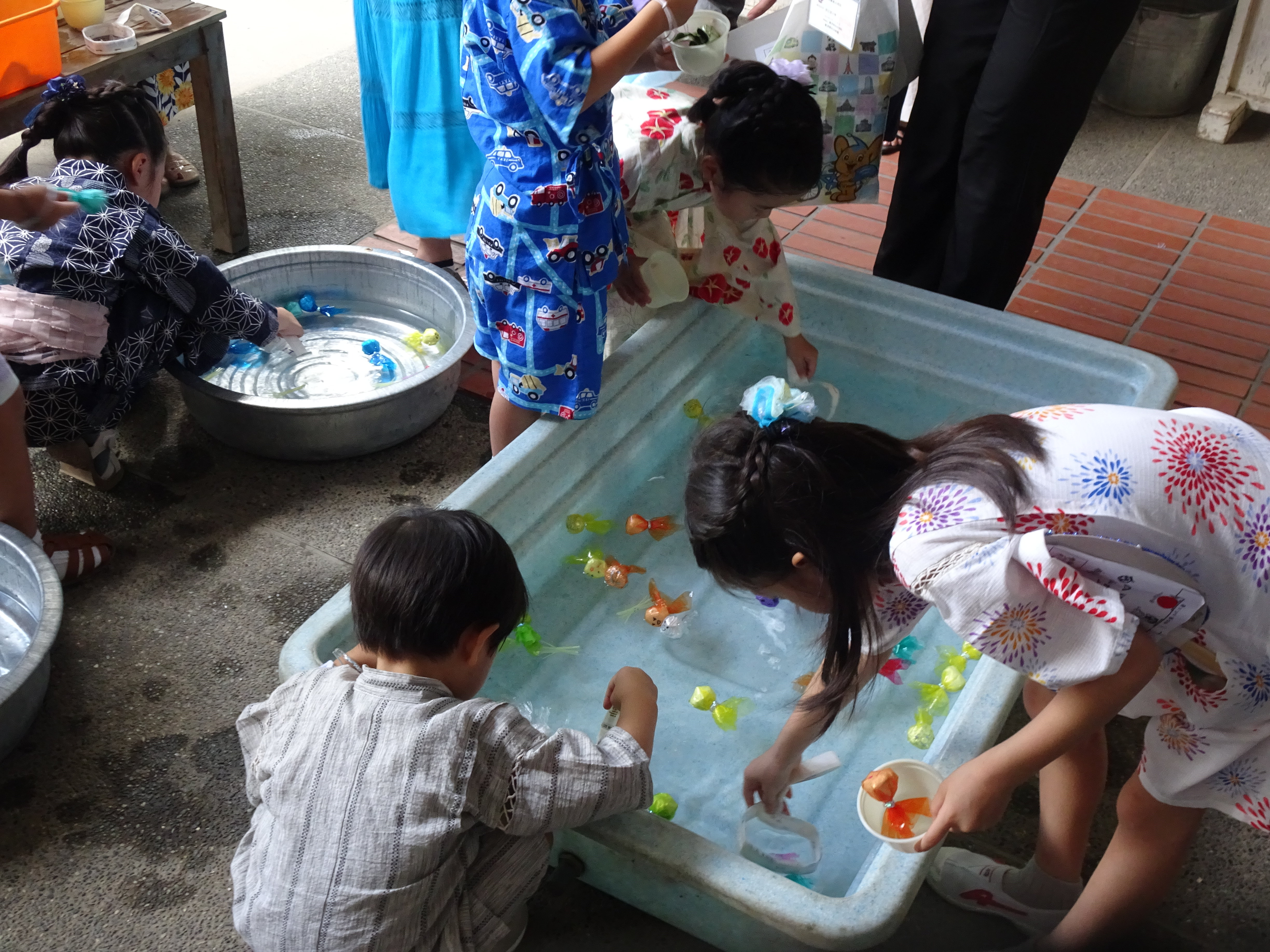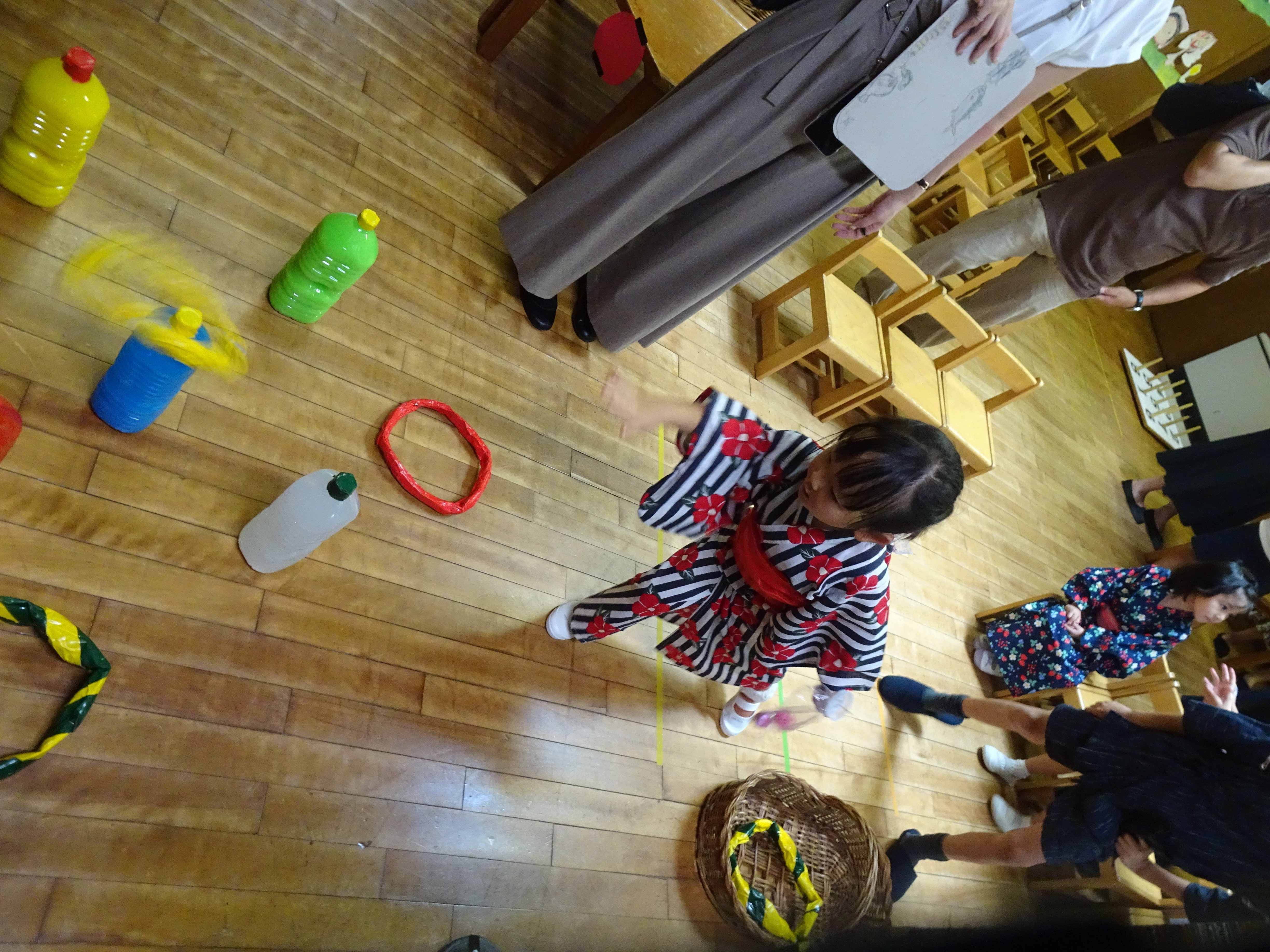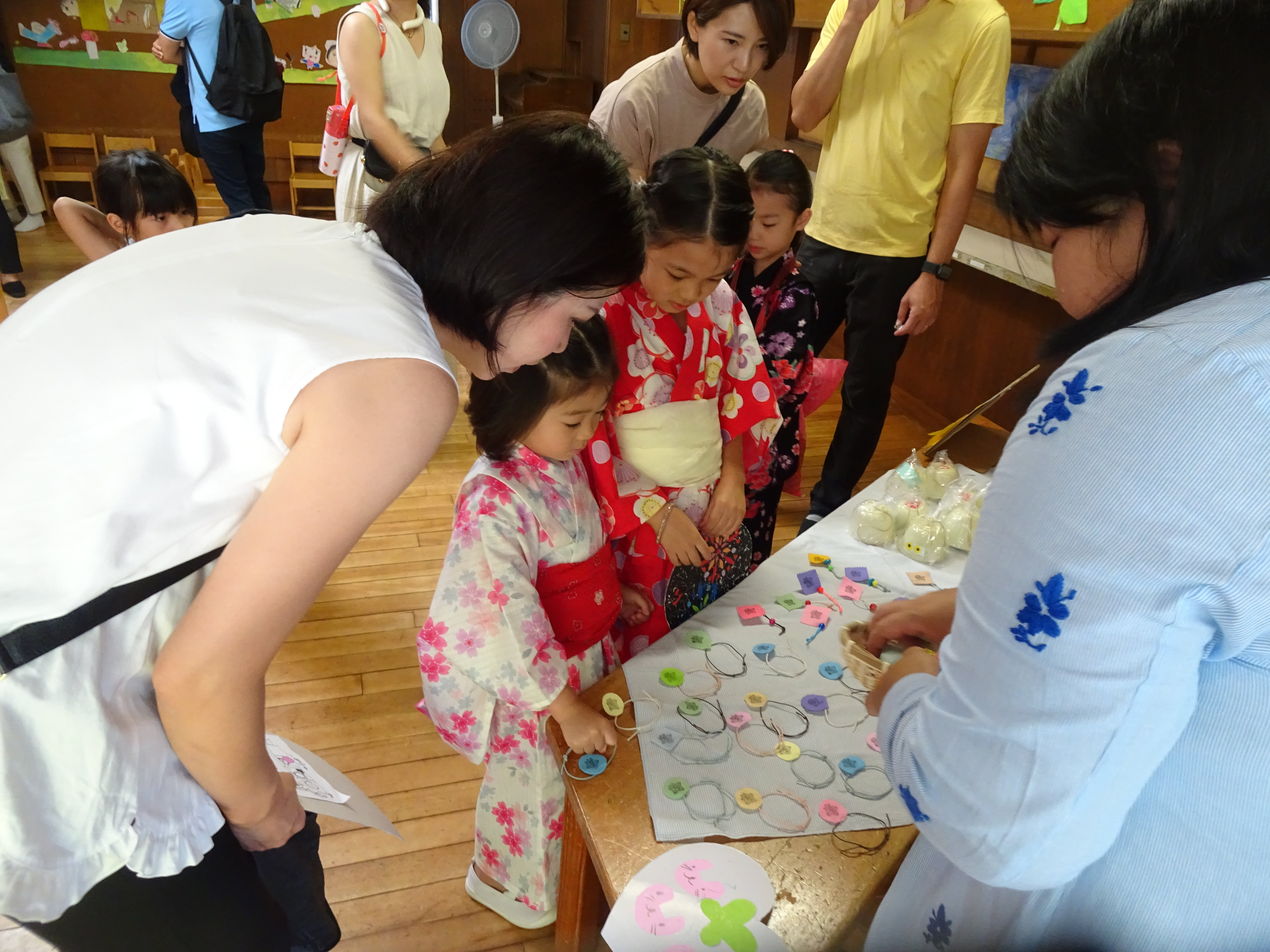 東洋英和幼稚園だより かえで夏まつり 夏休みが終わりに近づいたある日、久しぶりに幼稚園がにぎやかな声に包まれました ホールでは三味線の音色に合わせて「英和音頭」を 踊りました 保護者の方の創意工夫のつまったコーナーを家族で まわります 金魚すくいや輪投げ、ボール投げを楽しみ たくさん並んだ手作りの景品の中から、お気に入りの 一つを選びました 裏庭はお化け屋敷です いつも遊んでいるヒューム管のお化けが大きな口を開けて待っています 暑い日にいただくかき氷は格別です もう少しすると幼稚園が始まります 楽しみに待っていますね 前へ 一覧へ戻る 次へ