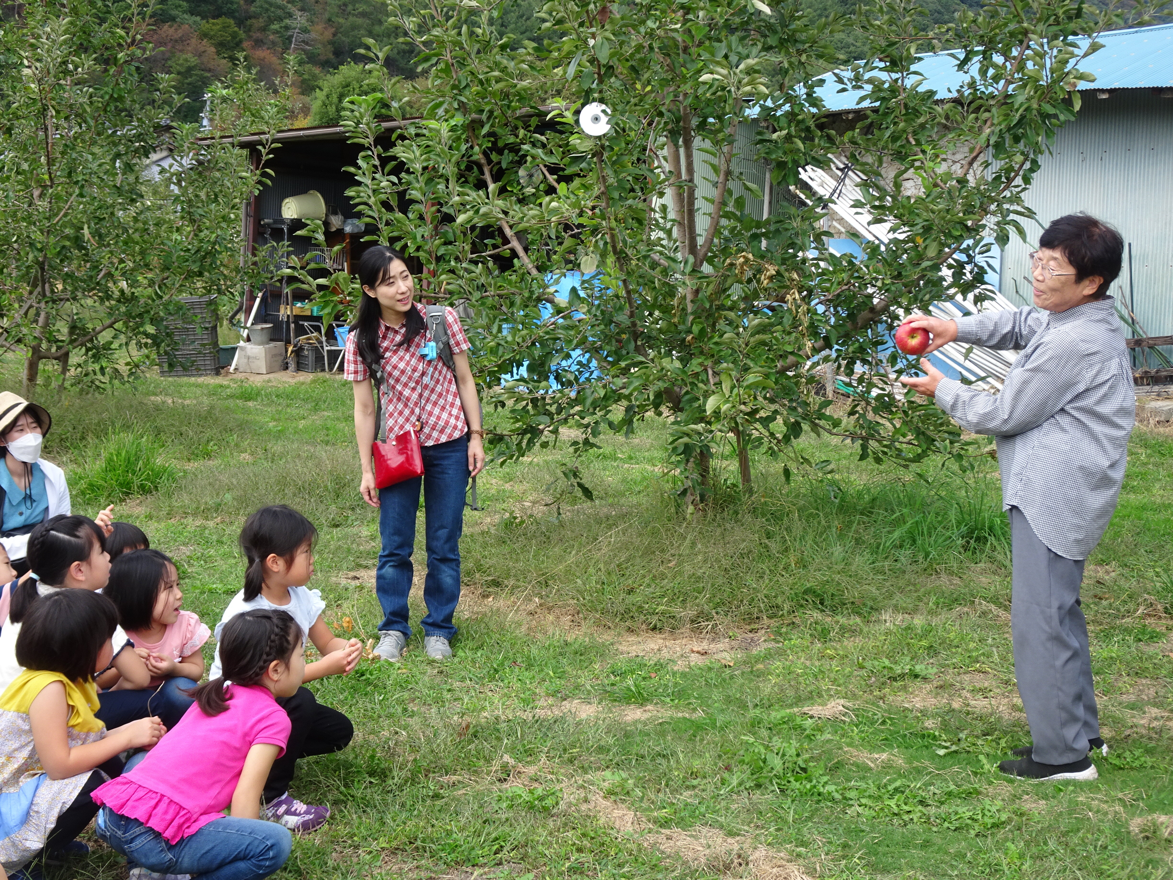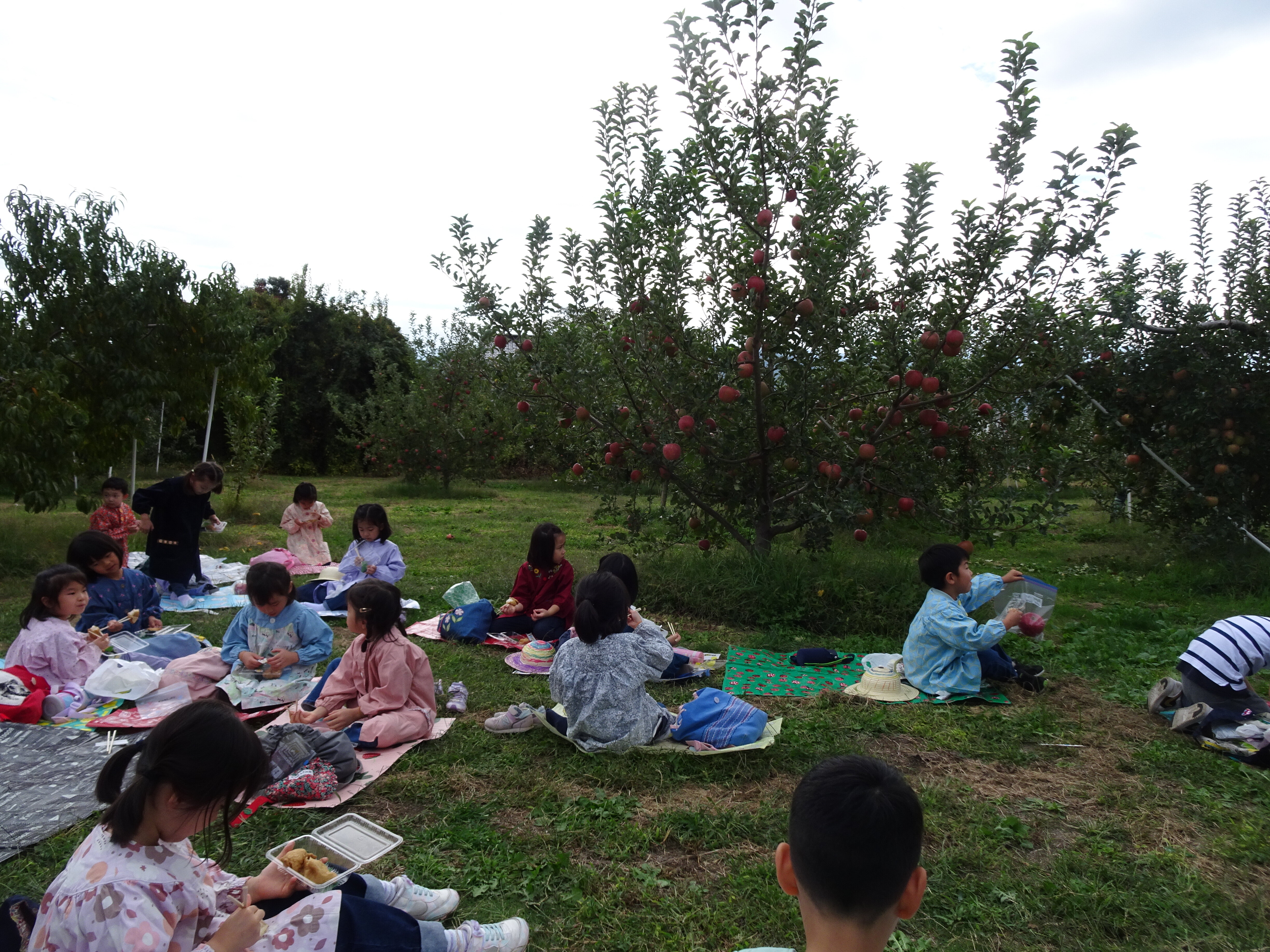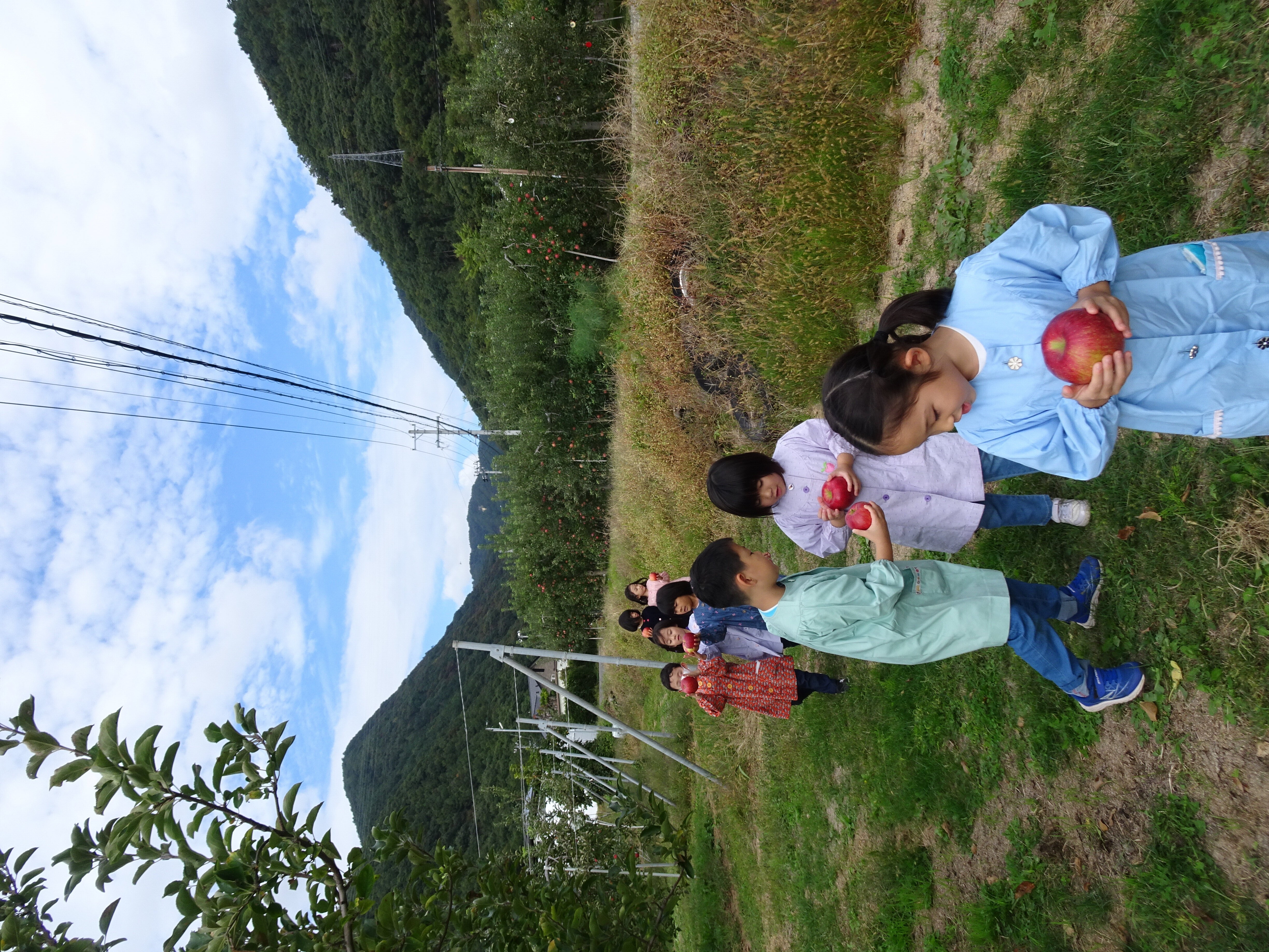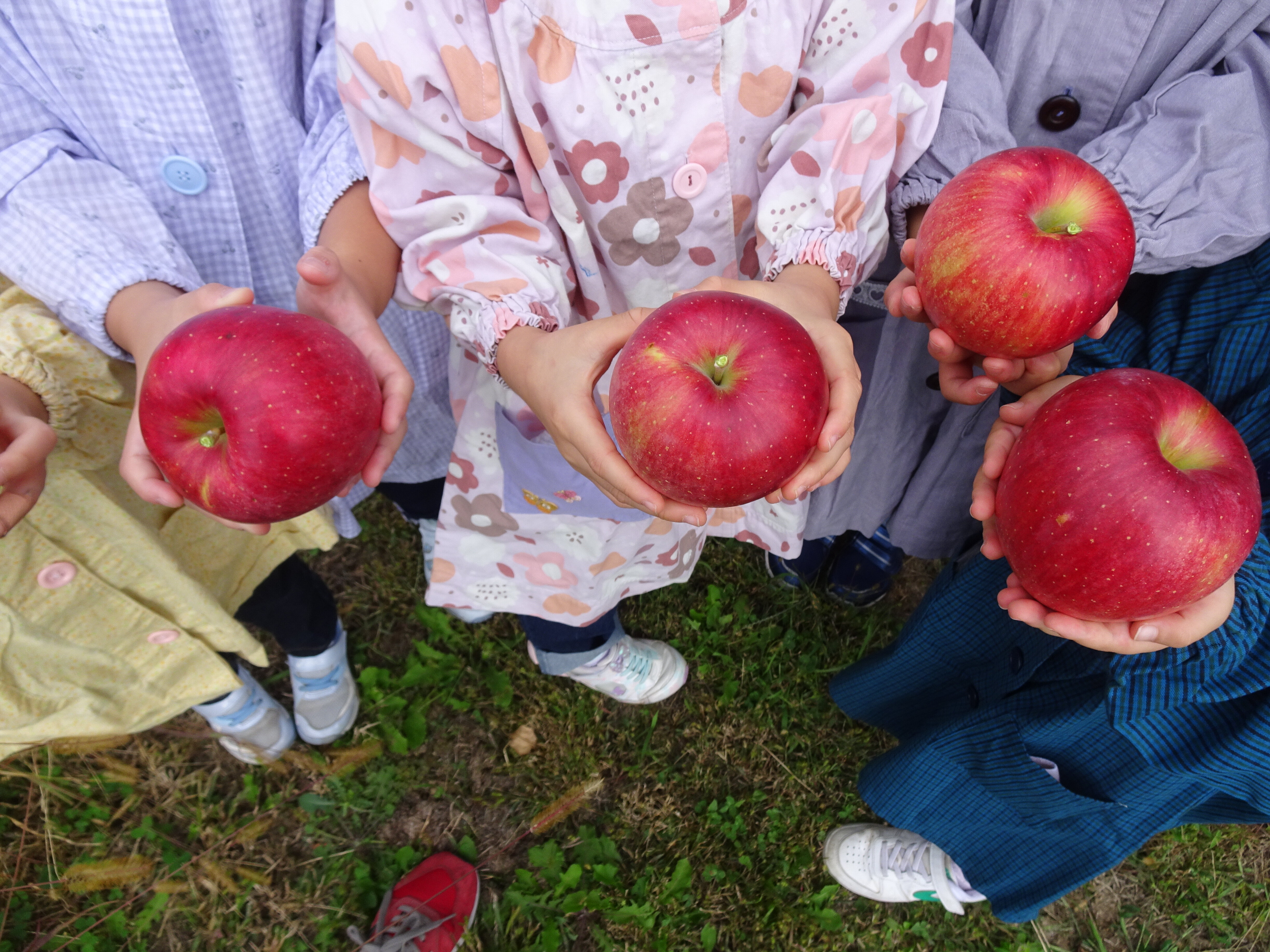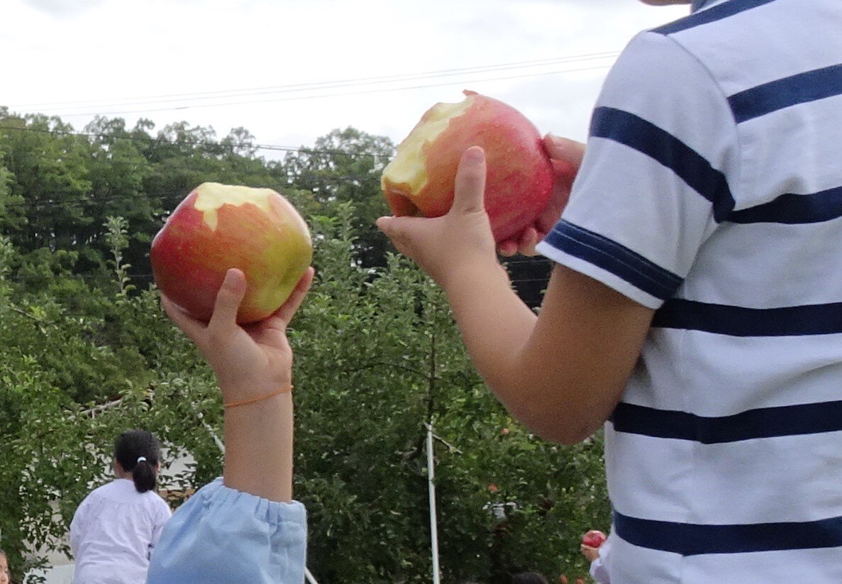 東洋英和幼稚園だより りんご園へ 年長組 年長組の子どもたちは上田にあるりんご園に出かけました たくさん実ったりんごの木を見つけて大喜びです りんご園のおばさまに りんごのもぎ方や育て方を教えていただきました 1人ひとつずつ お気に入りのりんごをもぎました どれもおいしそうです りんご園の中でシートを広げて海苔巻きのお昼をいただきました 食後のデザートは りんごの丸かじりです 最初にお邪魔した子どもたちはもう50歳を過ぎました いつもおいしいりんごをありがとうございます 前へ 一覧へ戻る 次へ