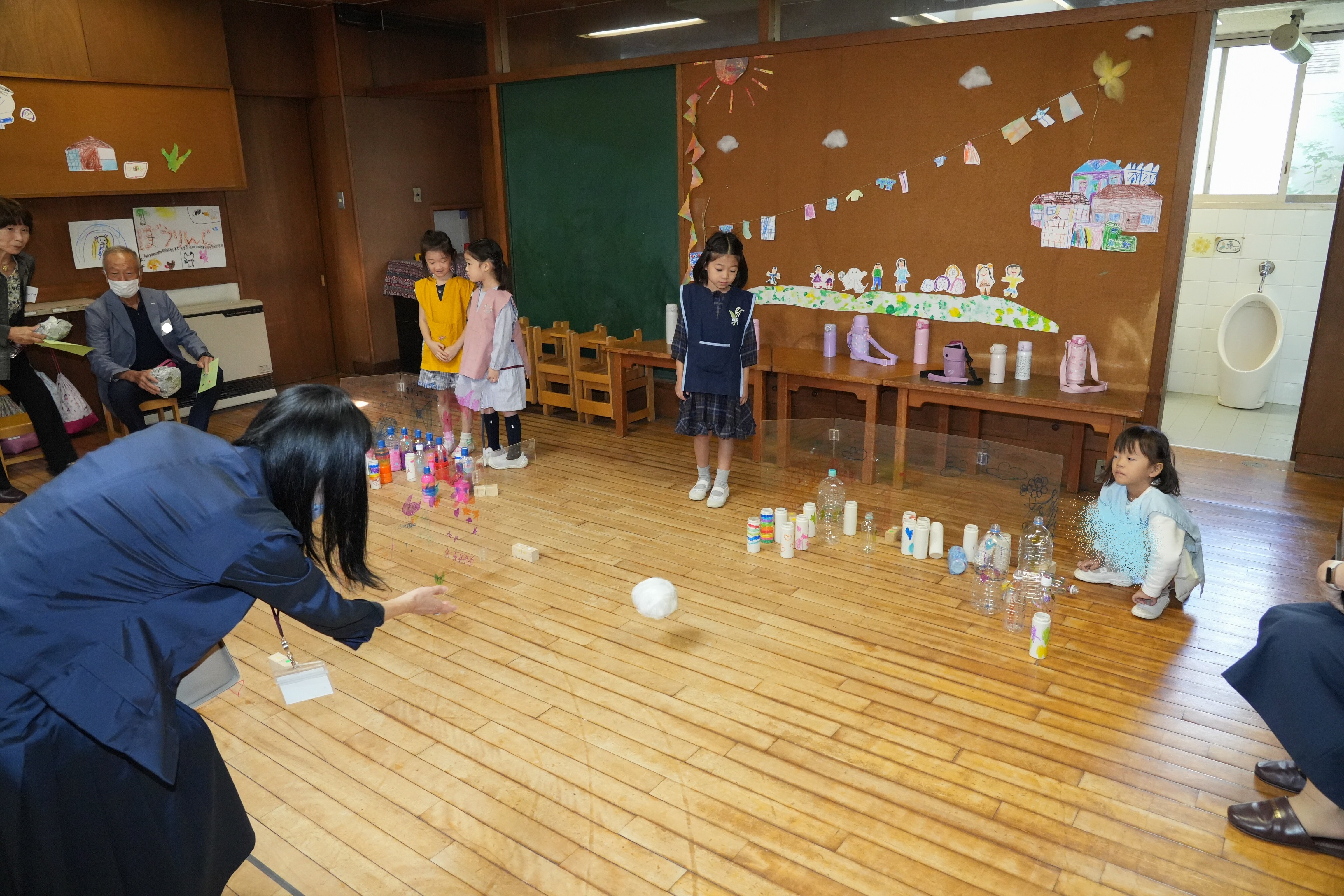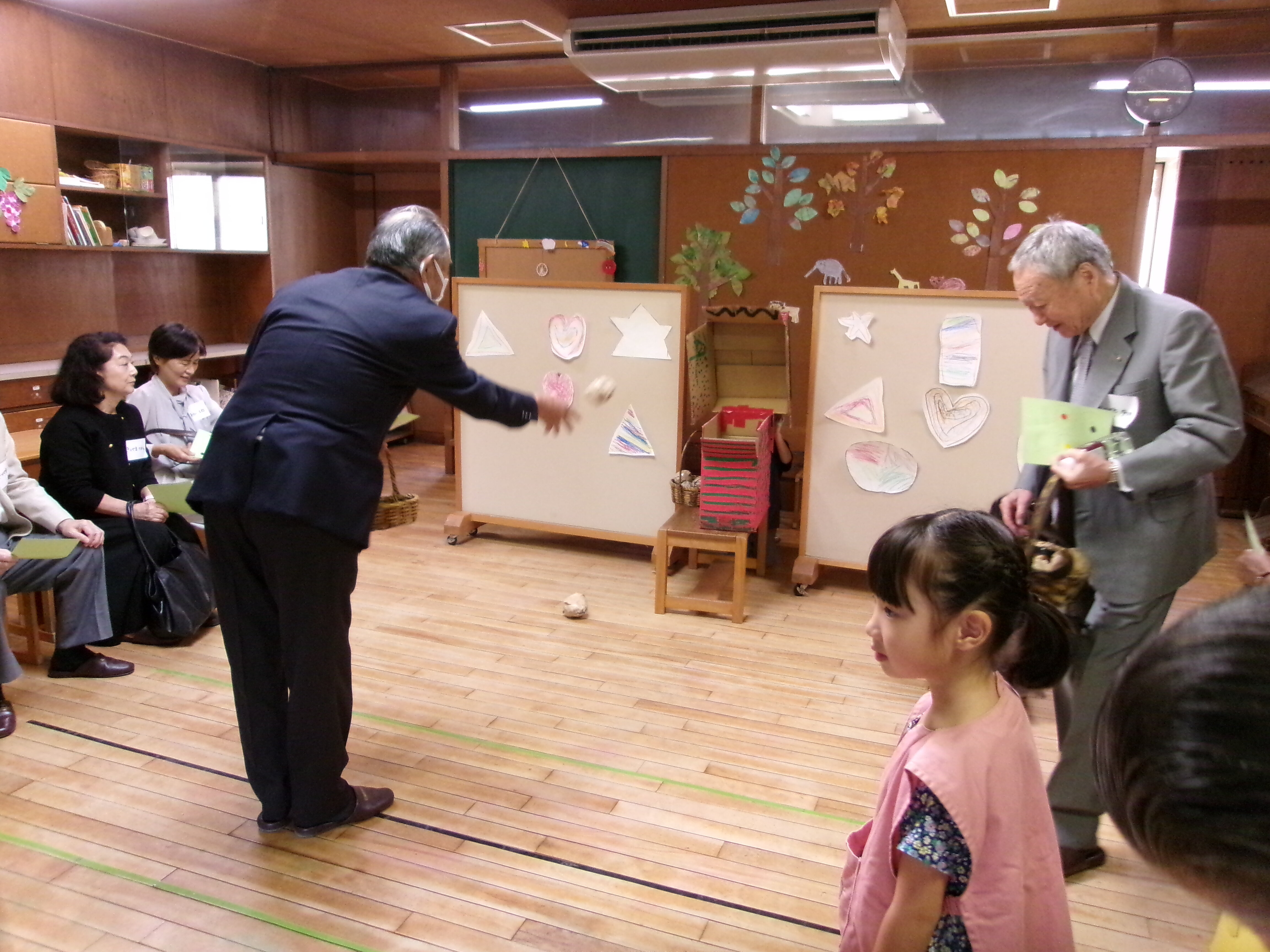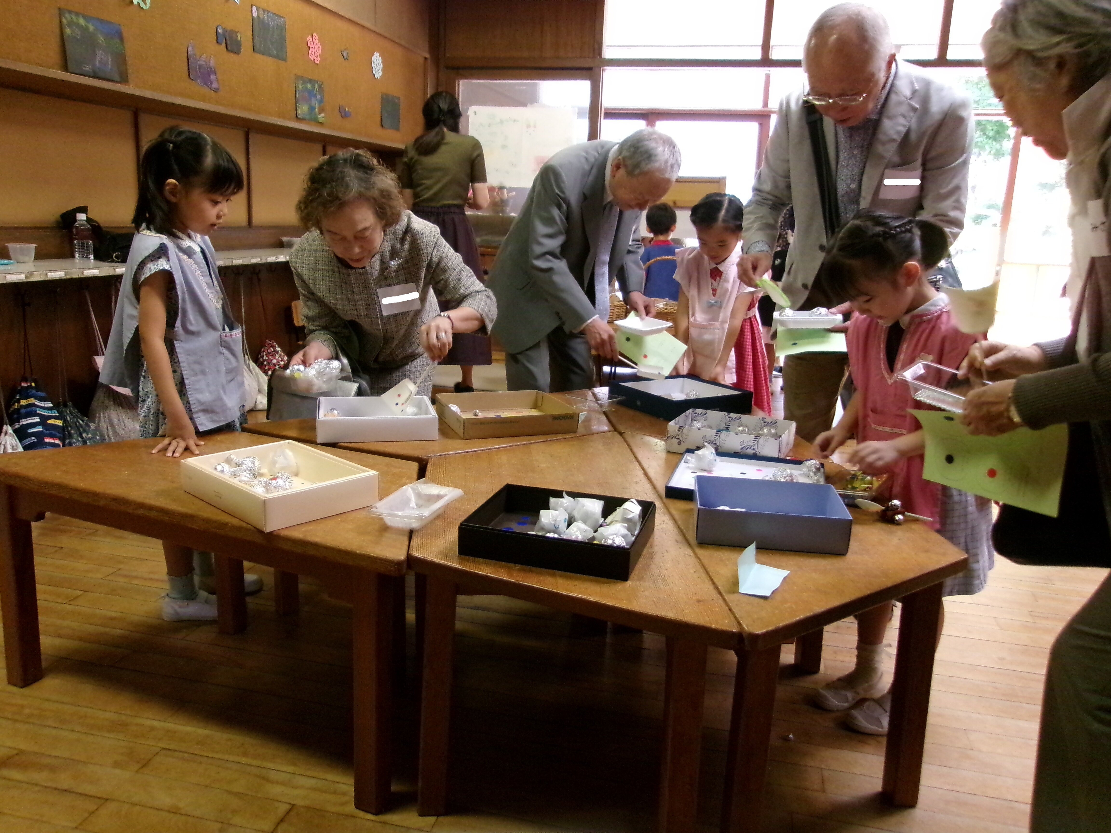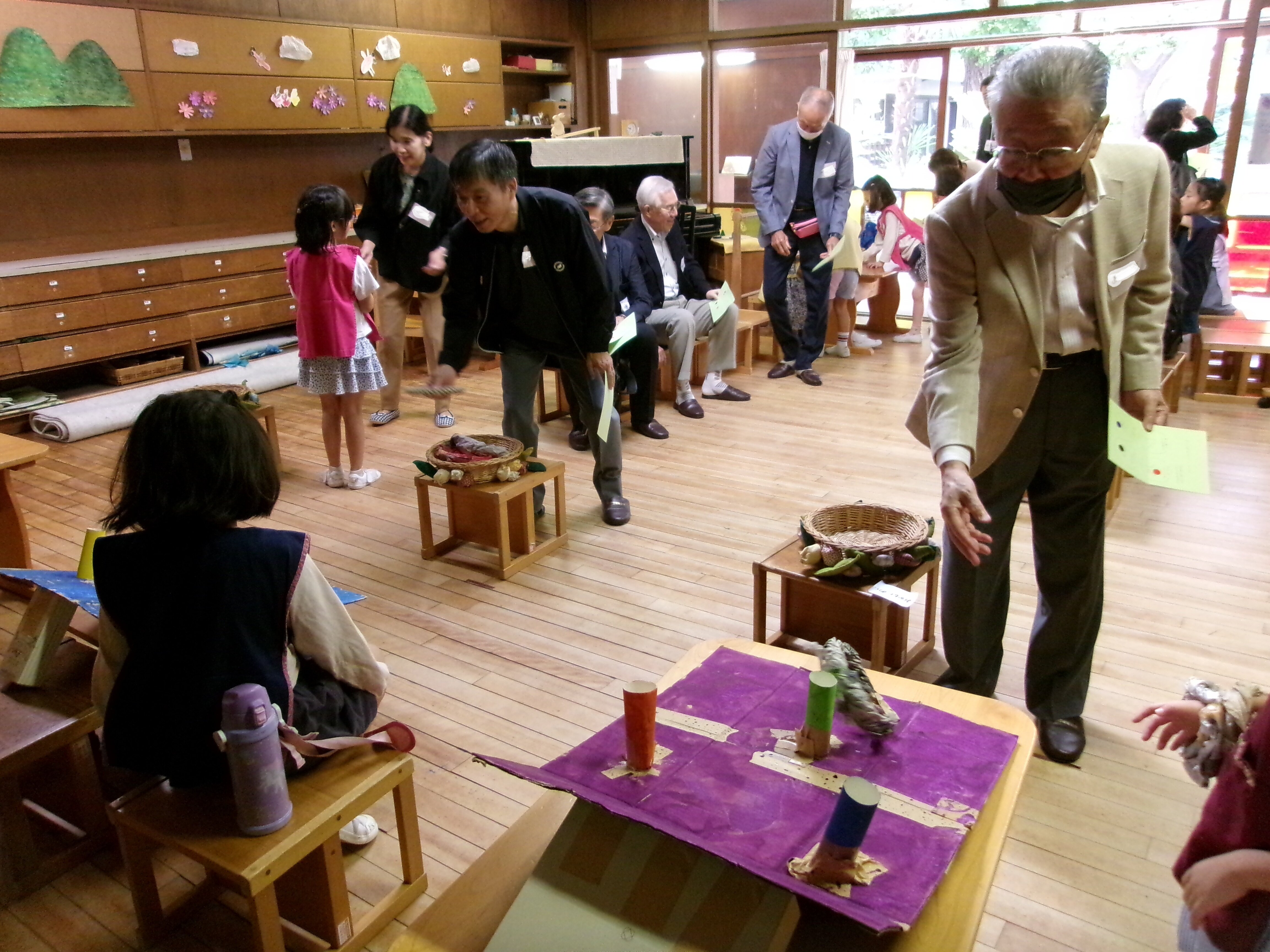 東洋英和幼稚園だより 祖父母の会(年長) おじいさま、おばあさまをお迎えして祖父母の会を開きました 子どもたちが考えた4つの遊びのコーナー 受付も、設置場所も工夫して考えました 夢中になって楽しんでくださるので、子どもたちも忙しくうれしく過ごしました 的あては、時々真ん中の恐竜が口を開けます ボーリングもありました お母さま方も「布の絵本」や「ハンドベル」で、ご一緒におもてなししてくださいました いつもお支えくださるおじいさま、おばあさまに感謝の気持ちをこめて、みんなでお迎えした一日でした 前へ 一覧へ戻る 次へ