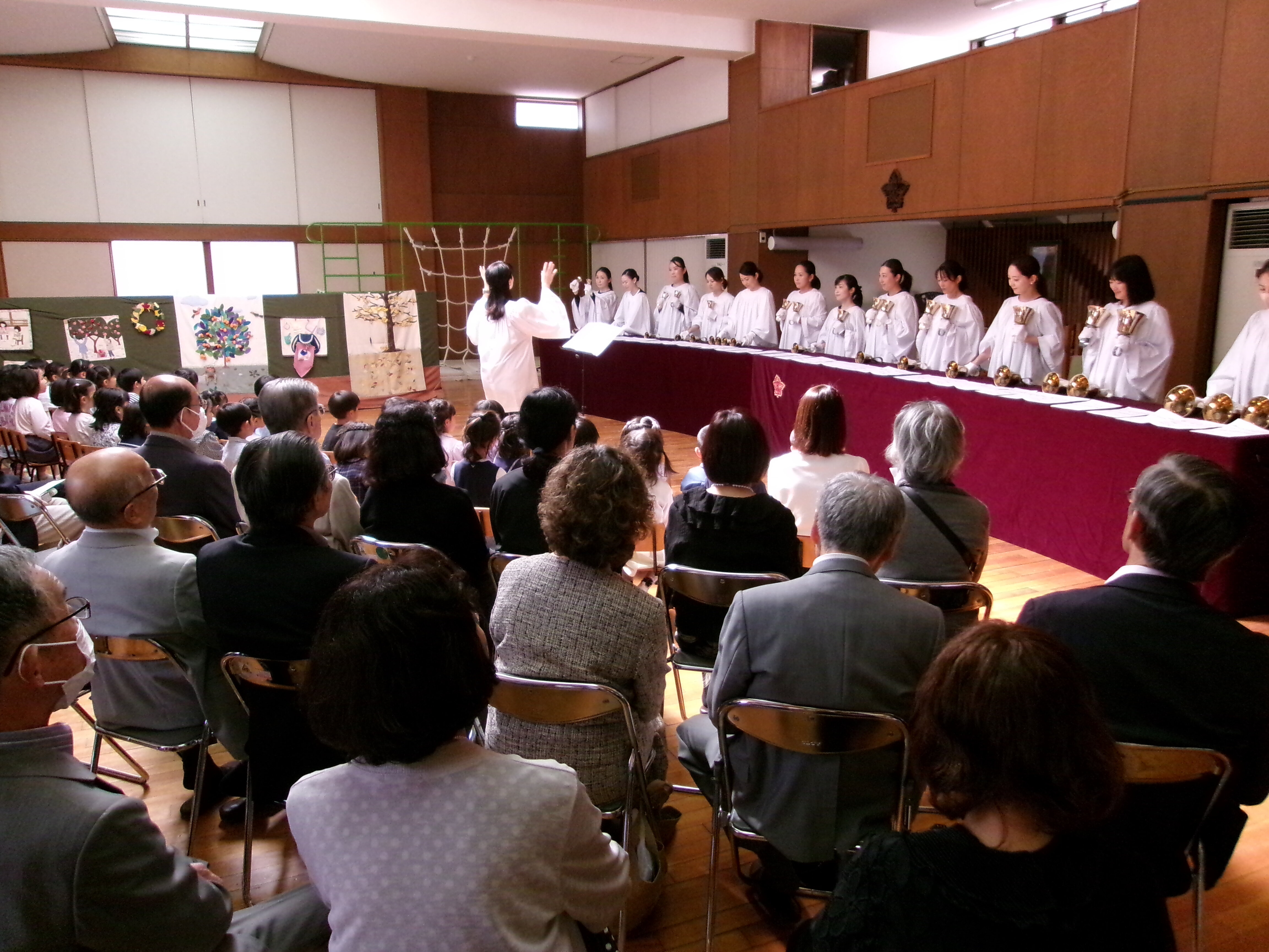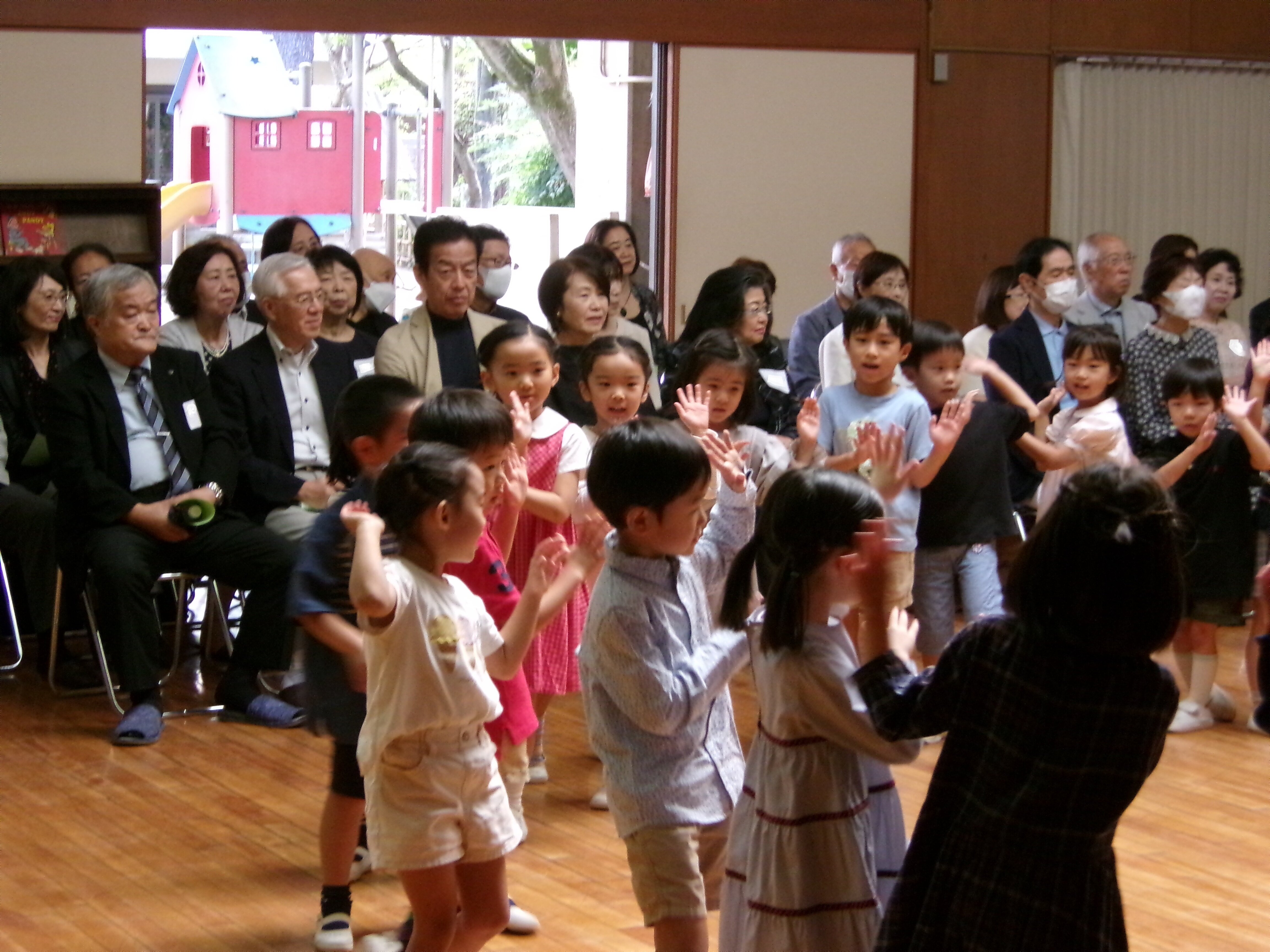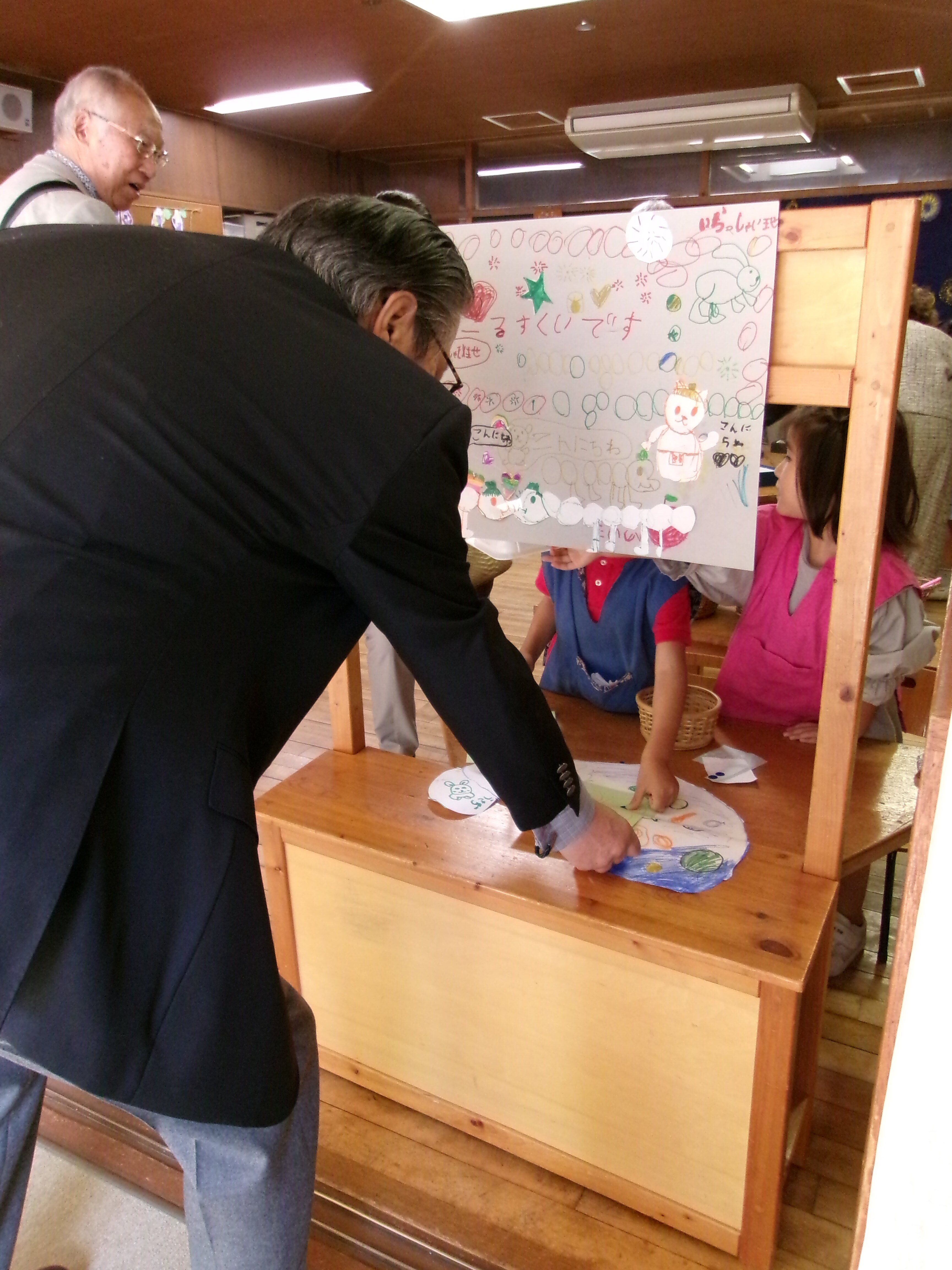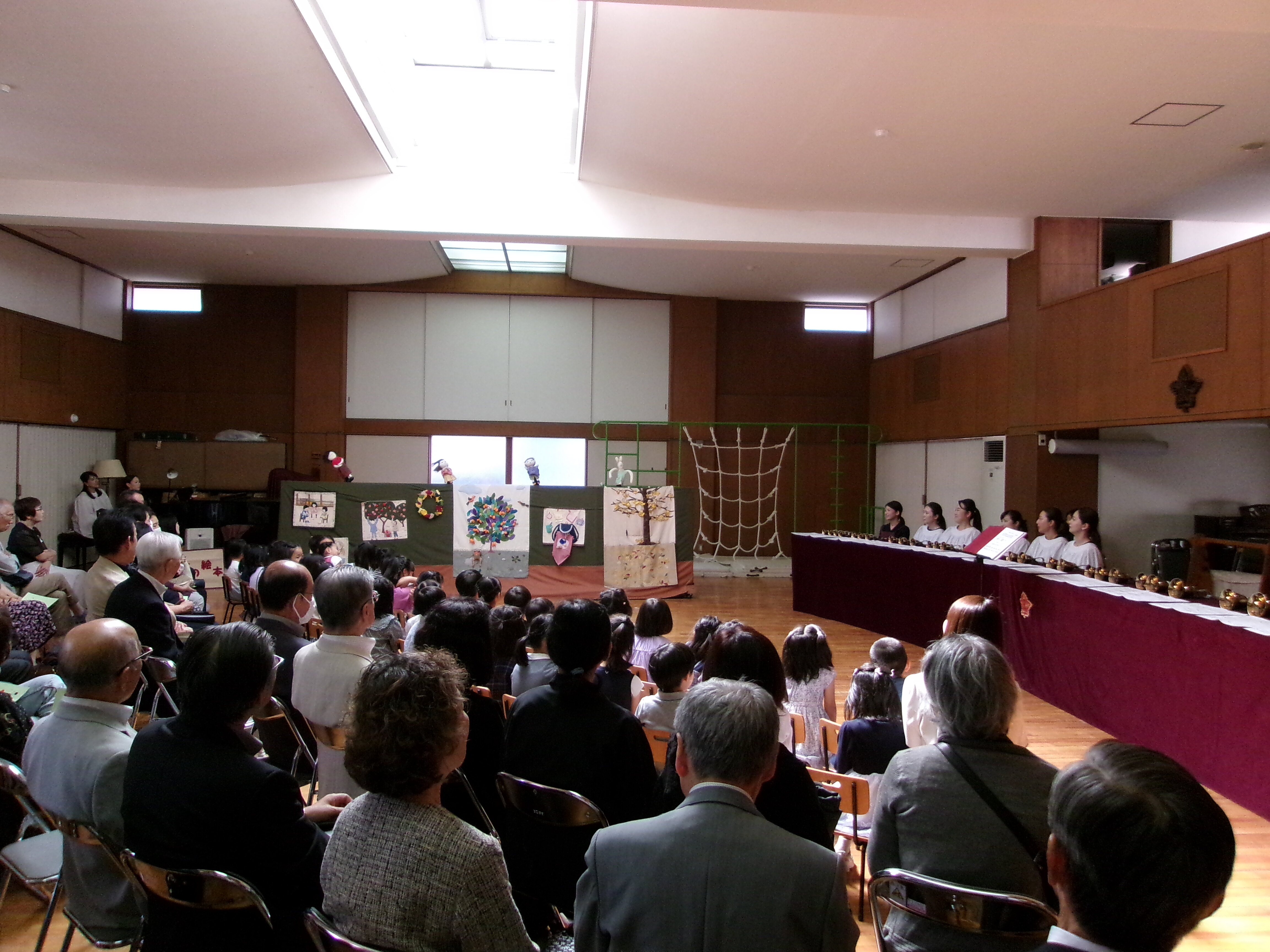 東洋英和幼稚園だより 祖父母の会(年長) おじいさま、おばあさまをお迎えして祖父母の会を開きました 子どもたちが考えた4つの遊びのコーナー 受付も、設置場所も工夫して考えました 夢中になって楽しんでくださるので、子どもたちも忙しくうれしく過ごしました 的あては、時々真ん中の恐竜が口を開けます ボーリングもありました お母さま方も「布の絵本」や「ハンドベル」で、ご一緒におもてなししてくださいました いつもお支えくださるおじいさま、おばあさまに感謝の気持ちをこめて、みんなでお迎えした一日でした 前へ 一覧へ戻る 次へ
