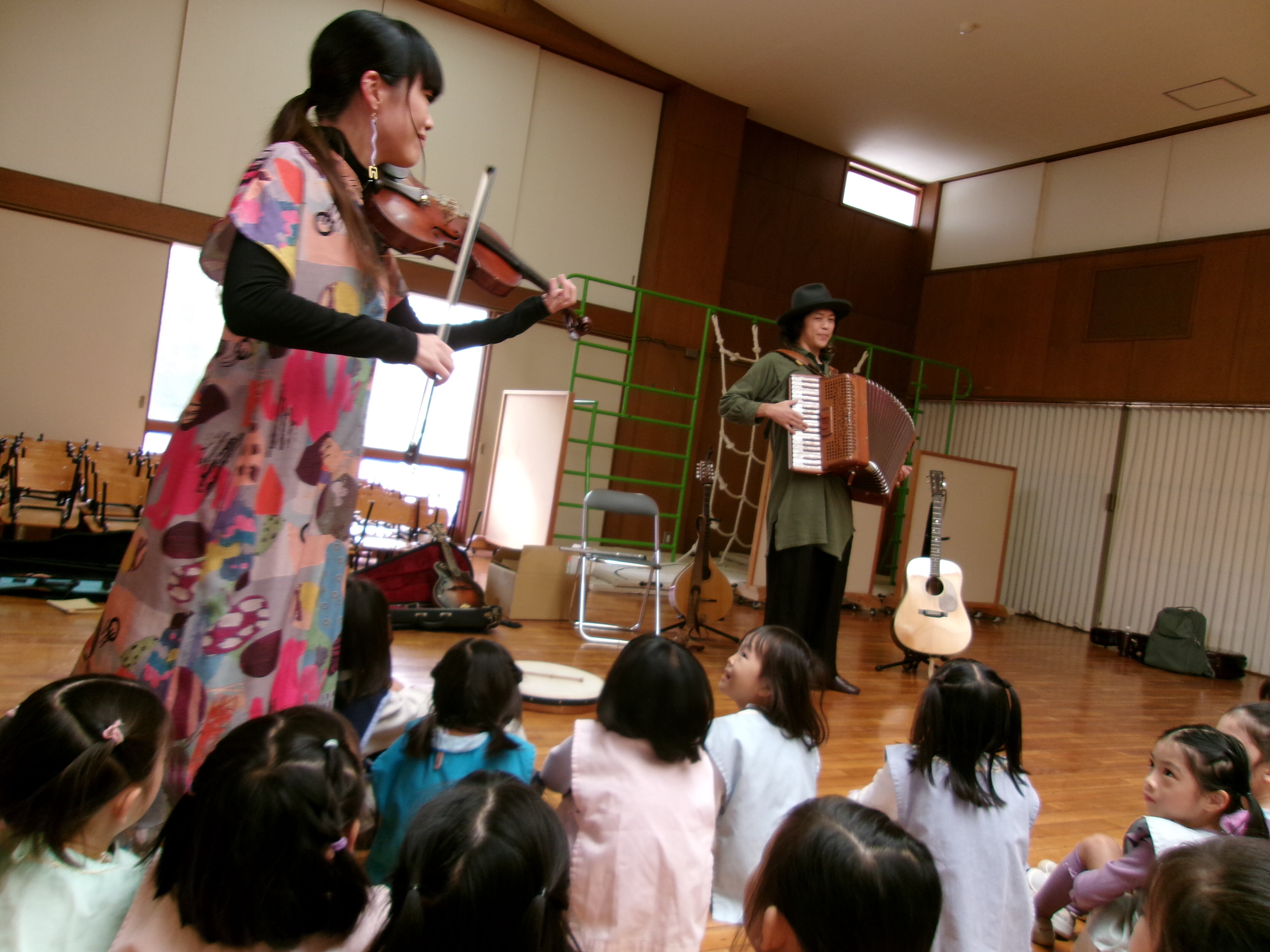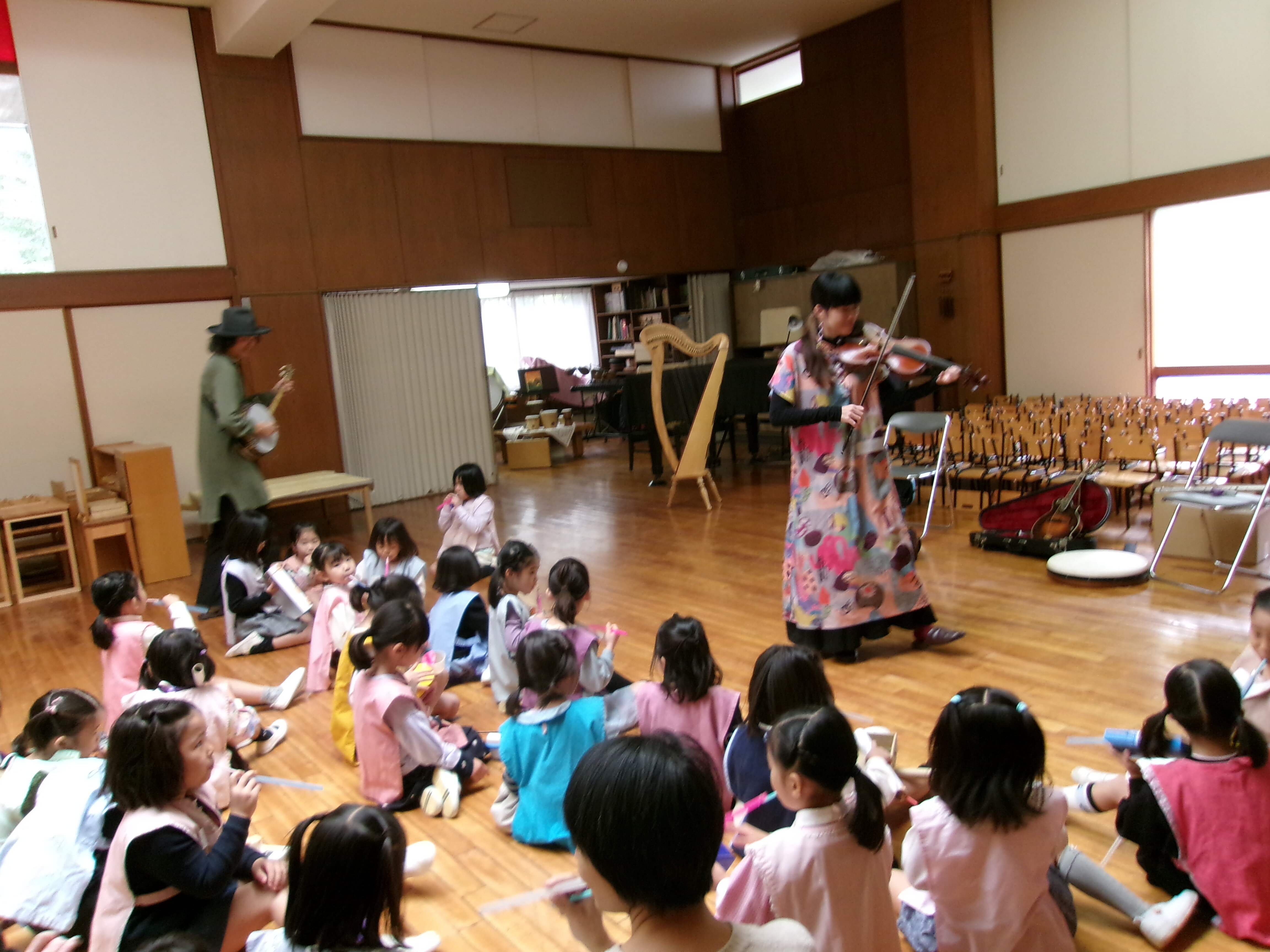 東洋英和幼稚園だより ふれあいアート(年長) 音楽が大好きなお二人が、いろんな楽器と材料をもって遊びに来てくださいました 風船を使って…面白い音がします こちらは笛作り なかなか調整が難しく、試行錯誤します 最後は自分で作った楽器を手に、みんなで演奏会をしました 前へ 一覧へ戻る 次へ