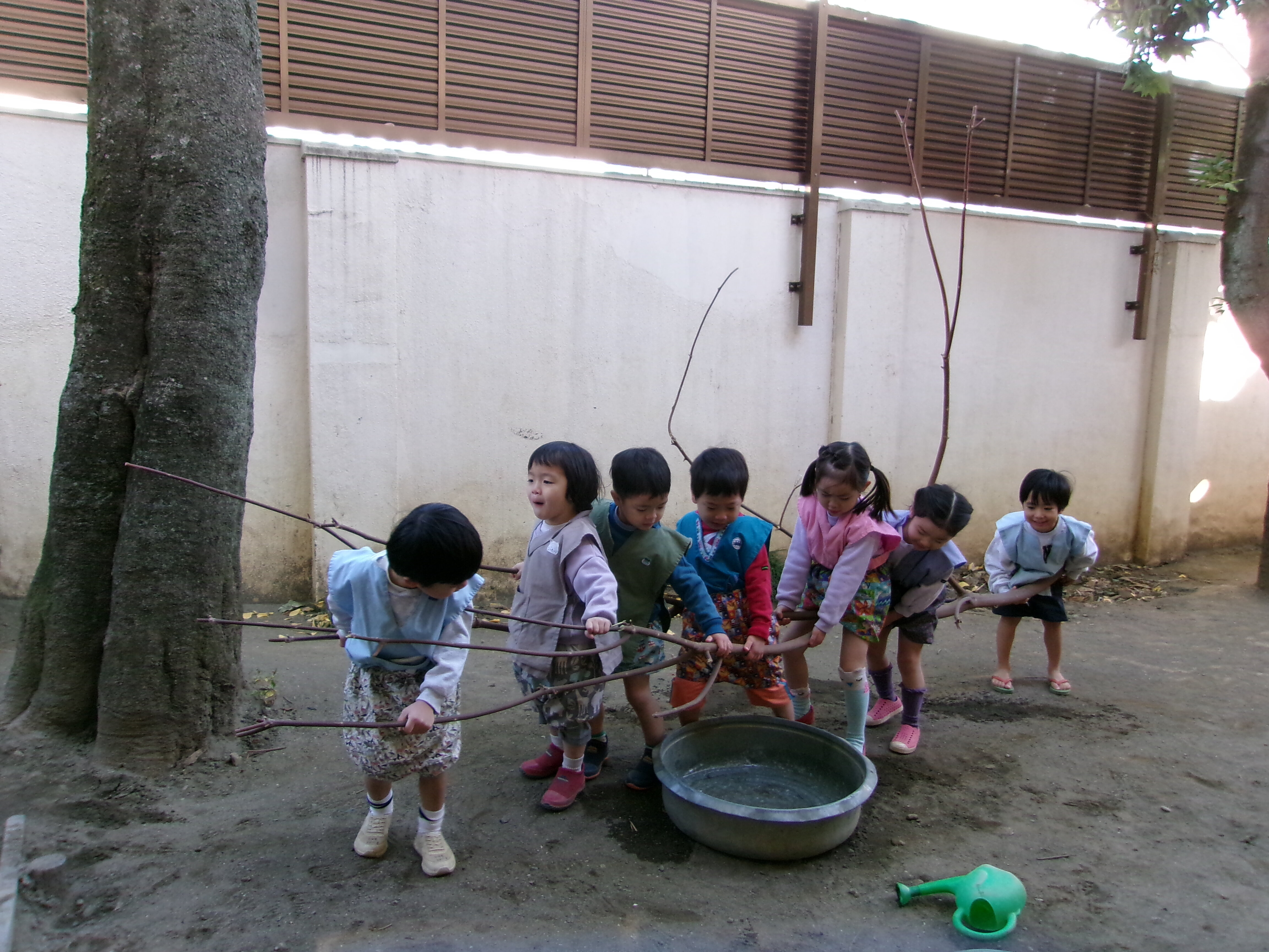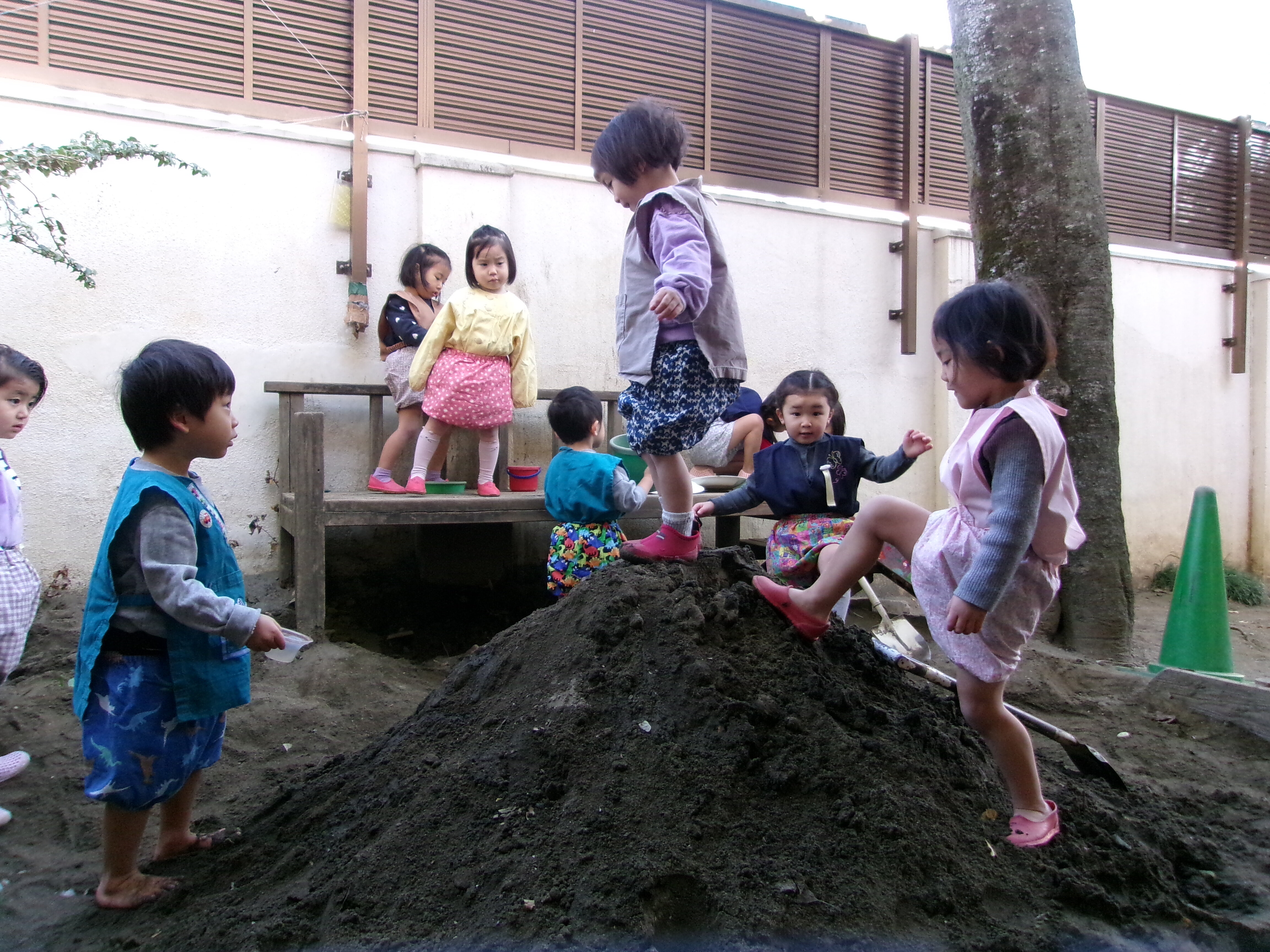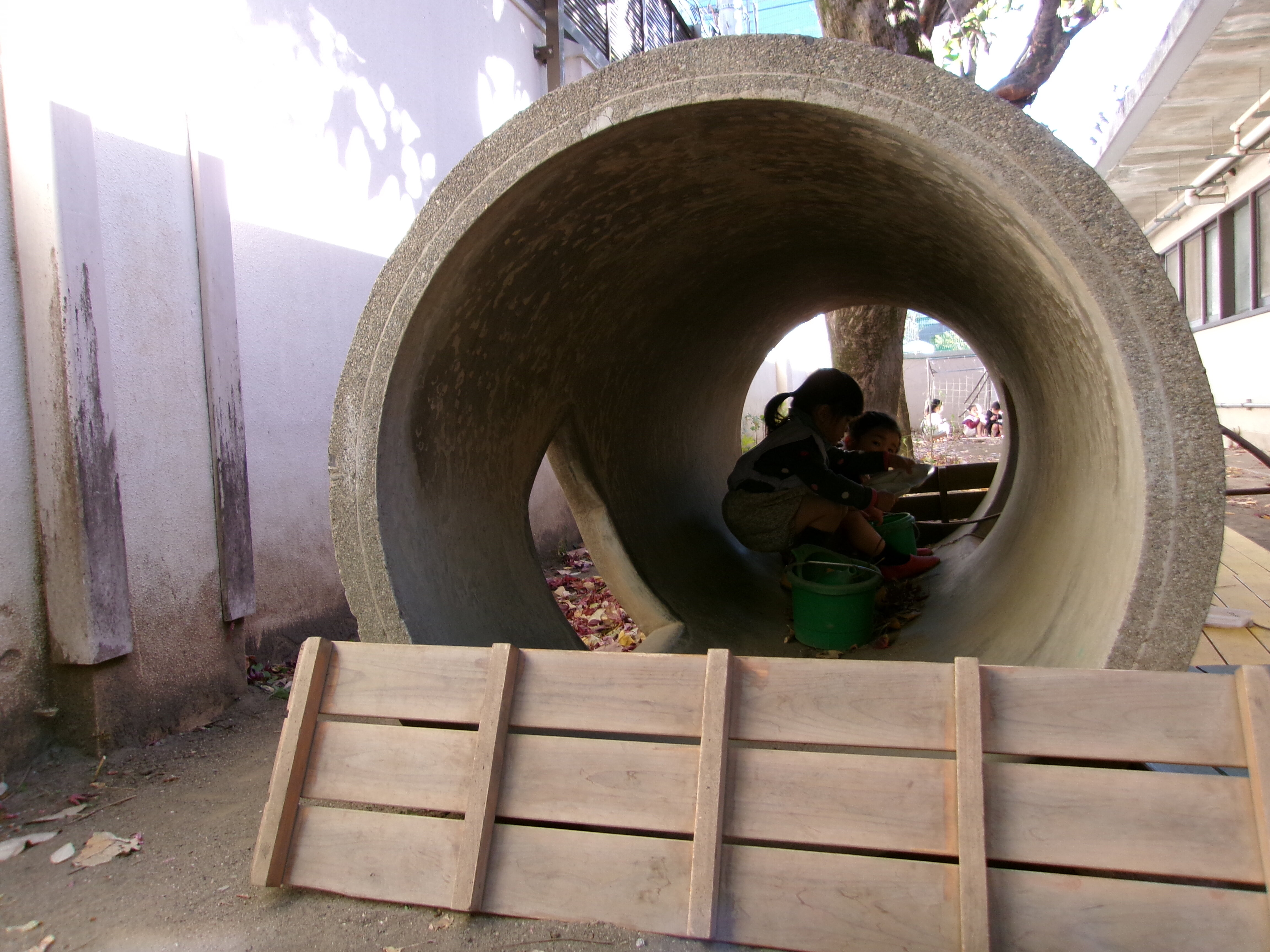 東洋英和幼稚園だより 寒い日でも ヒューム管の中に入り壁を作って むっくりくまさん 目を覚ましたら食べられちゃうぞ♪ あわてて走って逃げます 立派な長い枝をみんなで運んだり 大きな山を作って登ったり下りたり こたつ(板を渡したところに布をかけたもの)に入ってお肉(石)を食べたり 足湯で温まったりしています 前へ 一覧へ戻る 次へ